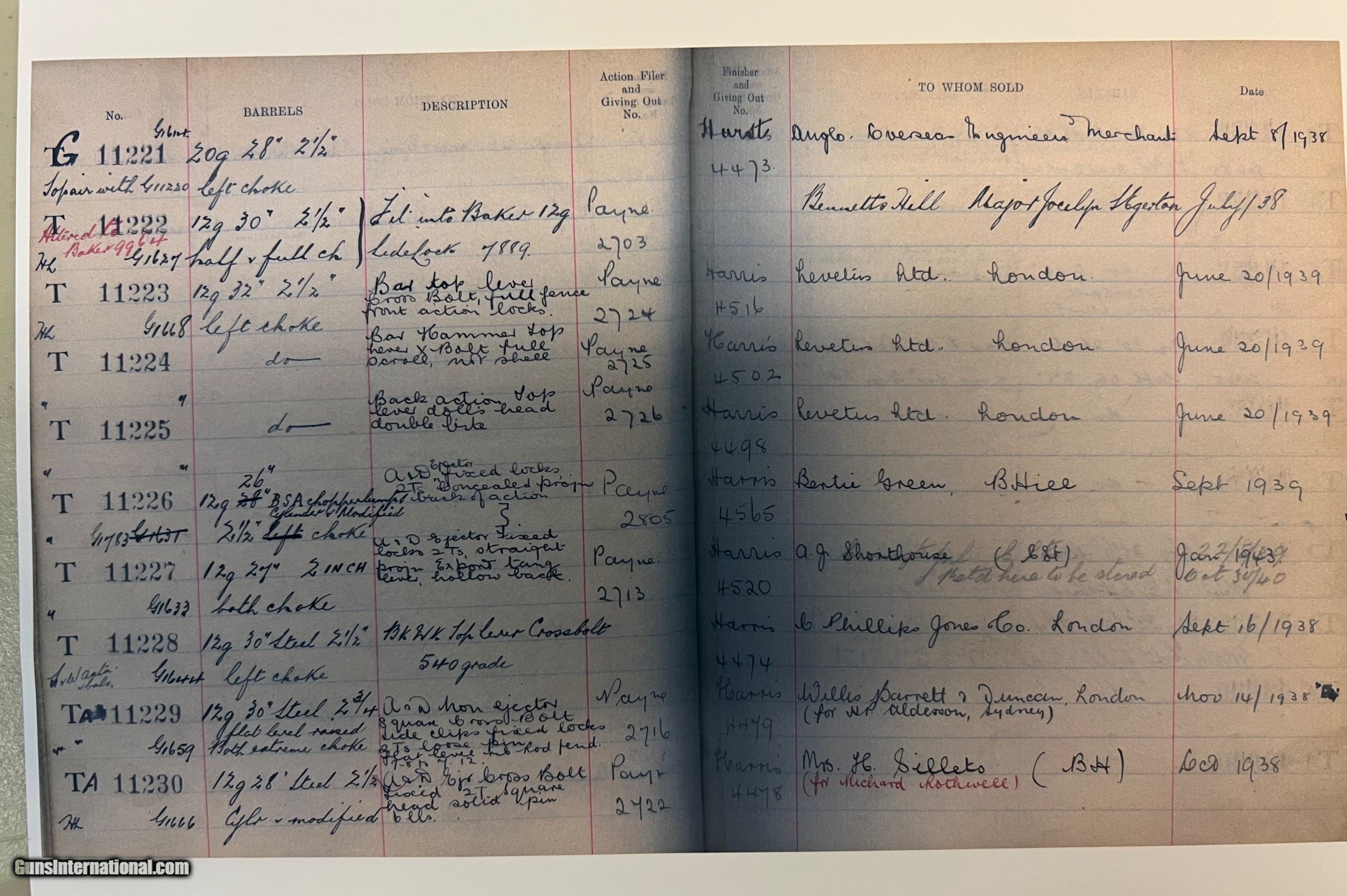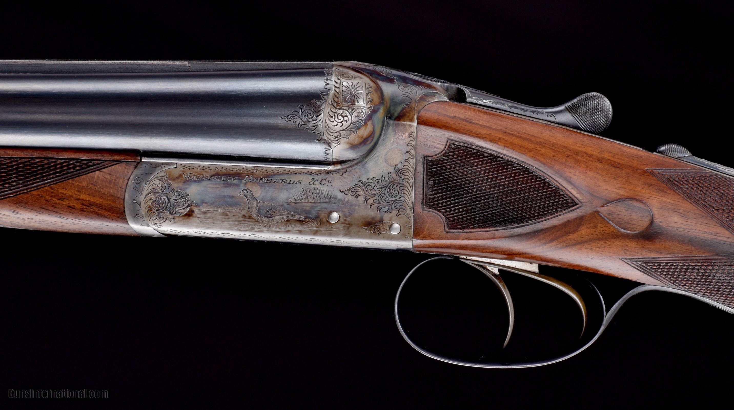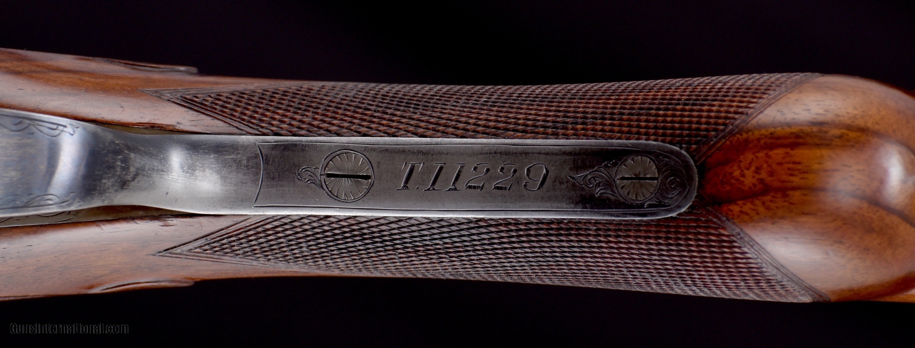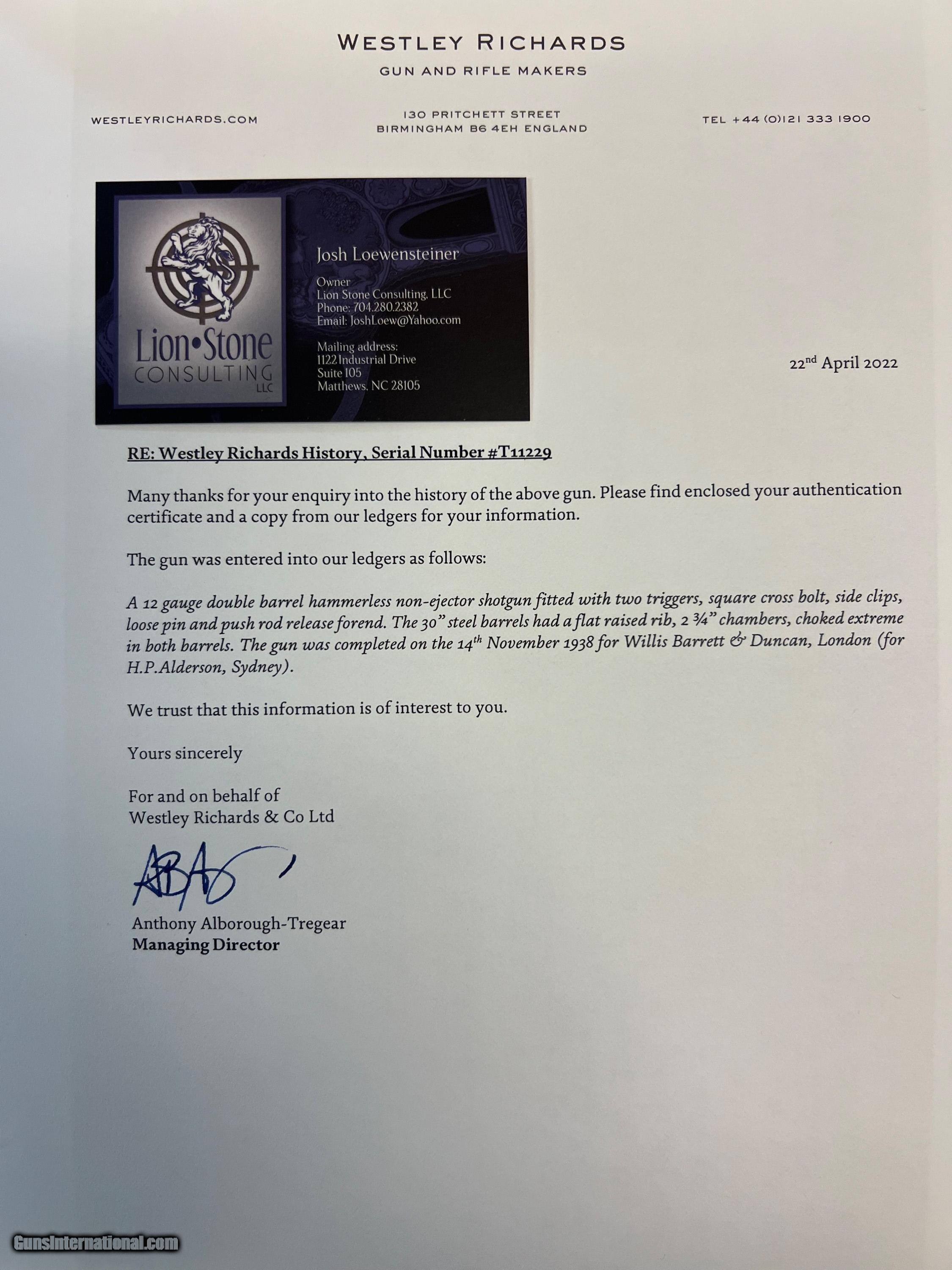 Description: Very rare Westley Richards, this gun made in 1938 for Willis Barrett & Duncan according to the maker's authentication letter. The gun is a beautiful heavy proof pigeon gun made with 30" barrels, splinter forend, double triggers, extractors (my favorite set up!) round knob pistol grip English Walnut buttstock with original lined horn buttplate. Proved for 2-3/4" chambers and 1-1/4oz loads and made with slightly raised rib. Gun is beautifully engraved en-suite with pigeon motif and scroll. Housed in a modern green cavnas and leather case and comes with makers supplied research and authentication letters. The gun remains in beautiful all original condition. Barrels with more than 97% original blue. Frame with more than 90% original beautiful rainbow case hardening remaining. Top lever and triggerplate with nearly all of their original blue. Stocks are beautiful and original with nearly all of their original finish remaining with only minor handling marks. Case is excellent overall. This is a very rare Westley and finding these all original heavy proof guns from between the wars is not an easy thing to do! This fine Westley is priced at $10,500 plus shipping to your FFL. Please dont hesitate to contact me at (704) 280-2382 or via PM on this site with any questions or reasonable offers. SOLD Curio/Relic: Yes Shotgun Gauge: 12 Gauge Manufacturer: Westley Richards Model: Pigeon Serial Number: T11229 Barrel Length: 30 Chambers: 2-3/4 Ejectors: Extractors Condition: Excellent Metal Condition: Excellent Wood Condition: Excellent Bore Condition: Brilliant and shiny Triggers: Double Triggers Stock Comb: 1-1/2 Stock Heel: 2-1/2 Stock Cast: slightly cast off Fore End: Splinter Butt Pad: Original lined horn BP LOP: 14-5/8 Weight: 7lbs 7oz Manufacture Date: 1938 Choke Left: .045 Choke Right: .045 Case: Yes Minimum Wall Thickness Left: Over .025 Minimum Wall Thickness Right: Over .025 |