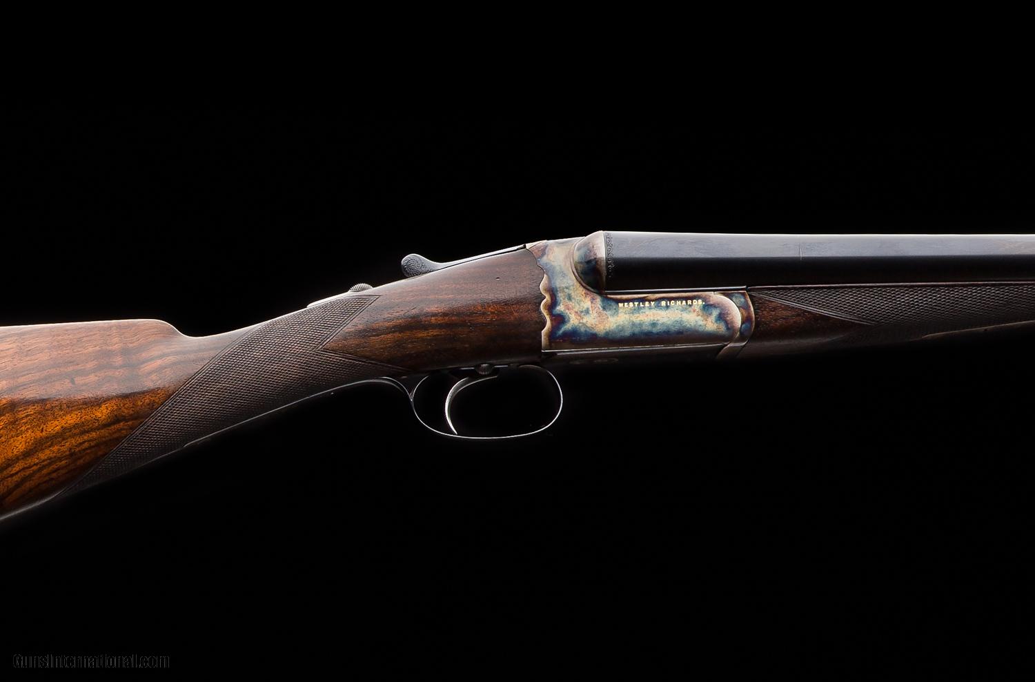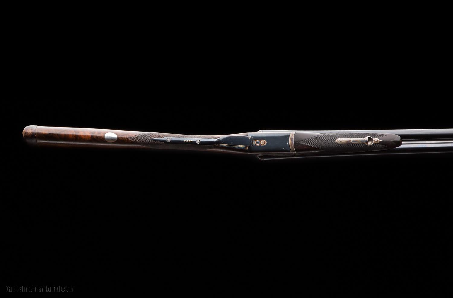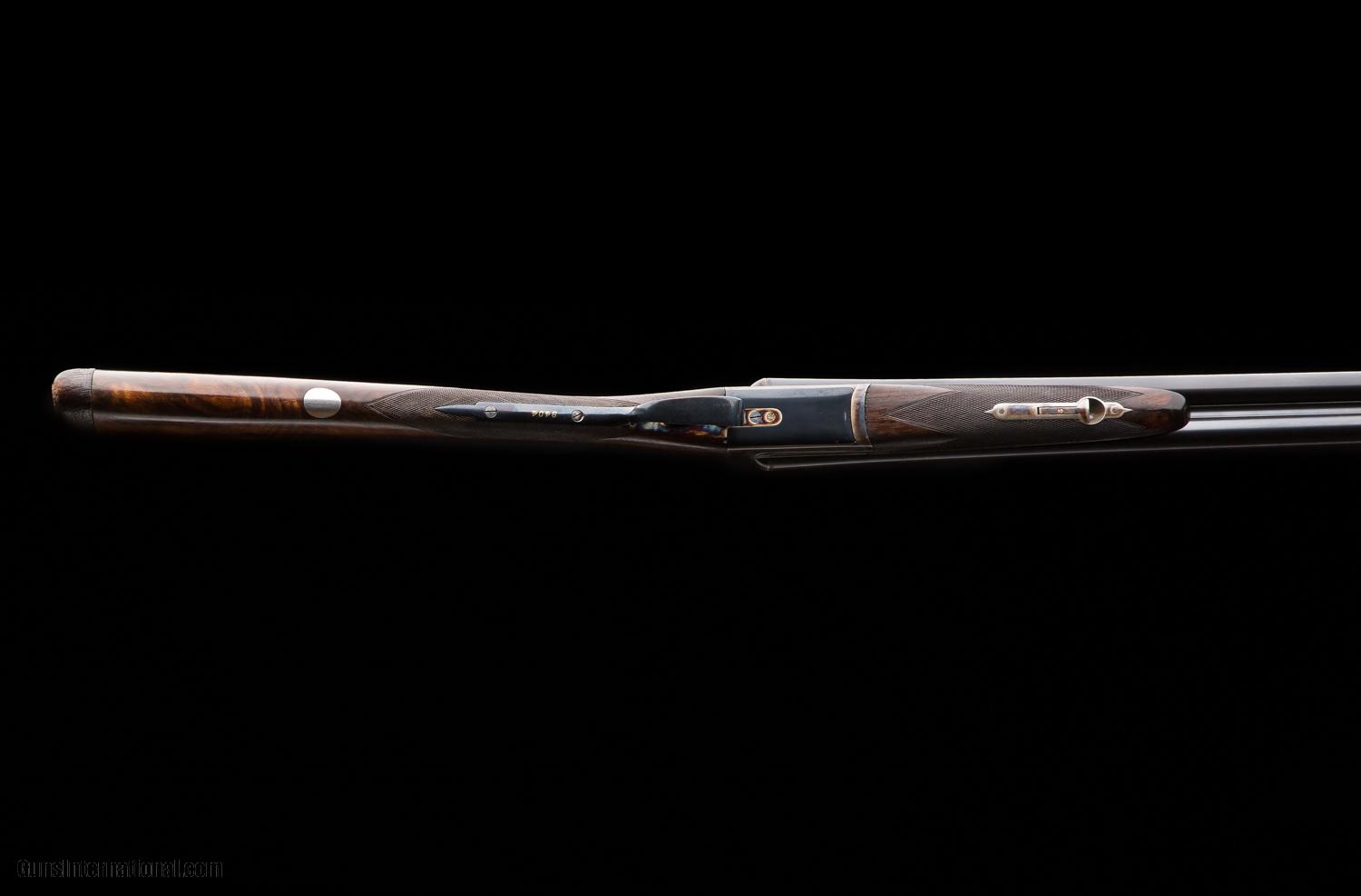 Description: Pair of Westley Richards 12g Gold Name drop lock shotguns built 1909. Patent hand detachable locks with removable cover plates, selective one trigger, scroll back, Westley snap lever work and recolour hardened actions. Sleeved 28" barrels with 2 3/4" chambers. No. 1 gun choked cylinder and 3/8 and No. 2 gun choked cylinder and 1/2. 14 3/8" straight hand stocks with leather covered recoil pads. Very neatly presented in a double leather Westley case. These guns are located in our Birmingham, UK facility and would require importation to the US through our agency based in Bozeman Montana, which we would handle. There is 2.6% duty to be paid on the value of the shotguns. Shipping costs in the region of $500. SOLD Curio/Relic: Yes |
