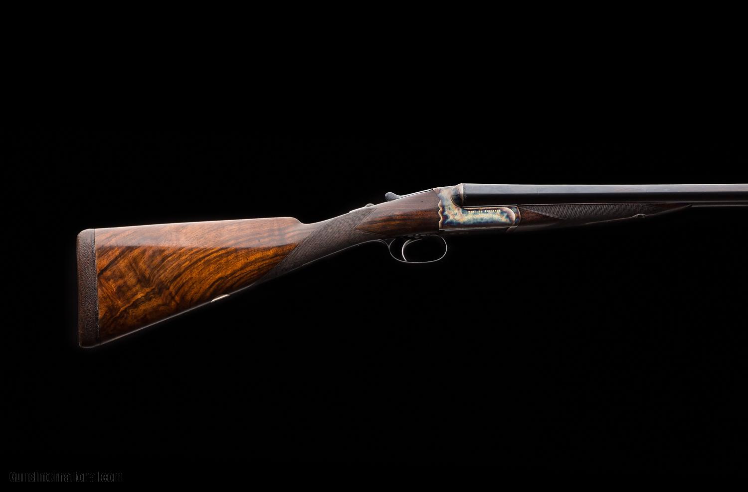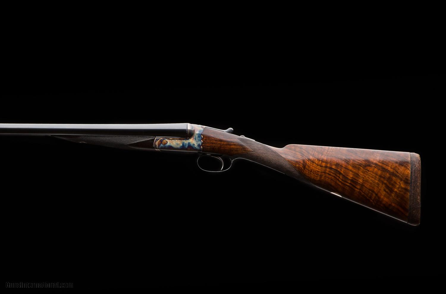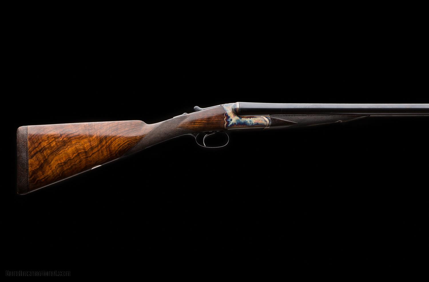 Description: Pair of Westley Richards 12g Gold Name drop lock shotguns built 1909. Patent hand detachable locks with removable cover plates, selective one trigger, scroll back, Westley snap lever work and recolour hardened actions. Sleeved 28" barrels with 2 3/4" chambers. No. 1 gun choked cylinder and 3/8 and No. 2 gun choked cylinder and 1/2. 14 3/8" straight hand stocks with leather covered recoil pads. Very neatly presented in a double leather Westley case. These guns are located in our Birmingham, UK facility and would require importation to the US through our agency based in Bozeman Montana, which we would handle. There is 2.6% duty to be paid on the value of the shotguns. Shipping costs in the region of $500. SOLD Curio/Relic: Yes |
