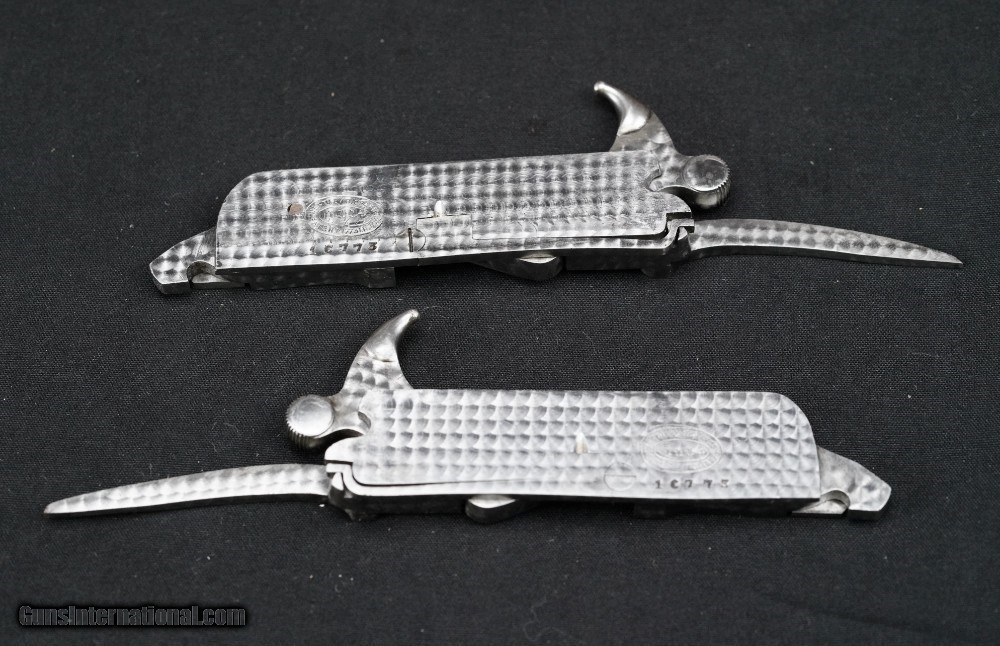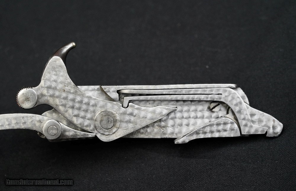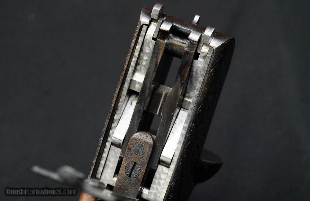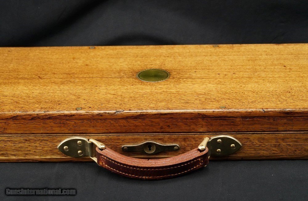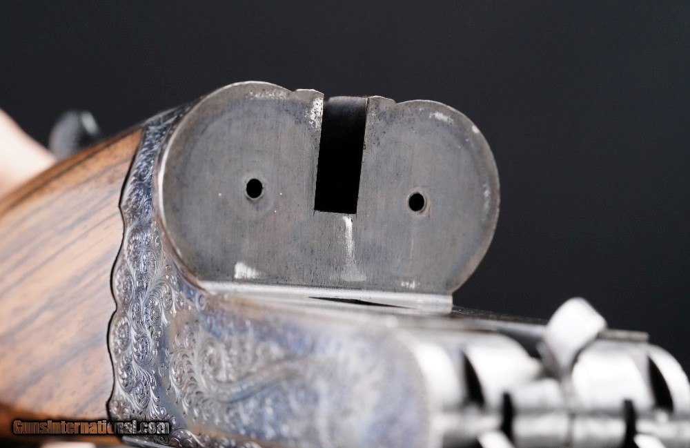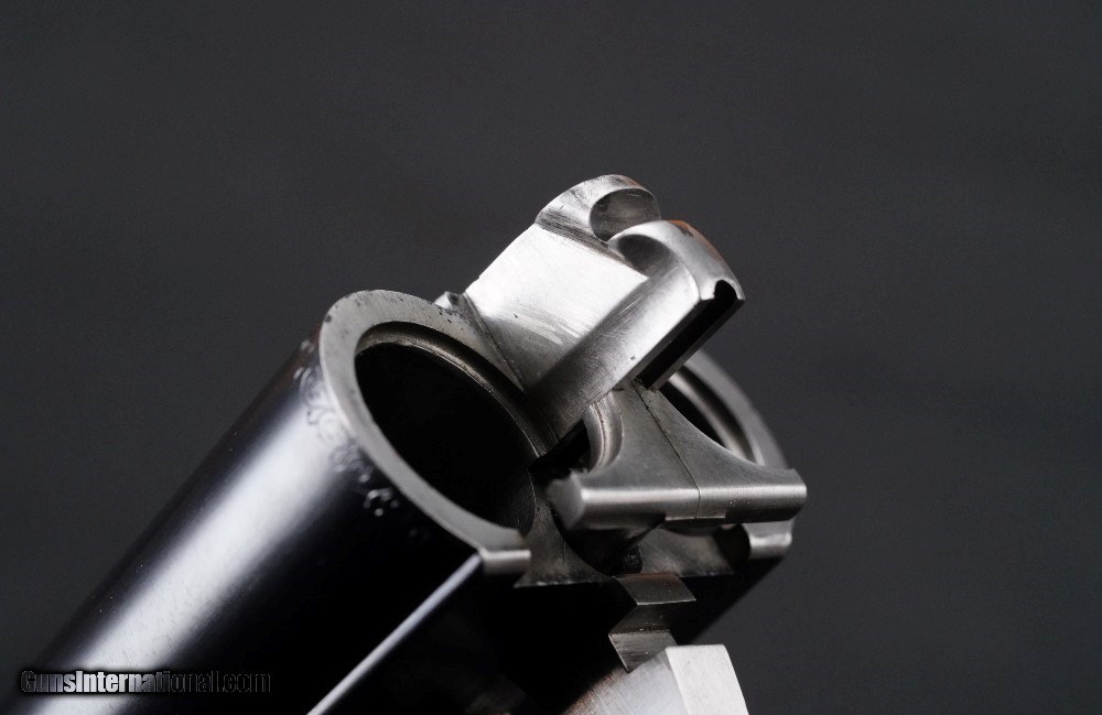 Description: ** 11/24/23 SOLD ** This is a truly exceptional and rare find - a beautiful Westley Richards 12g Best Quality Drop Lock, two barrel set, cased with makers label. According to Westley Richards, UK, the gun was completed in September 1912 for M.Pors Esquire. The ledger reads: "Double 12g Hand Detachable Lock Ejector, Double Trigger - Steel Barrels" It features the most desirable options only found on Best Quality guns from WR including full coverage house engraving pattern, snap lever, doll's head rib extension, and the hand detachable locks. Additionally, the 1912 year of manufacture includes the hinged floor plate still found on modern Westley Richards droplocks. This gun originally shipped with the 30" barrel set which has British proofs on the bottoms of the barrels and the flats, the bottoms of the barrels have the same Special Steel markings. The second set of barrels measure 28" and were fitted at a later date (likely before 1920) and is marked with a series of British proof marks, "WESTLEY RICHARDS / SPECIAL STEEL" around a triangle. Each barrel rib is marked "WESTLEY RICHARDS 178 NEW BOND ST. LONDON GUN MAKERS BY APPOINTMENT TO HIS MAJESTY GEORGE V REX ET IMP." Each barrel set has engraving motif at the breech-end, across the seam between the rib and its extension, and at the end of the extension. The exposed portions of the forend iron and latch have scroll engraving. The water table has Westley Richards patent markings and British proofs. The guard is marked with the serial number, found again on the floorplate and each lock. The lock assemblies also have Westley Richards patent markings. Each side of the receiver has "WESTLEY RICHARDS" engraved on a banner and the receiver has extensive/full coverage house pattern scroll engraving. The engraving continues onto the floorplate, guard, and snap lever. There is a hunting dog scene engraved on the trigger guard. Barrels: One 28" and one 30" barrel sets are included. Choke: 28": The left bore has a constriction of approximately 0.020" corresponding to Modified, the right approximately 0.006 corresponding to Skeet. 30": The left barrel has a constriction of approximately 0.026" corresponding to Improved Modified, the right approximately 0.001 corresponding to Cylinder Sights / Optics: Each barrel set has a silver-colored bead mounted to the front of its rib. Weight: 28": 6 lb., 12.7 oz. 30": 6 lb., 14.7 oz. Stock Configuration & Condition: The stock is checkered deluxe walnut with ebony-tipped splinter forend, straight grip, straight comb, and black London pig skin-covered pad. The buttstock has a few minor marks - unnoticeable. The forend has only light handling marks. The checkering is sharp. There are no chips or cracks. The LOP measures 15 1/4" and 14 1/4" from the fronts of the triggers to the back of the pad, 14 1/4" and 13 1/4" to the back of the wood. The pad shows little in the way of wear. Drop at comb is approximately 1 1/4", drop at heel 2 1/8", consistent with both barrel sets. The cast is about neutral. Overall, the stocks are in Excellent condition as not original to the gun. This gun was expertly restocked with exhibition-grade walnut. It is likely that the case color hardening was also professionally restored when restocked. Bore Condition: The bores are bright. There is no erosion in the bores. In this writer's opinion, the bores rate 10 out of 10. Overall Condition: This shotgun retains about 98% of its metal finish. There are only a few tiny marks through the finish. There is infrequent minor erosion under the finish, most notable on the trigger guard. The action shows faint operational wear. The screw heads are sharp. The markings are clear, some of the inspection/proof marks are worn and the dog scene on the trigger guard shows slight wear. Overall, this gun rates in Fine-plus condition as restored. Mechanics: The action functions correctly including ejectors with both barrel sets. The barrels lock up to the receiver with no play. Non-automatic safety functions properly when engaged manually. Box, Paperwork & Accessories: This shotgun comes in a custom Best Quality English-fit wood case with brass corner bolsters, a brass locking latch (no key included) and the interior has red fabric lining in various compartments for the barrels, stocked receiver, and accessories. This is an exceptional 1912 Westley Richards shotgun with the most desirable features. If in original condition, this would be a $30,000-$40,000 set. Few makers are ever compared to Westley Richards. The Droplock represents the pinnacle of the evolution of the Anson & Deeley boxlock design, allowing the removal of the locks by hand, with no tools by simply opening up the lock plate and pulling the locks out. This gave it even greater ease of maintenance and cleaning than traditional sidelock guns. Introduced in 1897, the Droplock is still made today! Whether intended to be a star addition to your collection or a vintage best shotgun restored and ready to shoot regularly - don't miss this one! Every attempt has been made to describe this wonderful shotgun in granular detail. Additional 100+ high-definition photos of every centimeter of the gun, barrels, markings, case, etc are available upon request. Serious offers considered. Shipping is a flat $50 - insurance is the option of the buyer. SOLD Curio/Relic: Yes Shotgun Gauge: 12 Gauge Manufacturer: Westley Richards Model: Best Quality Droplock Barrel Length: 30" & 28 Ejectors: yes Condition: Excellent as professionally restored Metal Condition: excellent Wood Condition: excellent Bore Condition: excellent Barrel Type: side by side Action: droplock Triggers: double Stock: English, straight LOP: 15.25 Manufacture Date: 1912 |