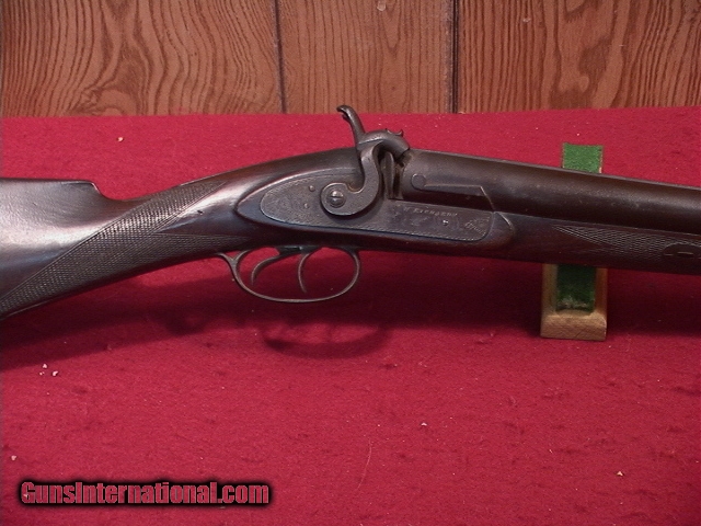 Description: W. RICHARDS 10GA 30" HAMMER MUZZLE LOADER, BROWN PATINA BARRELS, SMOOTH BROWN ENGRAVED LOCKS AND HAMMERS, FUNCTIONS EXC. NICE WOOD WITH SHARP CHECKERING, EXC. WALL HANGER SOLD |