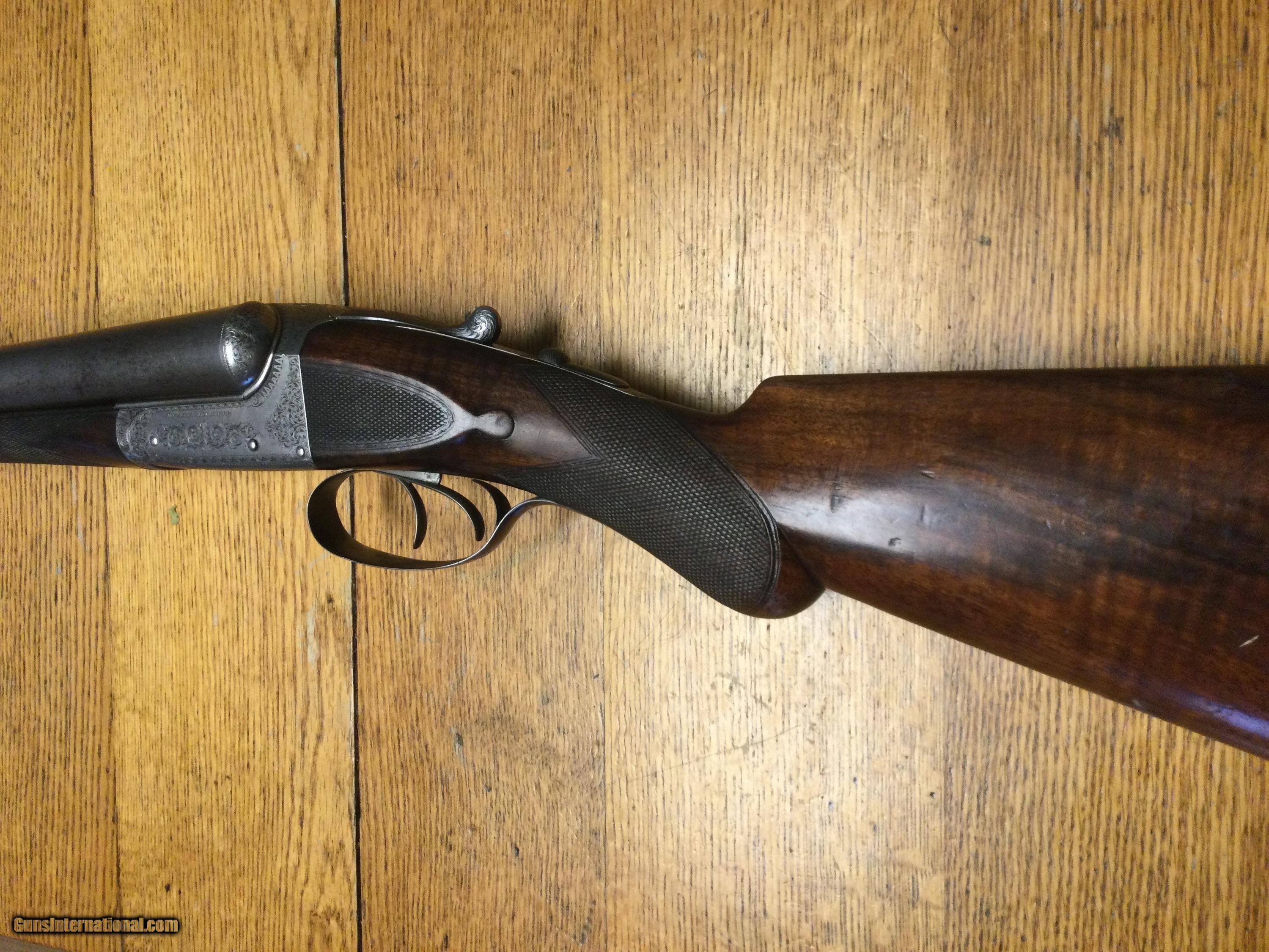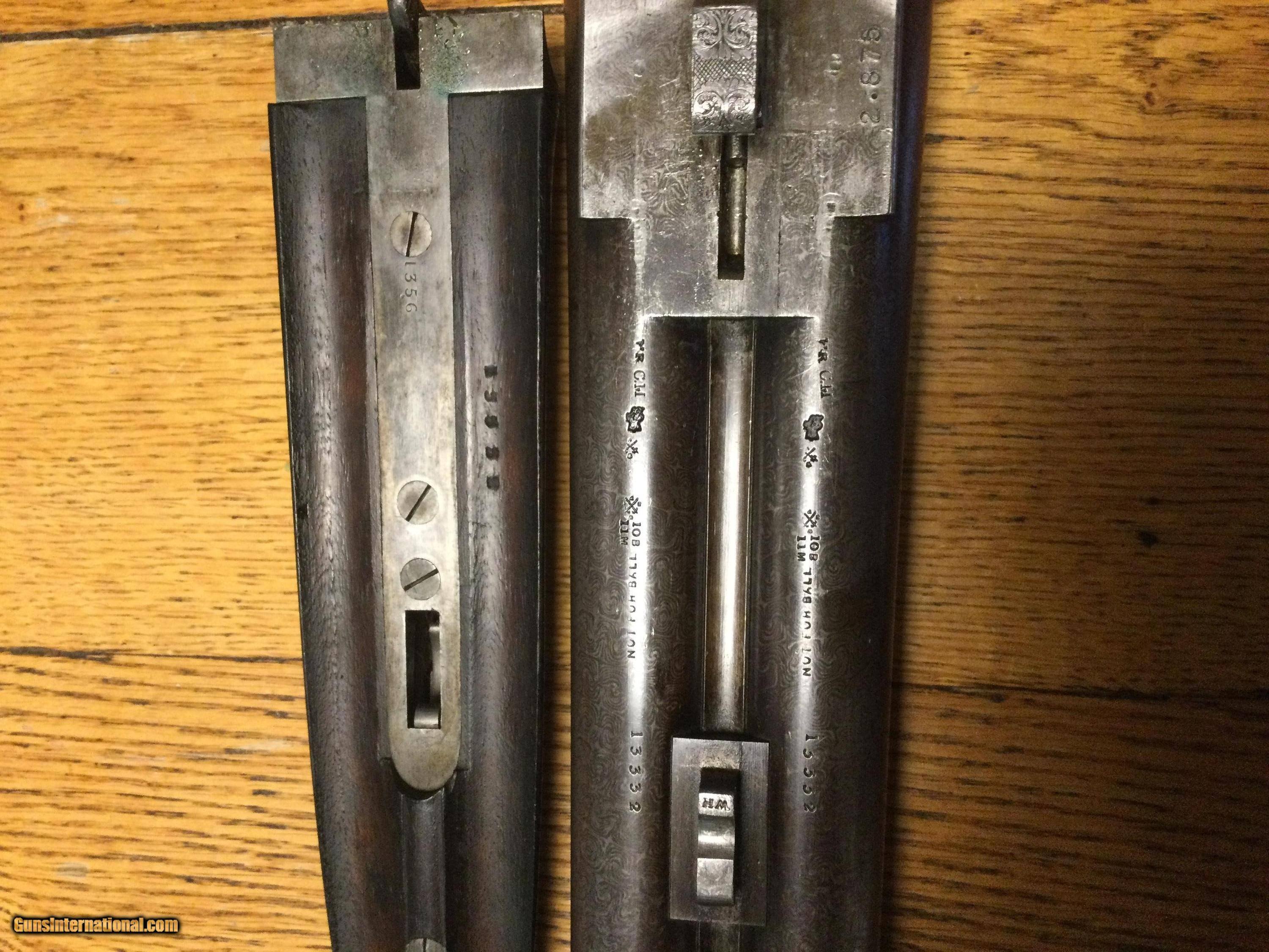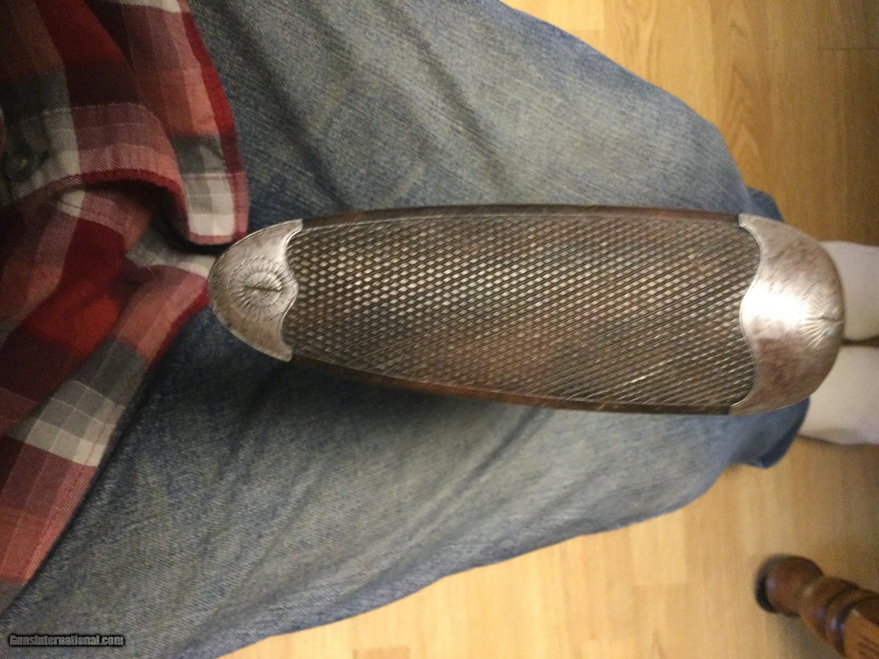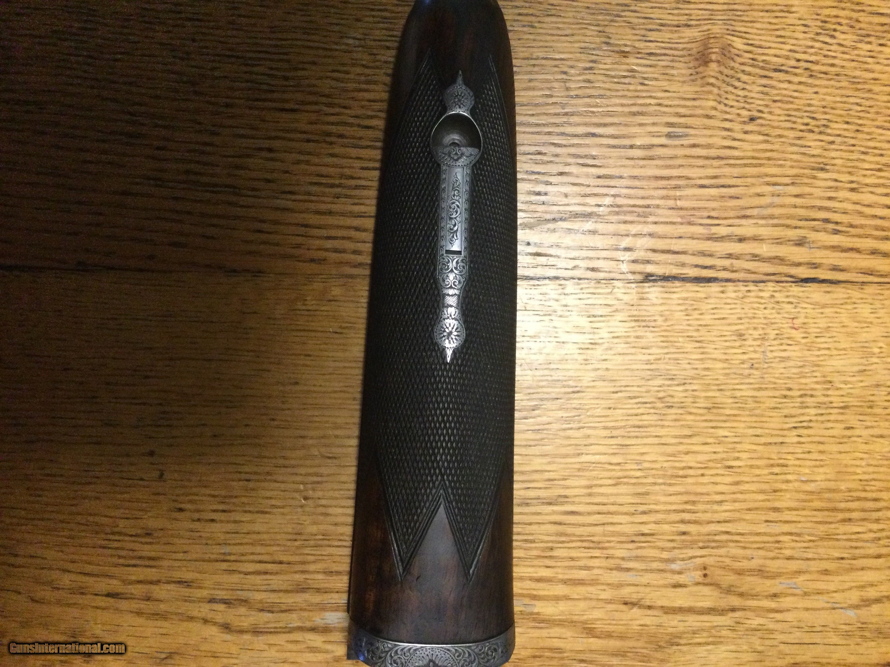 Description: Sold Sold Sold. This is a Westley Richards 10gauge Anson & Deeley Hammerless Gun. It has 30” barrels with 2 7/8" chambers , chokes M/F nice thick barrels and excellent bright and shiny bores and a very good crisp and tight lock up. The fancy wood is very good with sharp checkering .The LOP is 14 3/8”, DAC is 1 5/8” and the DAH is 2 1/4" The screws are unbugger ,basically unrefinished gun with some dings from use,but not abused. Nice mid grade gun with English engraving. Heel & toe plates ,double triggers, half pistol, and non ejector. Gun has been well cared for , no issues ,used RST loads. Weight is 8 lbs making a nice upland or duck gun. Price reduce $2950.00 plus S&H $50. Sold ! SOLD Antique: Yes Shotgun Gauge: 10 Gauge Manufacturer: Westley Richards Serial Number: 13352 Barrel Length: 30” Chambers: 2 7/8” Ejectors: No Condition: Very good plus Metal Condition: Very good plus Wood Condition: Very good plus Bore Condition: Excellent Triggers: Double Stock: Half Butt Pad: Heel & toe plates Weight: 8lbs |