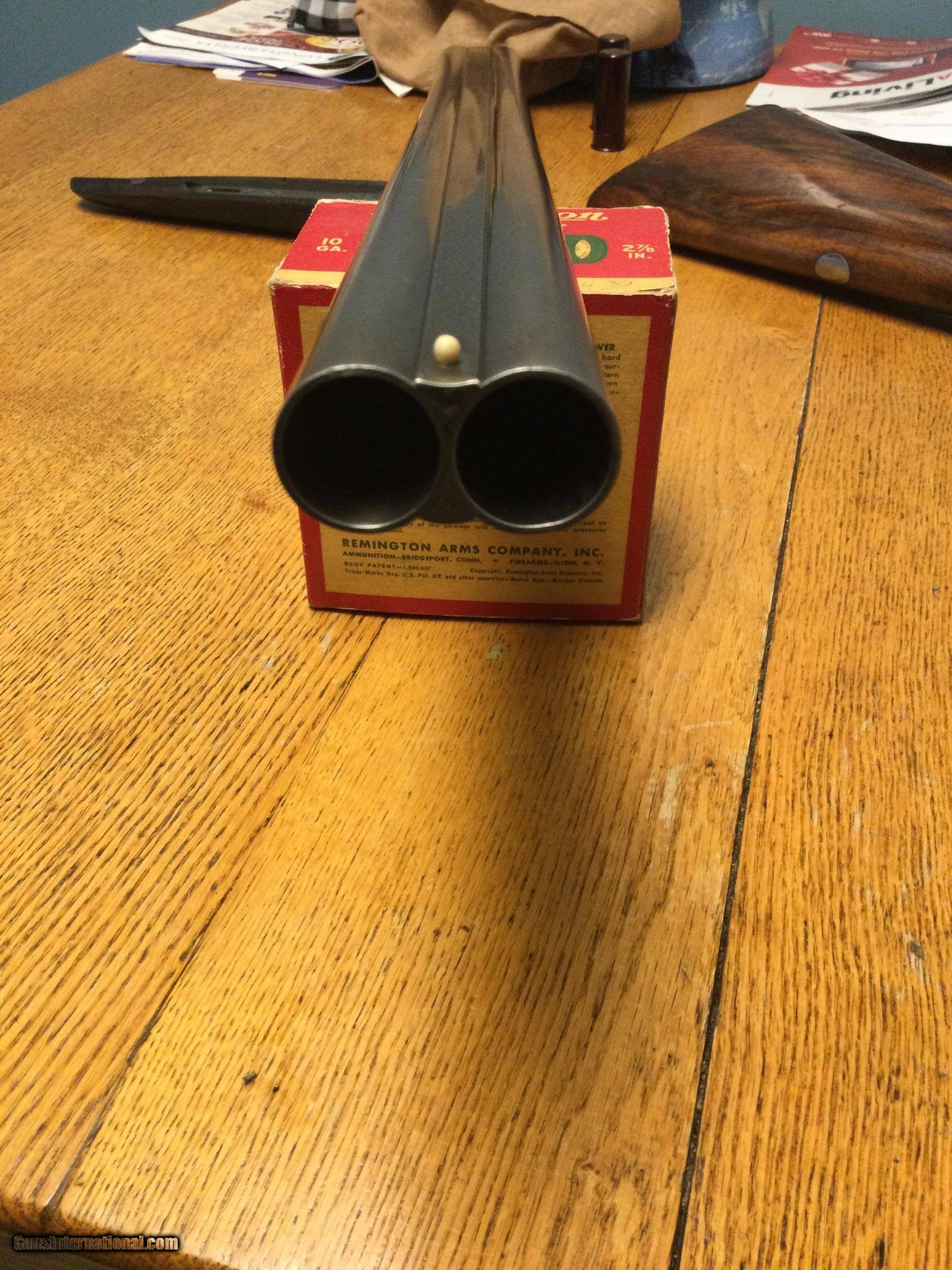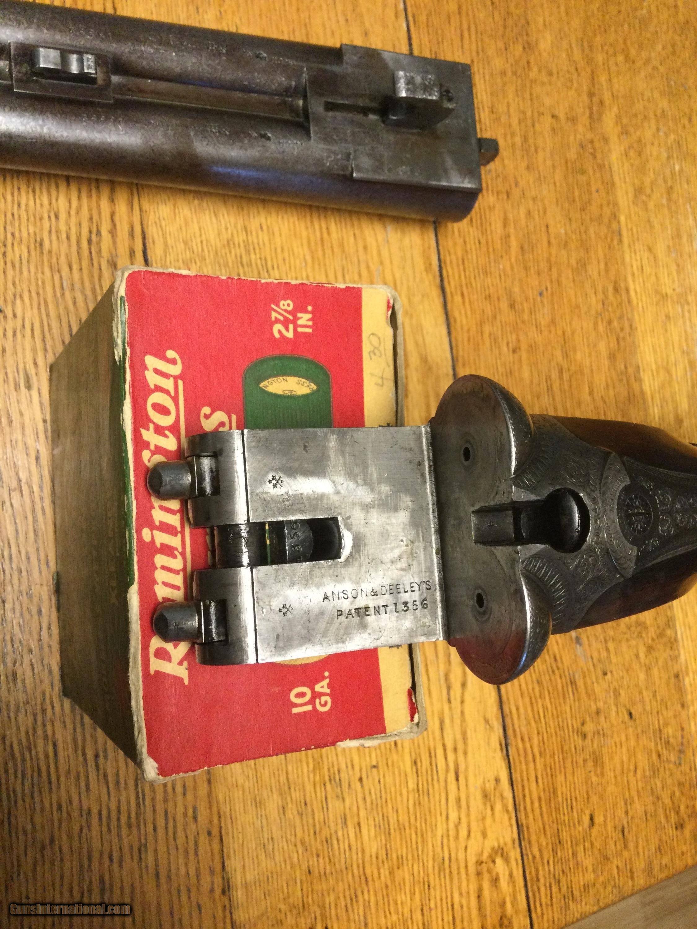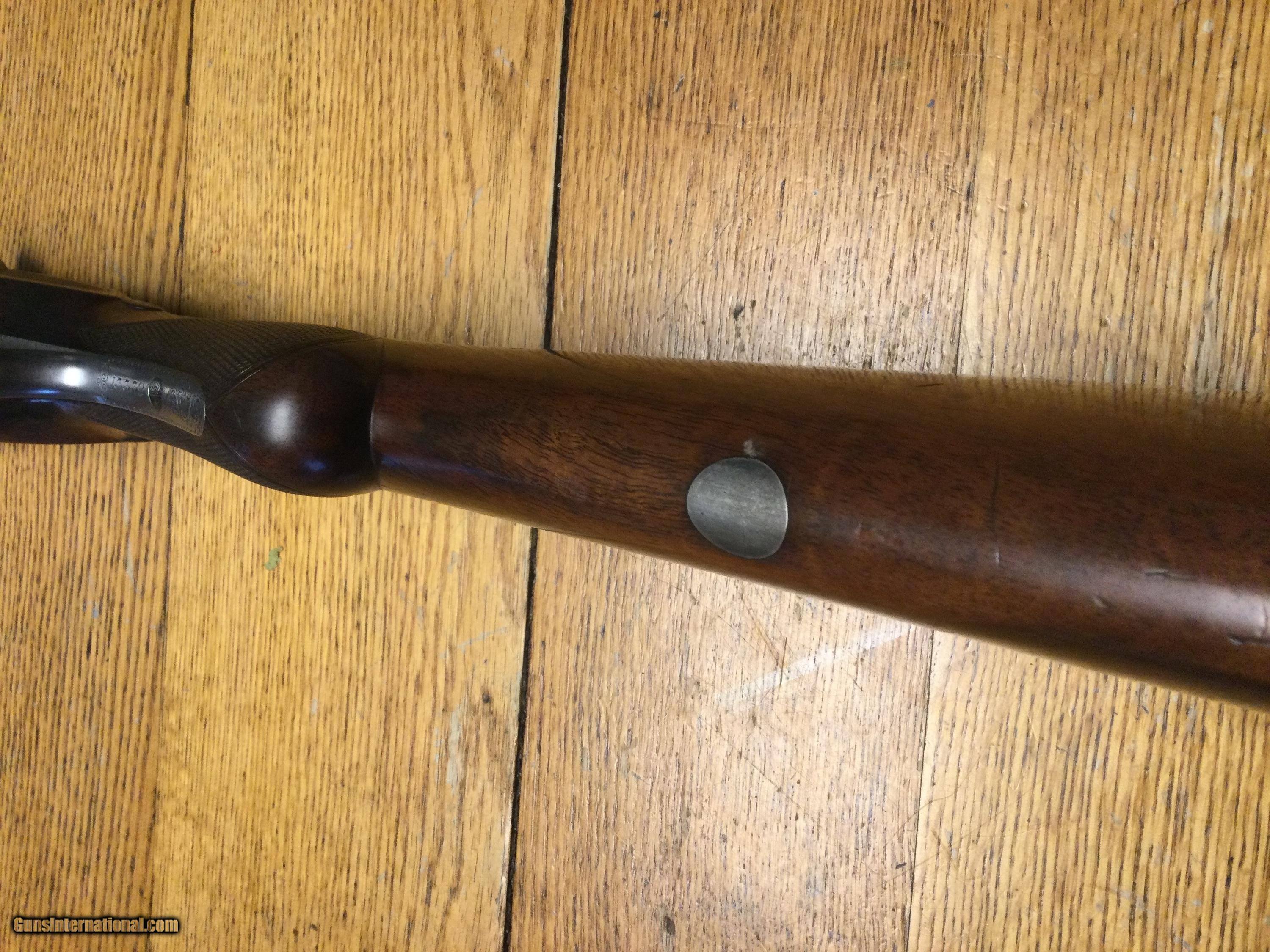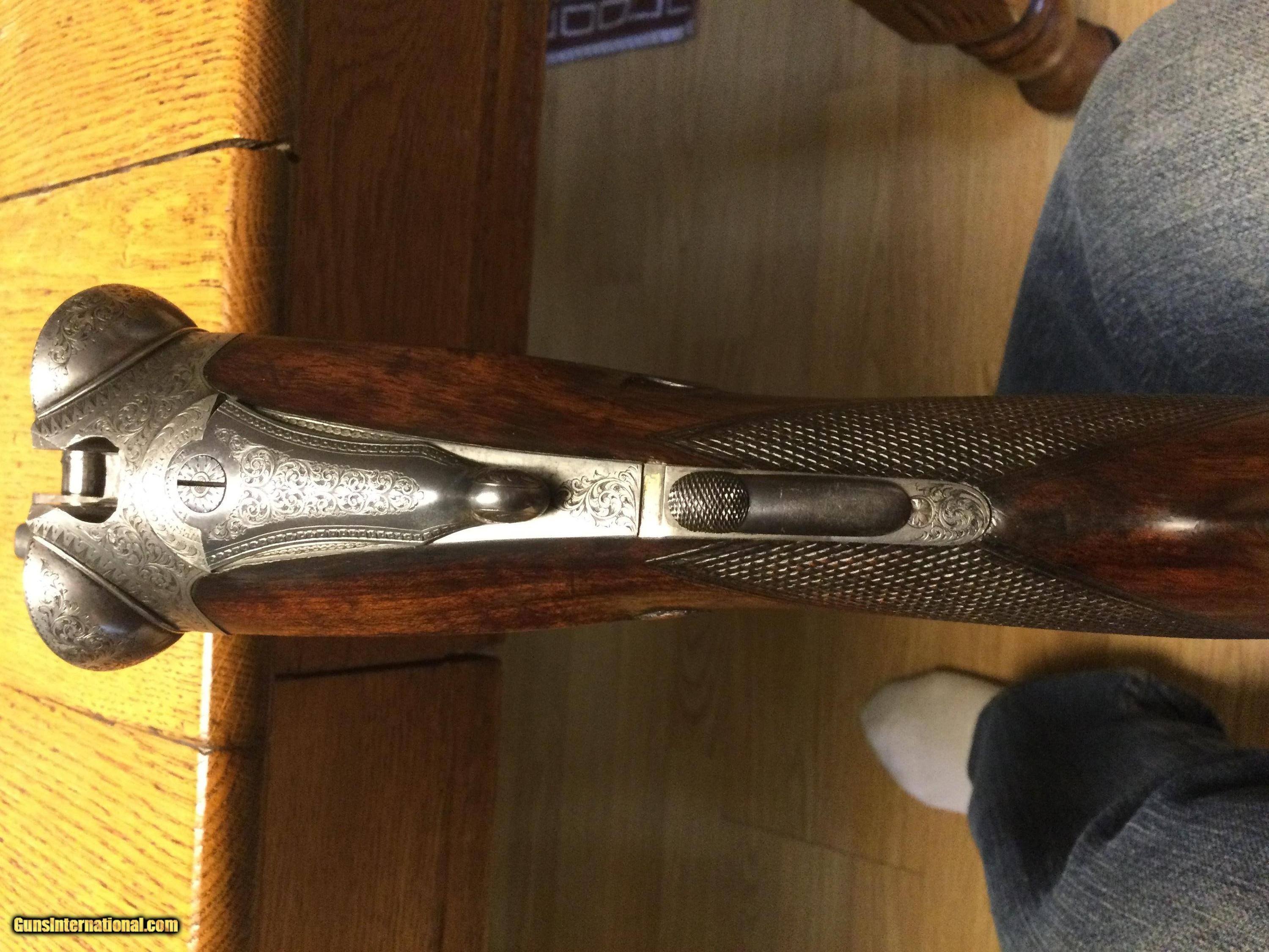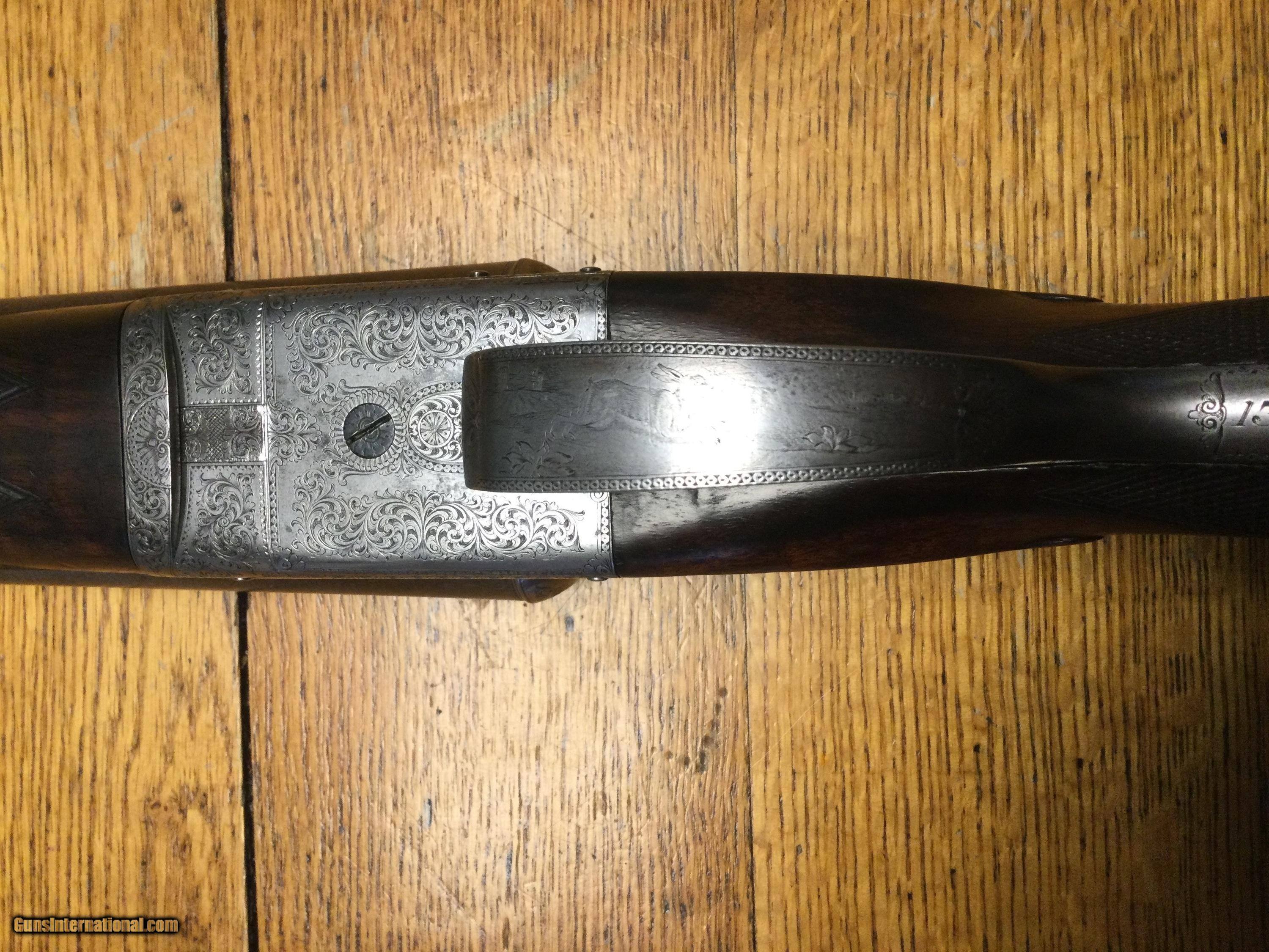 Description: Sold Sold Sold. This is a Westley Richards 10gauge Anson & Deeley Hammerless Gun. It has 30” barrels with 2 7/8" chambers , chokes M/F nice thick barrels and excellent bright and shiny bores and a very good crisp and tight lock up. The fancy wood is very good with sharp checkering .The LOP is 14 3/8”, DAC is 1 5/8” and the DAH is 2 1/4" The screws are unbugger ,basically unrefinished gun with some dings from use,but not abused. Nice mid grade gun with English engraving. Heel & toe plates ,double triggers, half pistol, and non ejector. Gun has been well cared for , no issues ,used RST loads. Weight is 8 lbs making a nice upland or duck gun. Price reduce $2950.00 plus S&H $50. Sold ! SOLD Antique: Yes Shotgun Gauge: 10 Gauge Manufacturer: Westley Richards Serial Number: 13352 Barrel Length: 30” Chambers: 2 7/8” Ejectors: No Condition: Very good plus Metal Condition: Very good plus Wood Condition: Very good plus Bore Condition: Excellent Triggers: Double Stock: Half Butt Pad: Heel & toe plates Weight: 8lbs |