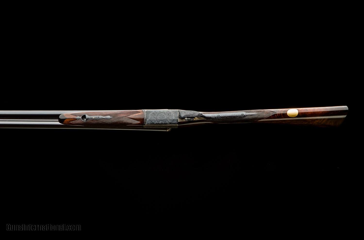 Description: Westley Richards & Co. 12g Best Quality Lightweight Hand Detachable Lock shotgun finished in August of 1937 for W.H.S. Chance Esquire. Gun has all the Westley Richards hallmark features including our patent Hand Detachable Lock or Droplock action with a scroll back, snap lever work and Model “C” Doll’s head extension, hinged cover plate, patent “One Trigger”, automatic “beetle back” safety, and Westleys' patent ejectors. Action is engraved with a small scroll in the traditional house pattern with the maker’s name in flowing banners on each side of the action and a pointing dog on the trigger bow. This is a single gun (No.1) of a pair and is so numbered in gold on the top rib, top lever, and forend iron. “SAFE” is also inlaid in gold and the stock’s gold oval is blank. The original WR Special Steel, dovetail lump, 28” barrels have a smooth, raised and concave game rib, with original 2 ½" chambers. The barrels were re-proved in Birmingham in 2010. The barrels are choked .008" in the right and and .024" in the left. Original straight hand stock is nicely figured with a very fine point pattern checkering with traditional Mullered borders. The LOP is 13 ½" over a serrated horn butt plate. The splinter forend has the traditional horn forend tip and Deeley latch. Legitimate Lightweight guns (those ordered and entered in the ledgers as Lightweights) are quite rare. These gun’s had specially selected walnut blanks and the barrels were struck a tad thinner, all in efforts to save weight. As a result, the Lightweights were fast handling guns that weighed 6 to 8 oz less than a standard gun...all things being equal. This gun weighs only 6 lbs. 1 oz. and balances just at the knuckle of the action. The barrels of this gun are tight on face and in very good shape still retaining safe wall thickness. A pad can also easily be added to make the LOP a bit longer. Action is mostly gray with traces of original colors left, the barrels and furniture have had a re-black and the wood has been re-oiled and the checkering picked up at, I imagine, the same time the barrels were re-proved. Gun is included in a later Maker's VC lightweight leather case w/ french fitted storage for the removed locks. Overall very nice condition and a perfect configuration for walk up pheasants. SOLD Curio/Relic: Yes |