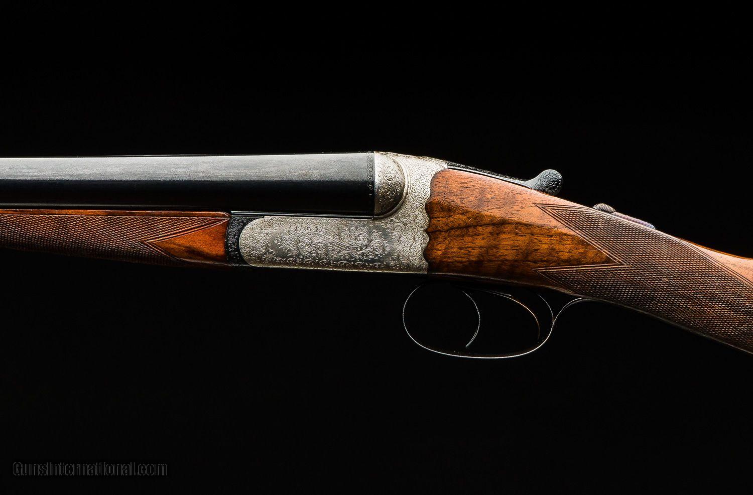 Description: Westley Richards 12g droplock completed in 1905. Scroll back action with patent hand detachable locks, removable cover plate, Westley snap lever work, dolls head extension and two triggers. New 25" barrels were fitted in 1972 and have 2 1/2" chambers and are choked 1/4 and full. The straight hand stock measures 14 1/2" to centre of the butt, with tip and toe plates and gold stock oval. The wood work would benefit from a gentle refurbishment but is structurally sound with no cracks or defects. The gun has had a full strip and clean and barrel reblack. The gun is a fast handling droplock, ideally suited for walked up shooting. Location: UK Make: Westley Richards Calibre/Gauge: 12g Action: Droplock Triggers: 2 Ejectors: Yes Barrel Length: 25'' Rib: Concave Chamber: 2 1/2" Choke Right: 1/4 Choke Left: Full Stock: Straight LOP: 14 1/2" Weight: 6lbs 8oz This shotgun is located in our Birmingham UK factory and would require importation through our Gulf Breeze, Florida agency, which we would handle. Costs of shipping vary but it would be around $750. There is 2.6% duty to be paid on the value of the shotgun. SOLD |