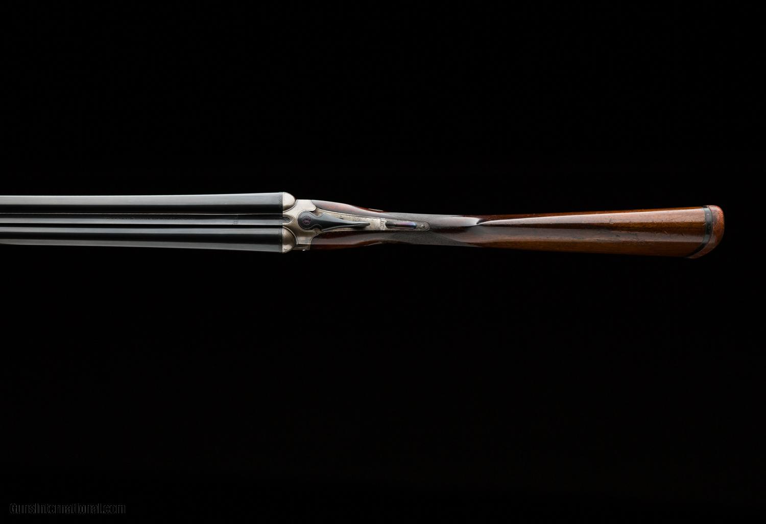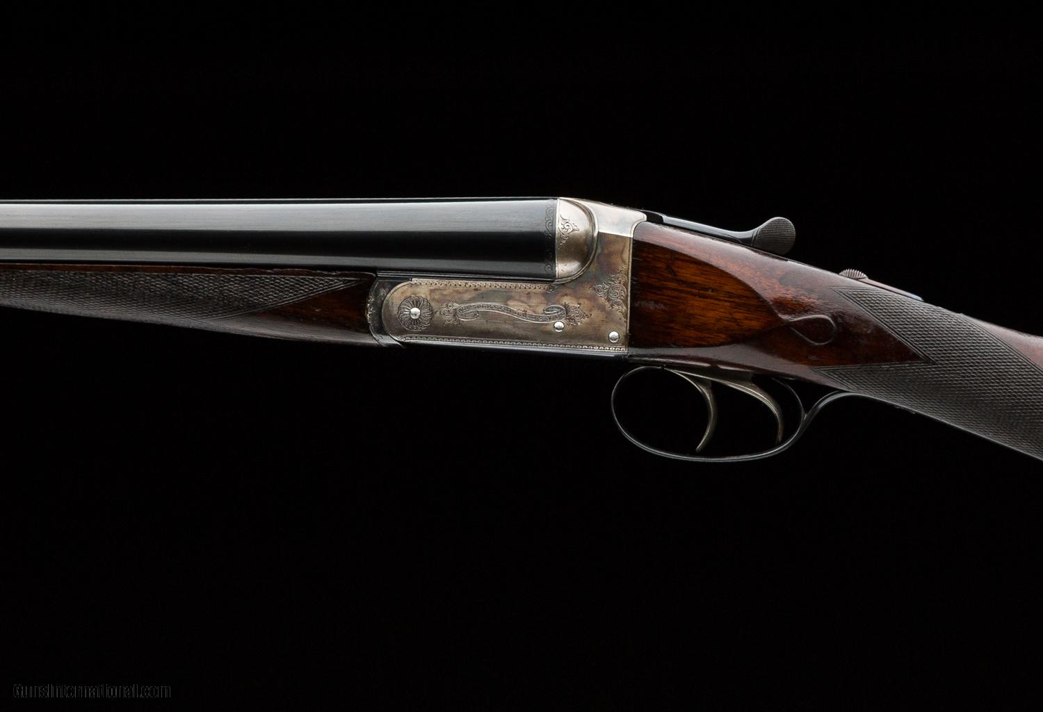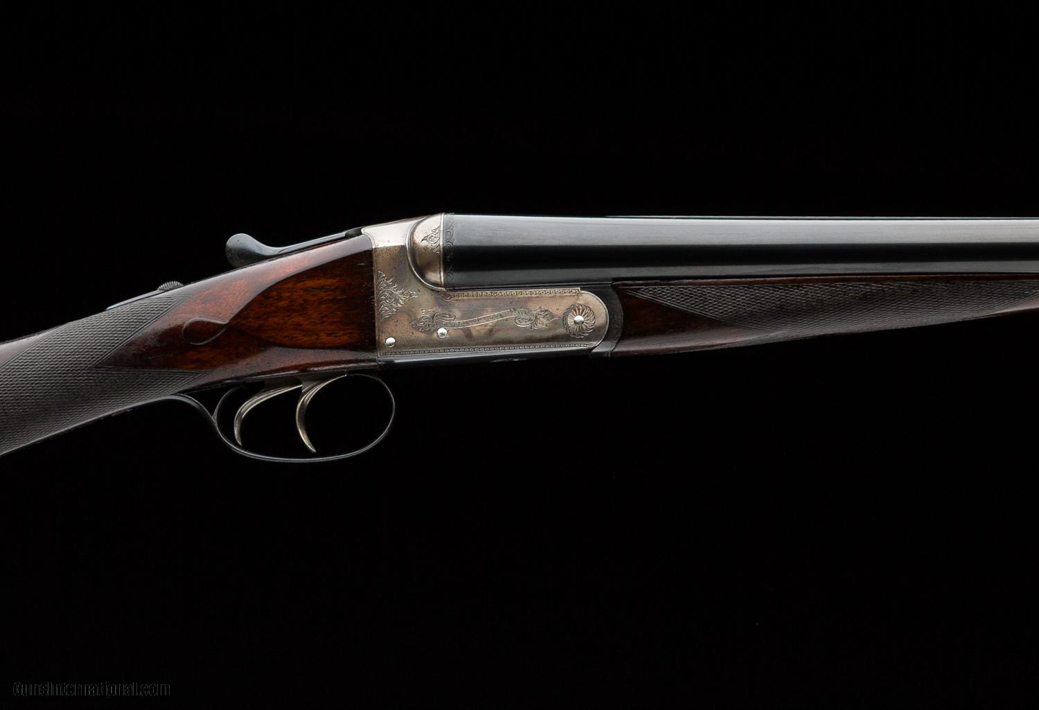 Description: Fixed lock, 12 gauge ejector completed 1947. Tang lever, border and name engraved, double trigger action which has had a full strip and clean. 28" recently reblacked barrels with sound measurements, choked 1/4 & Full. 14 1/2" straight hand stock measuring 14 1/2" to centre with a Silvers recoil pad, weighs 6lbs 11oz. An affordable boxlock in good condition. This shotgun is located in our Birmingham UK factory and would require importation through our Gulf Breeze, Florida agency, which we would handle. Costs of shipping vary but it would be around $750. There is 2.6% duty to be paid on the value of the shotgun. SOLD |