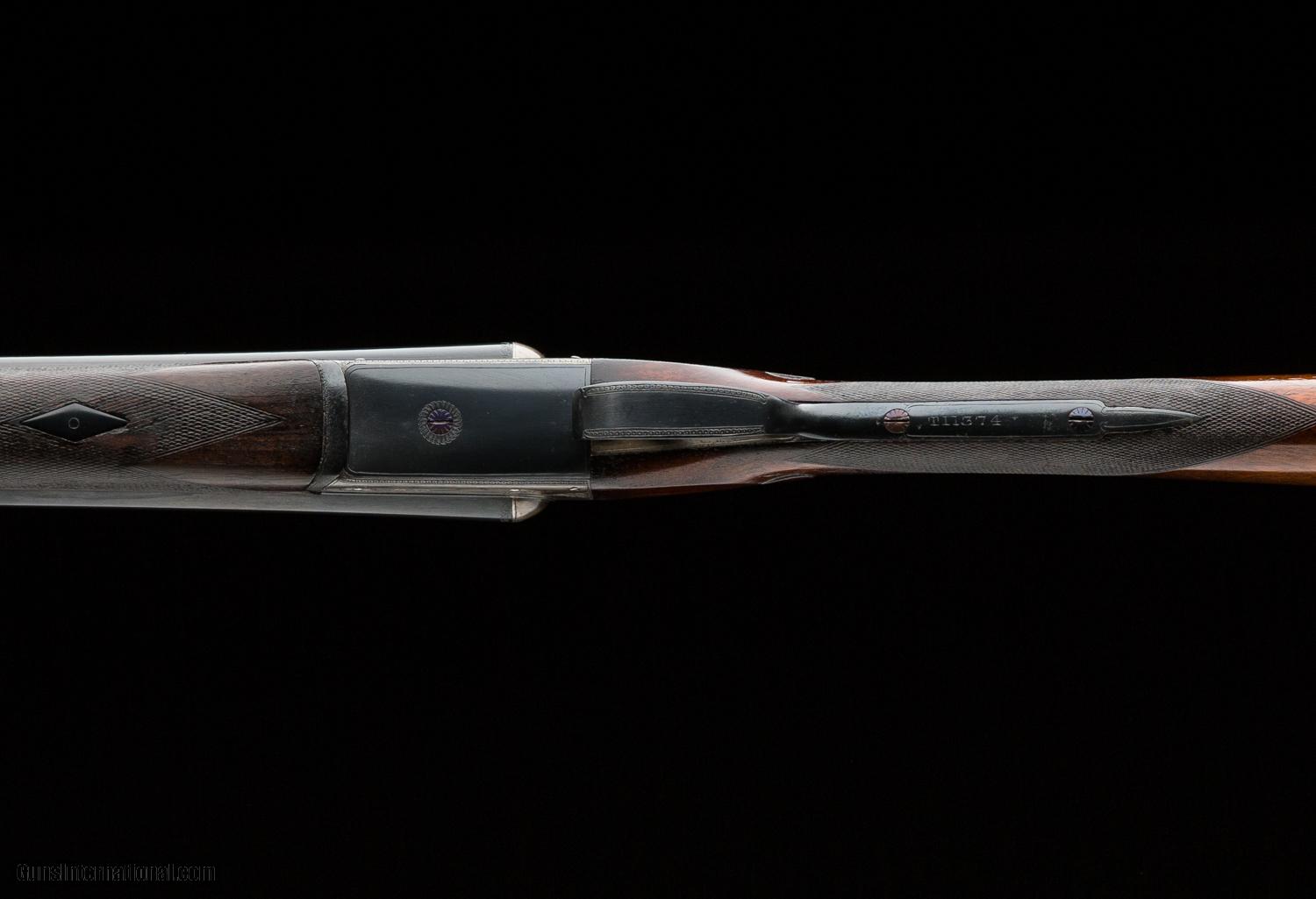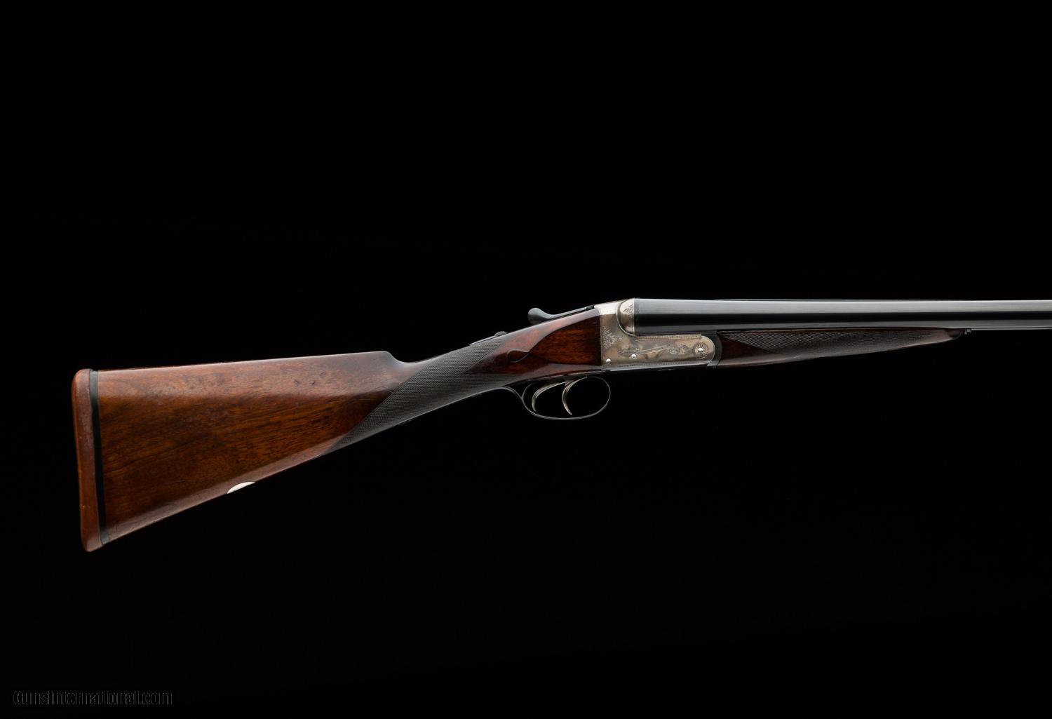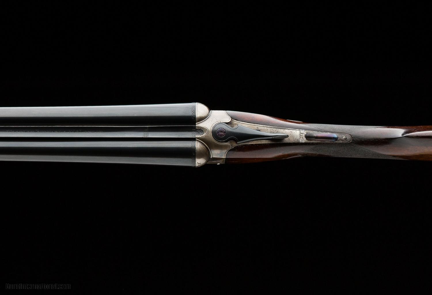 Description: Fixed lock, 12 gauge ejector completed 1947. Tang lever, border and name engraved, double trigger action which has had a full strip and clean. 28" recently reblacked barrels with sound measurements, choked 1/4 & Full. 14 1/2" straight hand stock measuring 14 1/2" to centre with a Silvers recoil pad, weighs 6lbs 11oz. An affordable boxlock in good condition. This shotgun is located in our Birmingham UK factory and would require importation through our Gulf Breeze, Florida agency, which we would handle. Costs of shipping vary but it would be around $750. There is 2.6% duty to be paid on the value of the shotgun. SOLD |