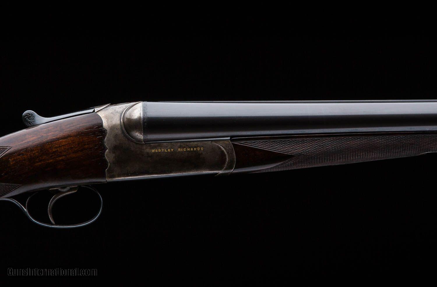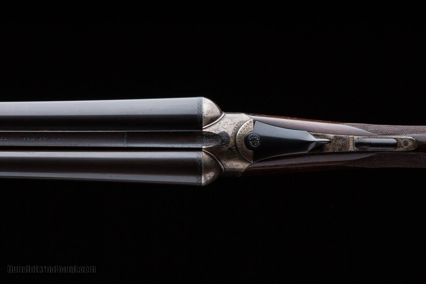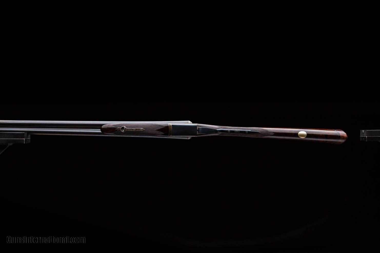 Description: Westley Richards 12g Best Quality Plain Finish Hand Detachable Lock shotgun completed in 1922 for Crawford Short & Co. of London. This model is known colloquially as the "Gold Name" Westley Richards. It was finished as a Best quality gun save for any undo embellishment other than the Maker's name inlaid on the sides of the receiver in gold. The action was case colored and top lever, cover plate and trigger bow were blacked. The gun has a scroll back and Westley Richards' Patent hinged cover plate and removeable locks, Snap Lever work, Dolls Head extension, automatic "beetle back" safety, single/selective Patent One Trigger, WR ejectors and Deeley/Edge forened latch. Traces of case color remain on the otherwise unadorned receiver save for the Maker's name inlaid in gold. Original 28" shoe lump Westley Richards Special Steel barrels have bore diamters of .737" in the right and .739" in the left. The guns barrels are choked as listed in the ledgers "cylinder" in the right barrel and "choke" in the left barrel, they measure .008" and .045" respectively. Original 2 1/2" chambers proofed for 1 1/8 oz. and a raised smooth concave rib marked "Westley Richards 23 Conduit St. London Gunmakers By Appointment To His Majesty George V Rex Et Imp" Stock has straight hand grip, a 14 5/8" LOP over a Silver's type pad and a polished gold oval and the splinter forend has a horn tip. Action is a mottled brown color and shows case colors in protected areas. Stock and checkering have been cleaned up and oiled but is crack free and appears original. Ejectors, trigger and safety work well, locks are clean and the barrels are dent and pit free with good wall thickness in both tubes. Gold Name guns are very cool and very well made guns but finding them in good shape is always a struggle. This is a model very distinctive to those who "know enough to know" and they are highly sought after in this kind of condition. SOLD Curio/Relic: Yes |
