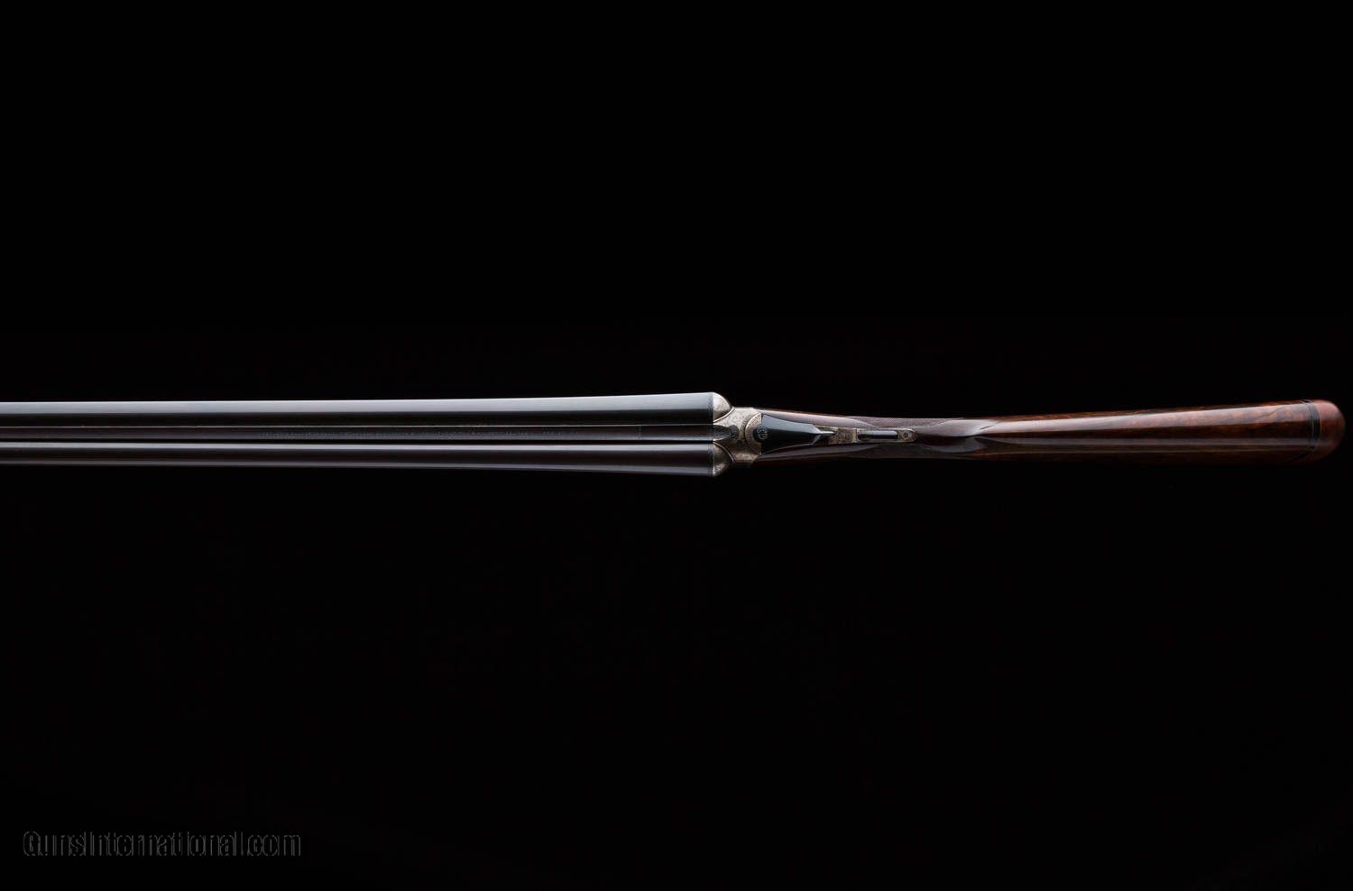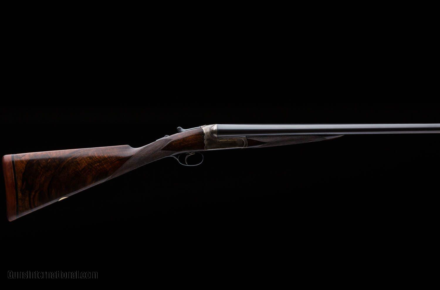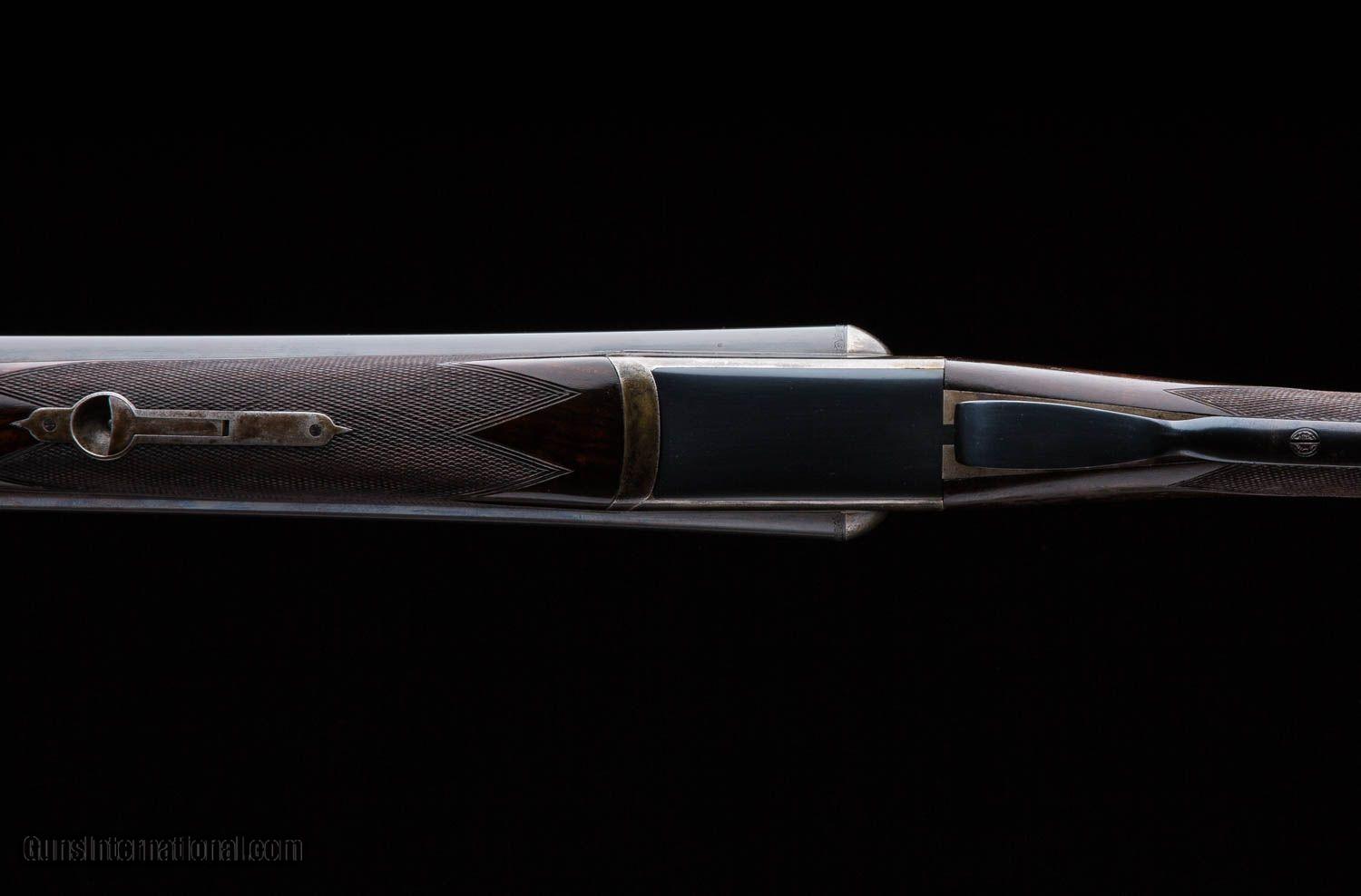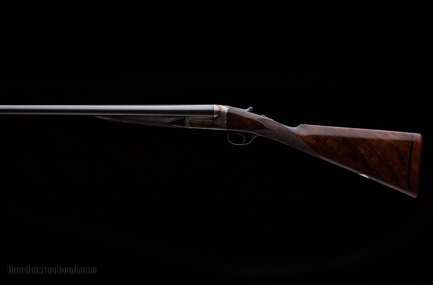 Description: Westley Richards 12g Best Quality Plain Finish Hand Detachable Lock shotgun completed in 1922 for Crawford Short & Co. of London. This model is known colloquially as the "Gold Name" Westley Richards. It was finished as a Best quality gun save for any undo embellishment other than the Maker's name inlaid on the sides of the receiver in gold. The action was case colored and top lever, cover plate and trigger bow were blacked. The gun has a scroll back and Westley Richards' Patent hinged cover plate and removeable locks, Snap Lever work, Dolls Head extension, automatic "beetle back" safety, single/selective Patent One Trigger, WR ejectors and Deeley/Edge forened latch. Traces of case color remain on the otherwise unadorned receiver save for the Maker's name inlaid in gold. Original 28" shoe lump Westley Richards Special Steel barrels have bore diamters of .737" in the right and .739" in the left. The guns barrels are choked as listed in the ledgers "cylinder" in the right barrel and "choke" in the left barrel, they measure .008" and .045" respectively. Original 2 1/2" chambers proofed for 1 1/8 oz. and a raised smooth concave rib marked "Westley Richards 23 Conduit St. London Gunmakers By Appointment To His Majesty George V Rex Et Imp" Stock has straight hand grip, a 14 5/8" LOP over a Silver's type pad and a polished gold oval and the splinter forend has a horn tip. Action is a mottled brown color and shows case colors in protected areas. Stock and checkering have been cleaned up and oiled but is crack free and appears original. Ejectors, trigger and safety work well, locks are clean and the barrels are dent and pit free with good wall thickness in both tubes. Gold Name guns are very cool and very well made guns but finding them in good shape is always a struggle. This is a model very distinctive to those who "know enough to know" and they are highly sought after in this kind of condition. SOLD Curio/Relic: Yes |