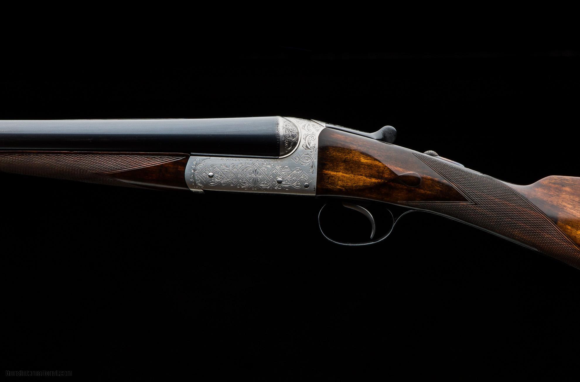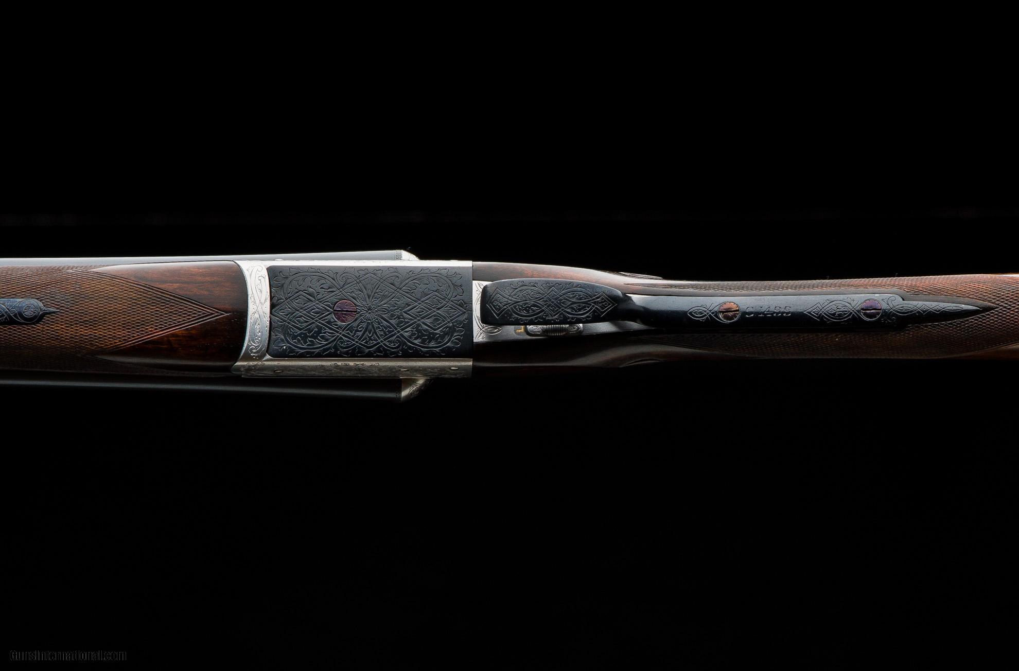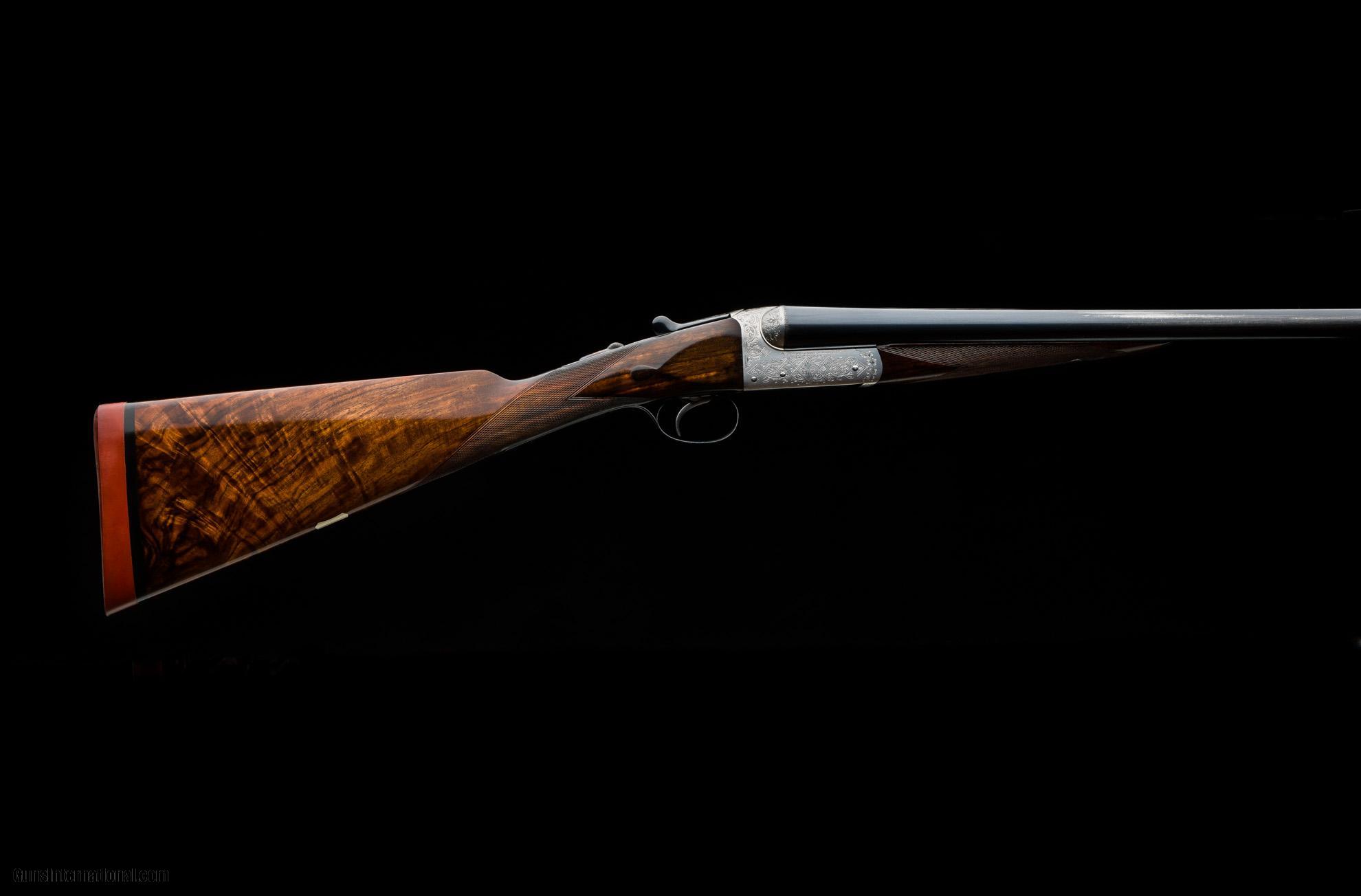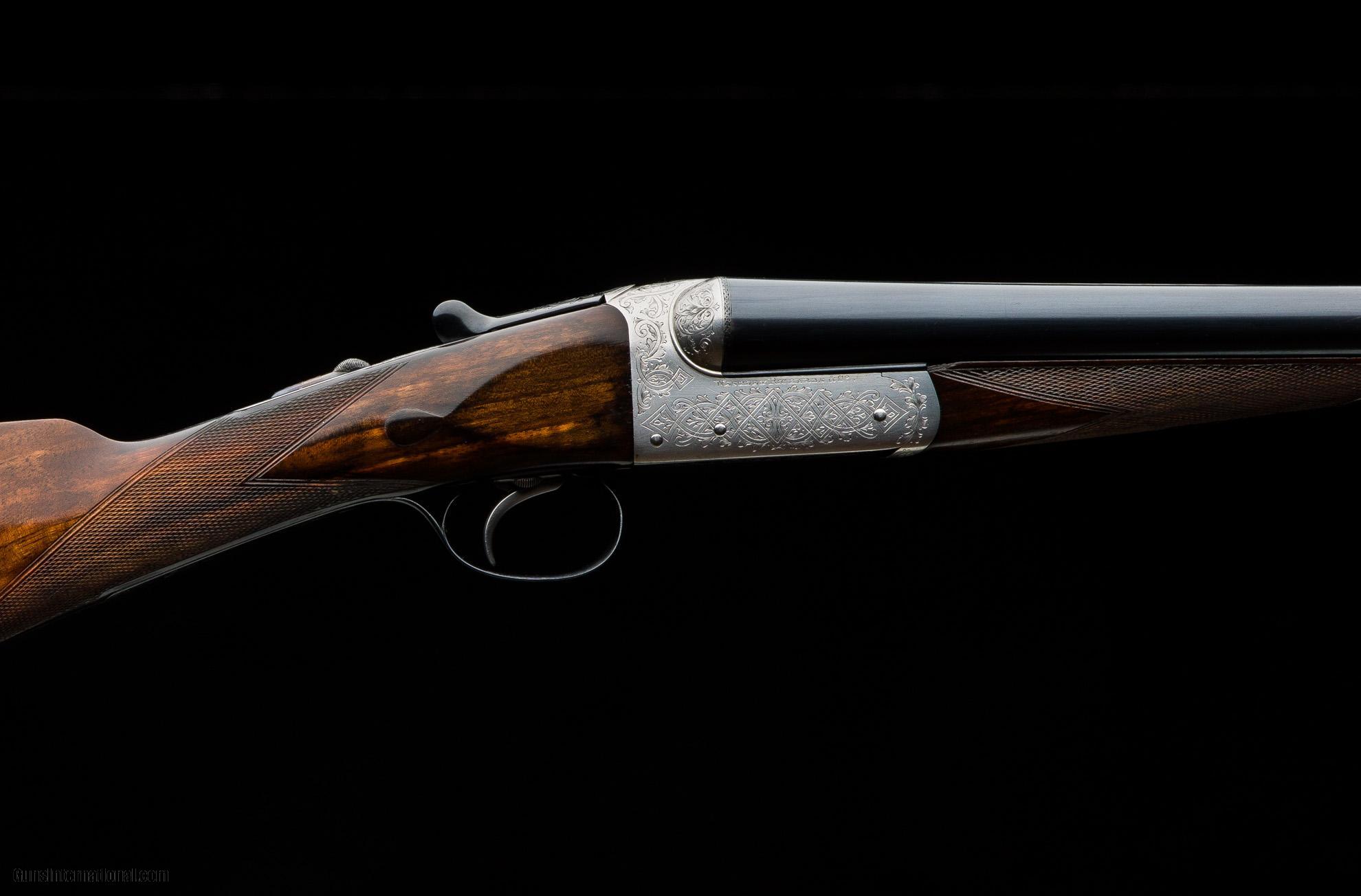 Description: Westley Richards Heronshaw 12g fixed lock ejector completed in 1925. 28" sleeved barrels with 2 3/4" chambers choked cylinder & 1/2. Fixed lock, single selective trigger action with Westley snap lever work, dolls head extension and beetle back safety engraved with the traditional Heronshaw style basket weave. Lightly refinished stock measuring 14 1/2" to centre with a Silvers recoil pad, drop points and escutcheon. The chequer has been recut on both the stock and forend. The gun is cased in a leather WR case with tools and is a solid and affordable Heronshaw. This shotgun is located in our Birmingham UK factory and would require importation through our Gulf Breeze, Florida agency, which we would handle. Costs of shipping vary but it would be around $900. There is 2.6% duty to be paid on the value of the shotgun. Make: Westley Richards Caliber/Gauge: 12g Action: Boxlock Triggers: 1 Ejectors: Yes Barrel Length: 28" Sleeved Rib: Concave Chamber: 2 3/4" Choke Right: Cylinder Choke Left: 1/2 Stock: Straight LOP: 14 1/2" Weight: 6lbs 9oz Case: Maker's Leather SOLD |