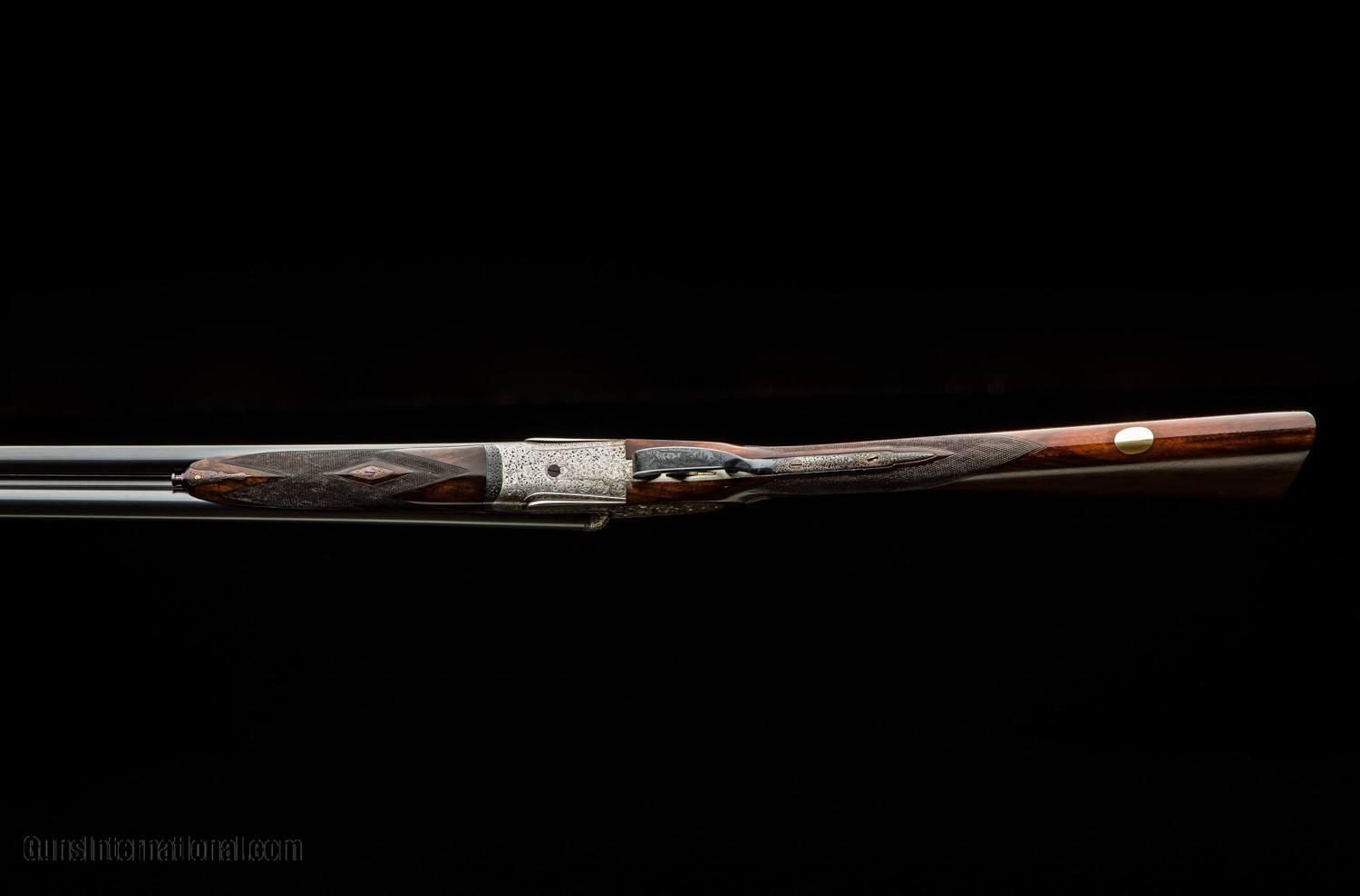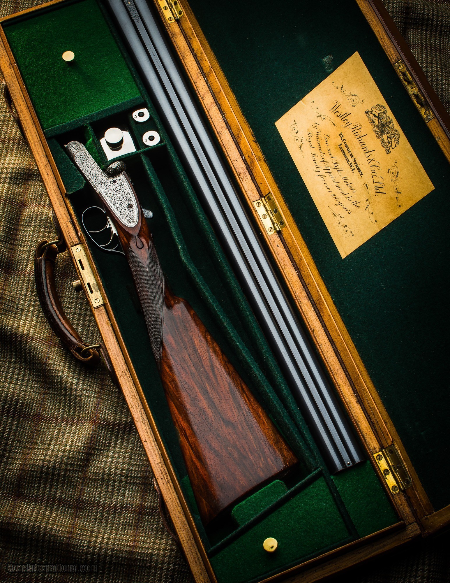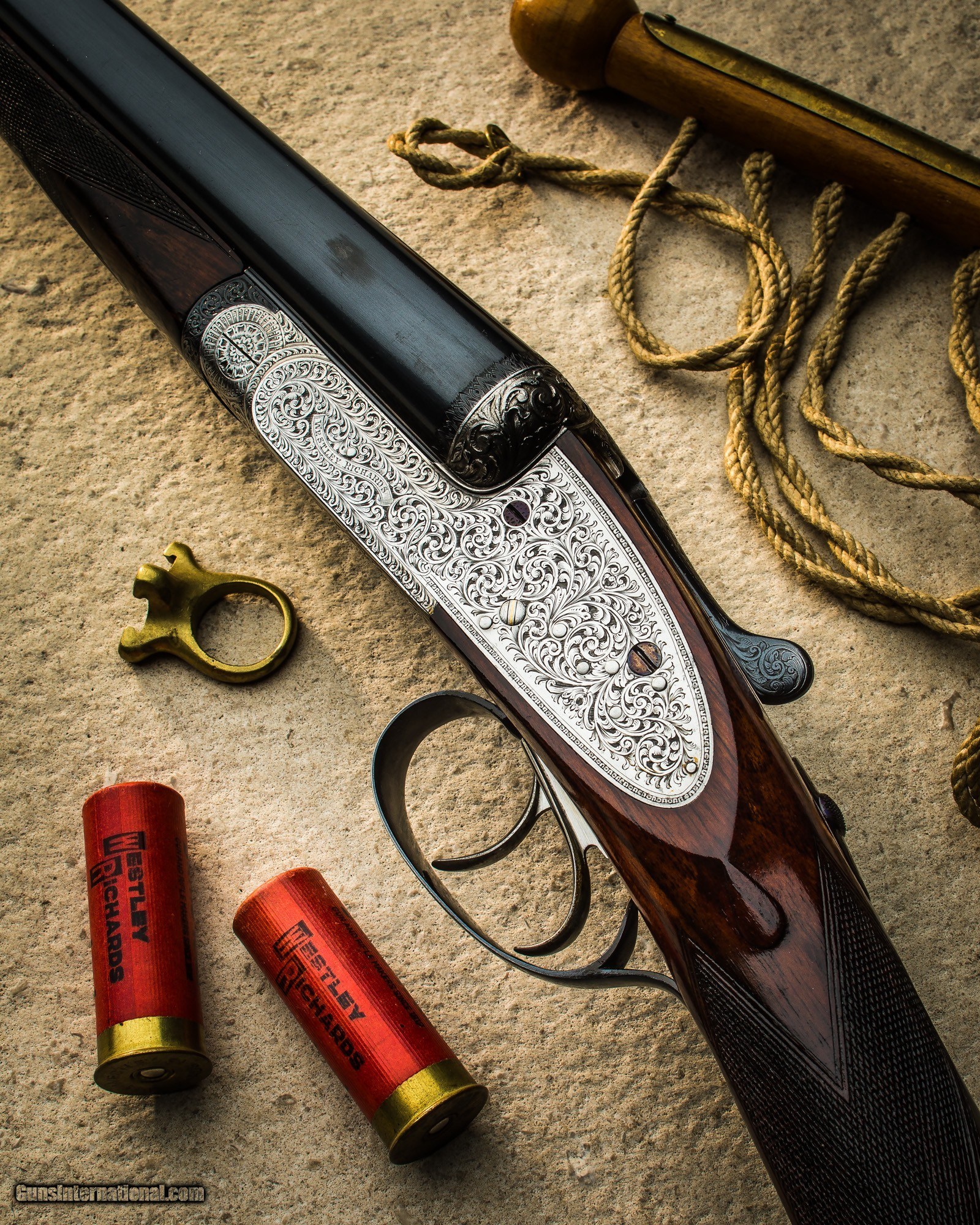 Description: Westley Richards 12g sidelock ejector in excellent condition. Completed in 1917 as the No. 2 of a pair, the gun features a 7 pin sidelock action with double triggers tang top lever and automatic game safe. The action is engraved with a full elaborate scroll coverage, a dog on point on the trigger bow and perfectly executed, deep carved floral fences. The gun was returned to us in 1970 and was rebarreled and restocked. The new chopper lump barrels measure 27 1/2" with 2 3/4" chambers and are choked cylinder and improved cylinder. The straight hand stock measures 14 3/4" to the centre of the butt with a silver oval, drop points and splinter forend. The gun comes in an oak and leather case with Location: UK Make: Westley Richards Calibre/Gauge: 12g Action: Sidelock Triggers: 2 Ejectors: Yes Barrel Length: 27 1/2" Rib: Concave Chamber: 2 3/4" Choke Right: Cylinder Choke Left: IC Stock: Straight LOP: 14 3/4" Weight: 7lbs Case: Maker's Leather This shotgun is located in our Birmingham UK factory and would require importation through our Gulf Breeze, Florida agency, which we would handle. Costs of shipping vary but it would be around $750. There is 2.6% duty to be paid on the value of the shotgun. SOLD |