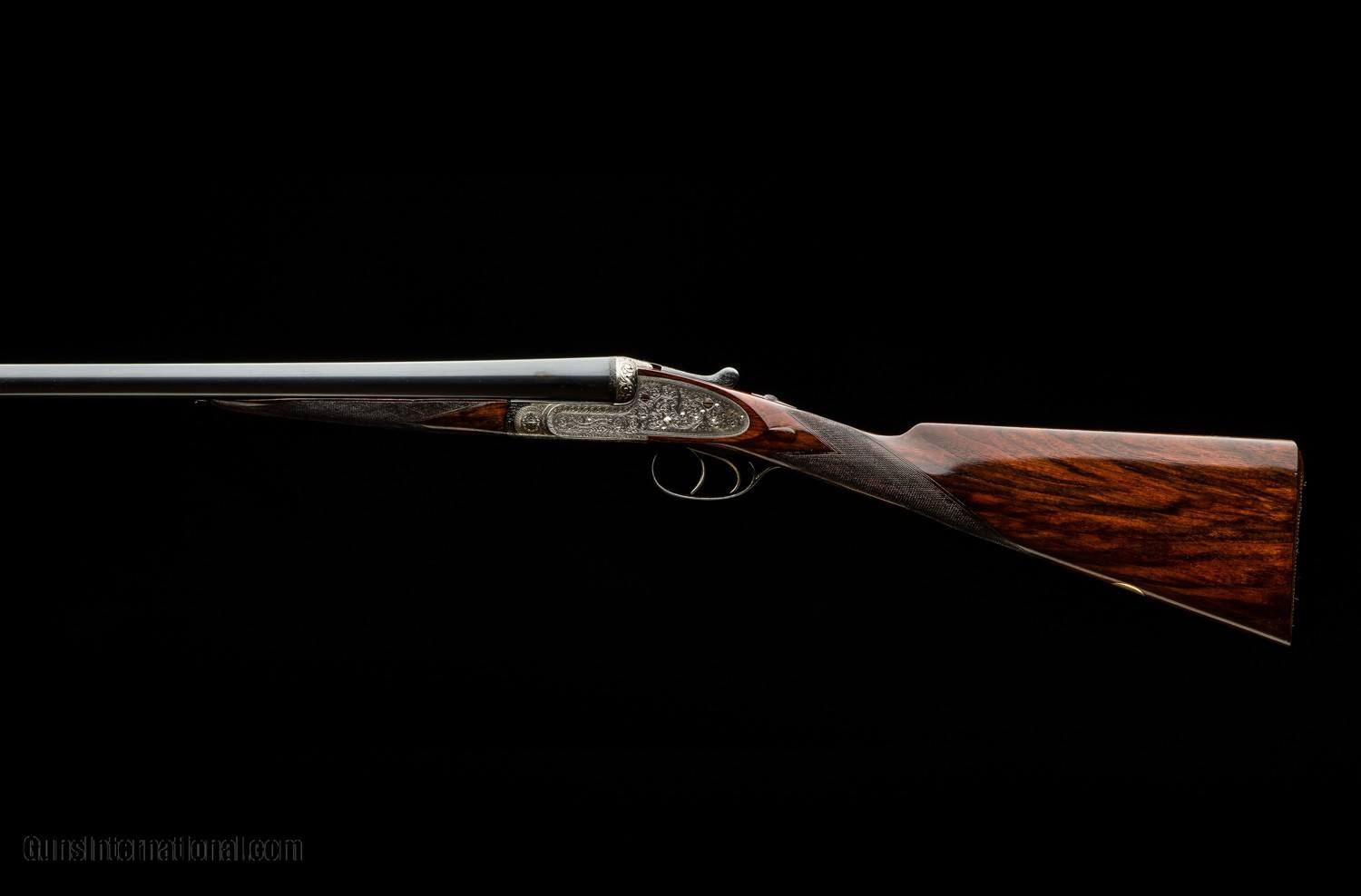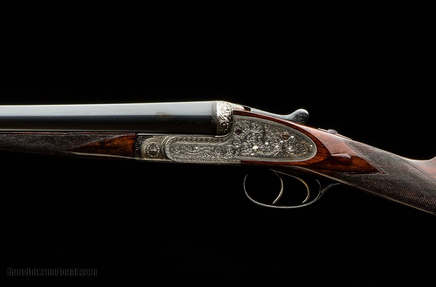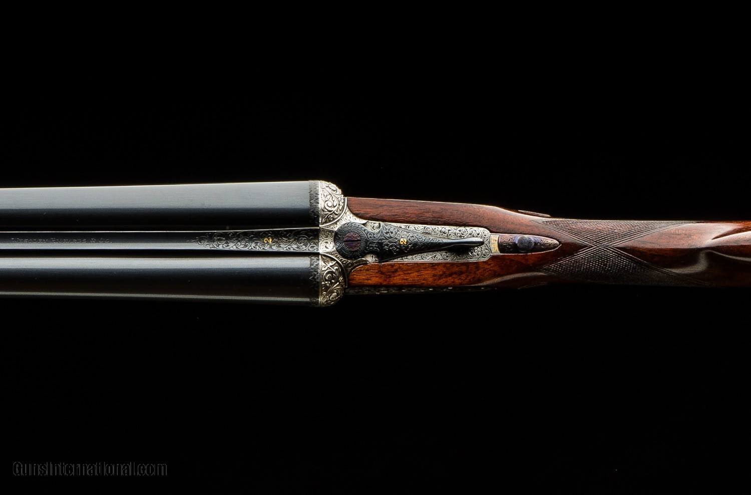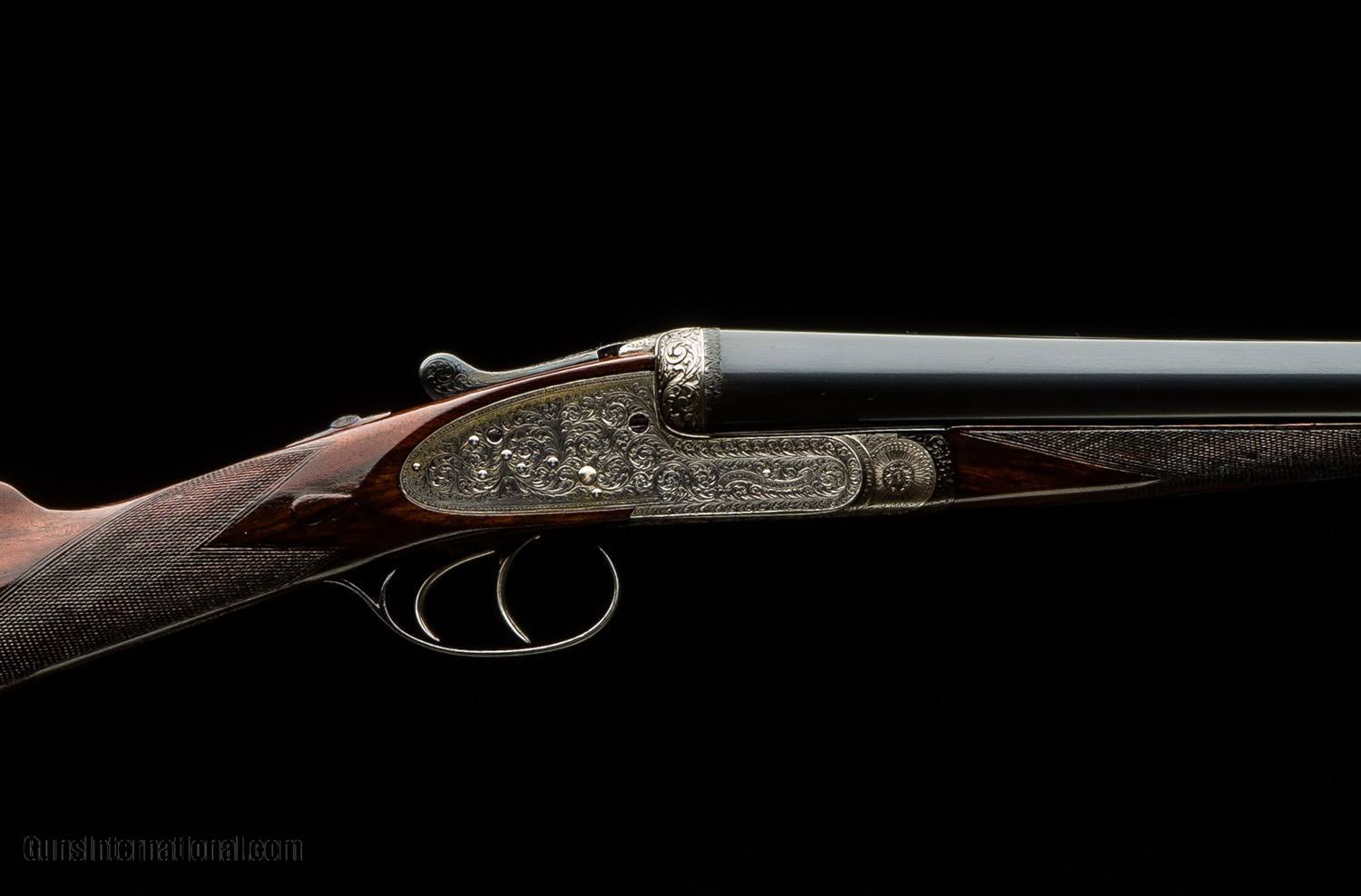 Description: Westley Richards 12g sidelock ejector in excellent condition. Completed in 1917 as the No. 2 of a pair, the gun features a 7 pin sidelock action with double triggers tang top lever and automatic game safe. The action is engraved with a full elaborate scroll coverage, a dog on point on the trigger bow and perfectly executed, deep carved floral fences. The gun was returned to us in 1970 and was rebarreled and restocked. The new chopper lump barrels measure 27 1/2" with 2 3/4" chambers and are choked cylinder and improved cylinder. The straight hand stock measures 14 3/4" to the centre of the butt with a silver oval, drop points and splinter forend. The gun comes in an oak and leather case with Location: UK Make: Westley Richards Calibre/Gauge: 12g Action: Sidelock Triggers: 2 Ejectors: Yes Barrel Length: 27 1/2" Rib: Concave Chamber: 2 3/4" Choke Right: Cylinder Choke Left: IC Stock: Straight LOP: 14 3/4" Weight: 7lbs Case: Maker's Leather This shotgun is located in our Birmingham UK factory and would require importation through our Gulf Breeze, Florida agency, which we would handle. Costs of shipping vary but it would be around $750. There is 2.6% duty to be paid on the value of the shotgun. SOLD |