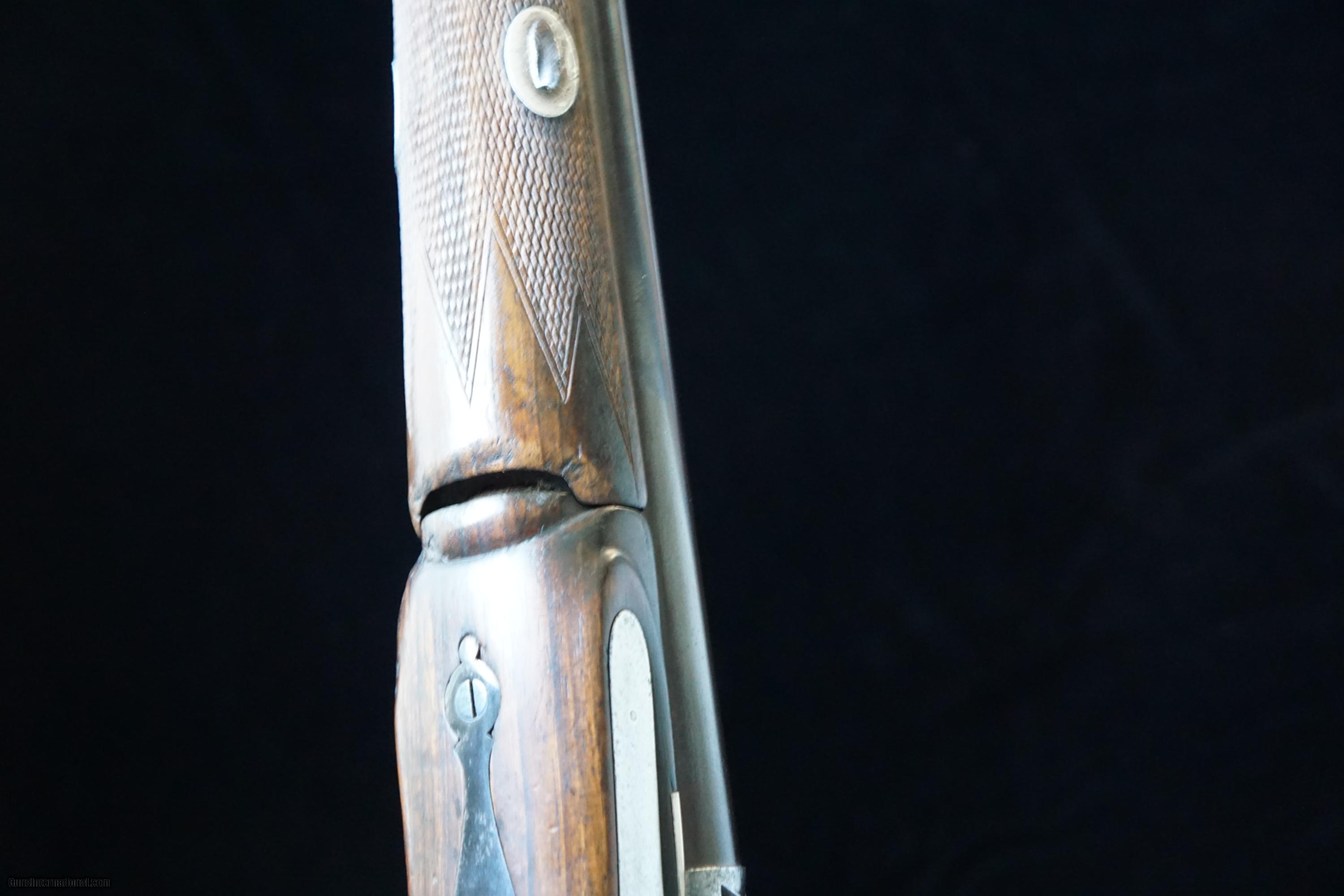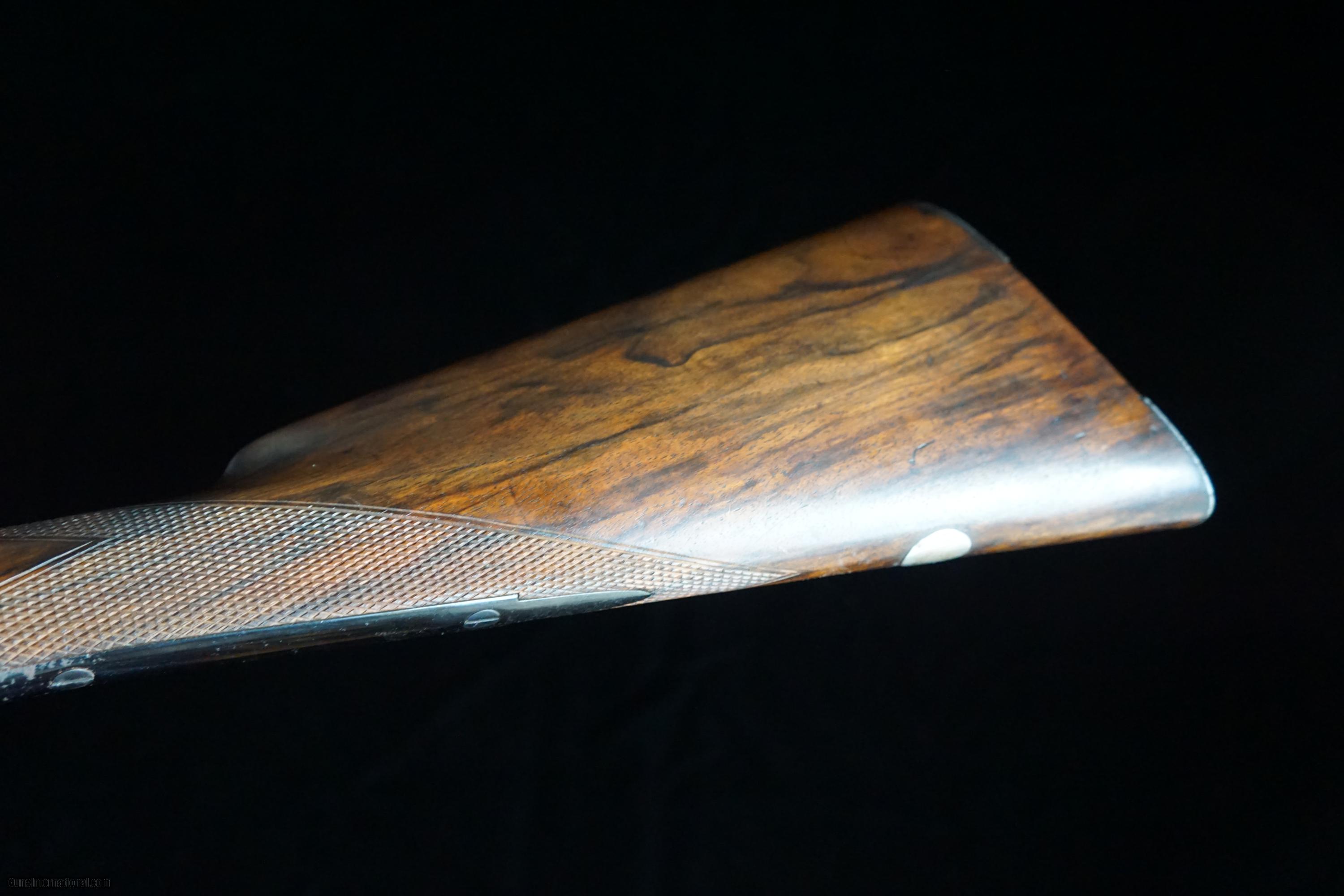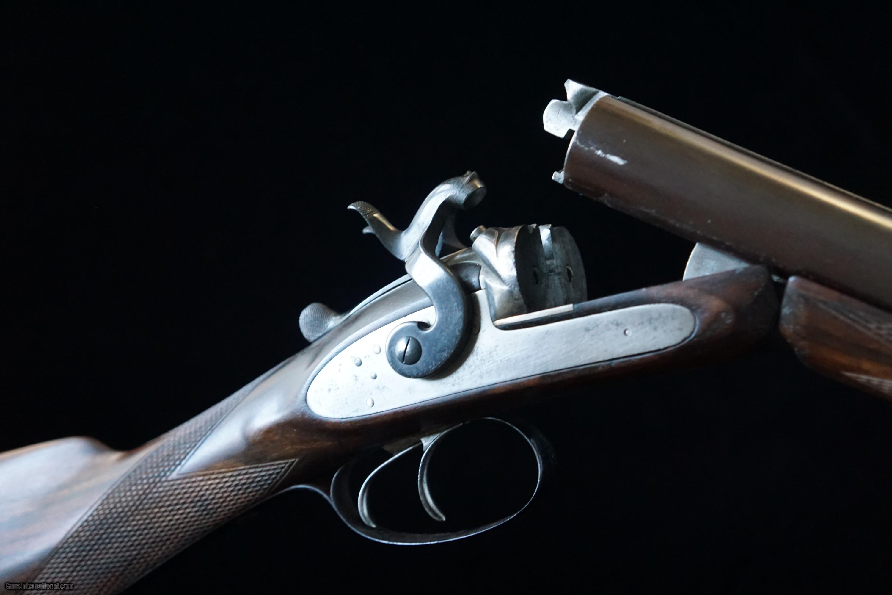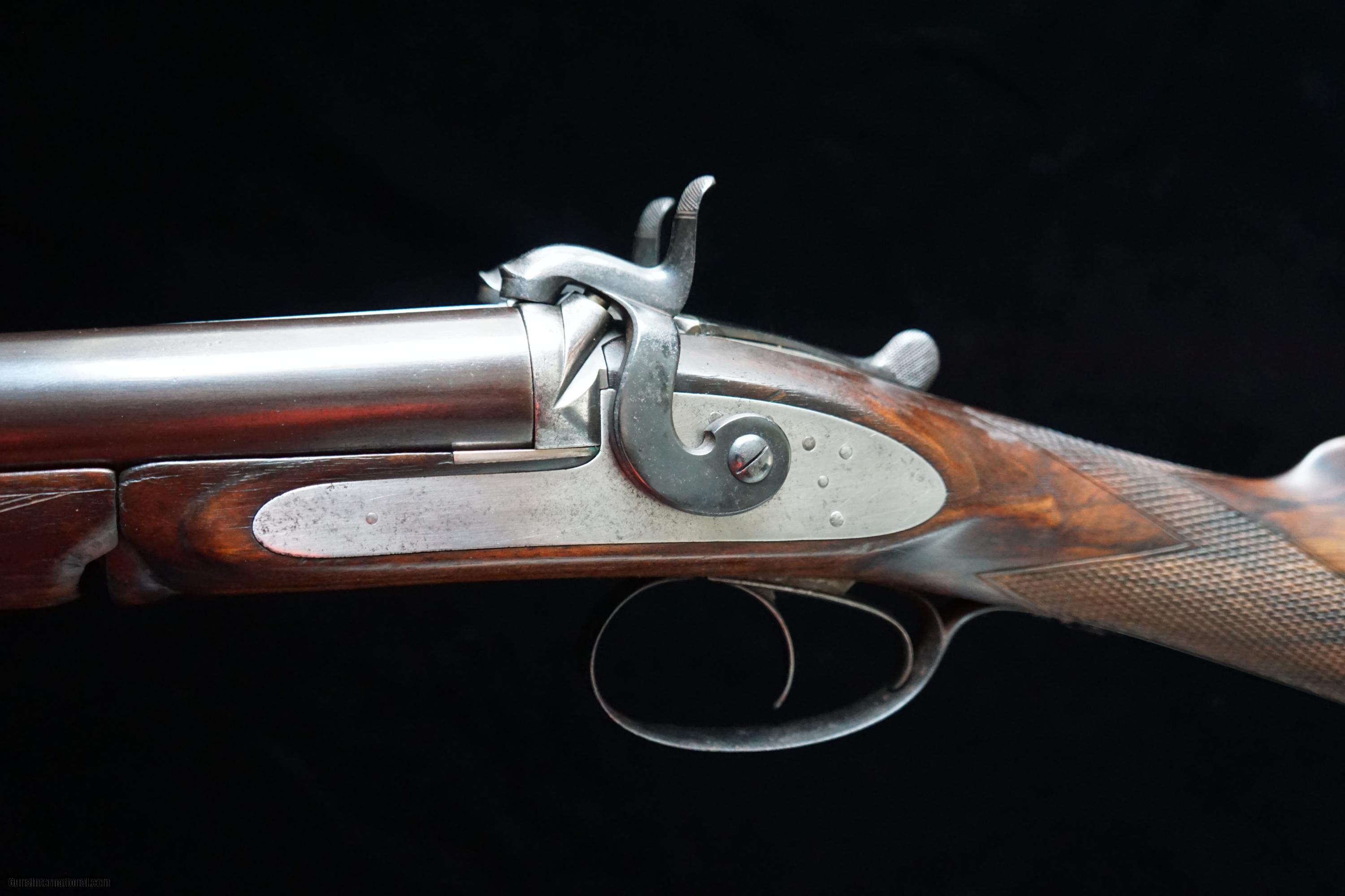 Description: Here is a rare and uinique Westley Richards bar-in-wood from the most fertile and dynamic period of innovation in the British gunmaking industry. This very pretty example was completed in 1872. The barrels (black powder only) are 30" long with 2 1/2" chambers and excellent bores, with 9 thousandths of choke in each. The action features carved teardrop fences, the locks are non-rebounding, and the hammers are of the pinfire type. The gun uses the Westley Richards improved toplever snap action. (The action is ever-so-slightly loose.) The toplever is marked WESTLEY RICHARDS PATENT. The stock is figured walnut with crisp checkering and heel and toe plates. Forend key is slightly bent, and could be easily set right. The stock measures 1 5/8" x 2 1/8" x 13 7/8". The weight is 6 lbs 12 oz. This fine double would make an excellent addition to a collection of early British guns, and it would also be fun to take out in the field to slay a grouse or three. FEEL FREE TO CONTACT ME WITH ANY QUESTIONS, AND PLEASE CHECK MY OTHER LISTINGS OF REASONABLY PRICED BRITISH, CONTINENTAL AND AMERICAN SPORTING ARMS. SHIPPING IS ALWAYS FREE. SOLD Antique: Yes |