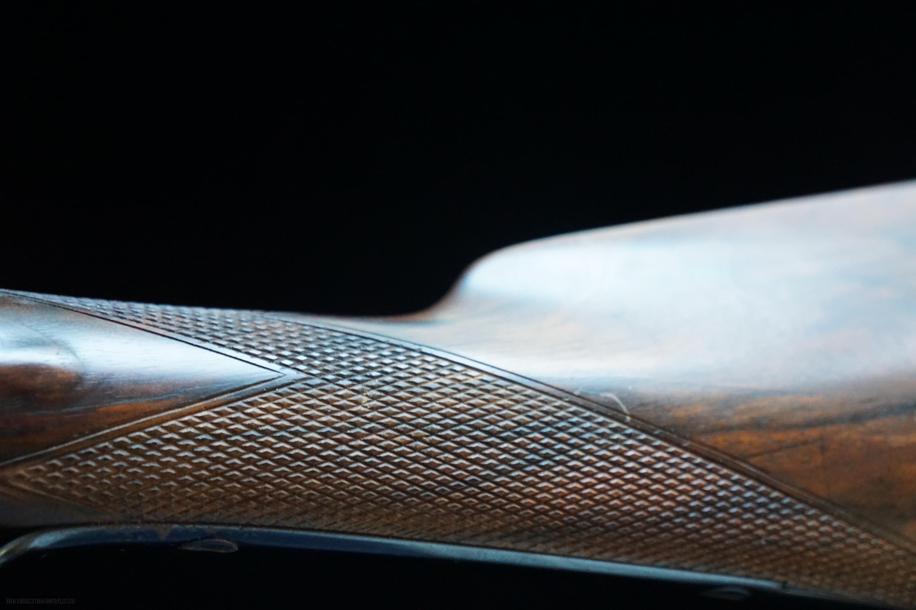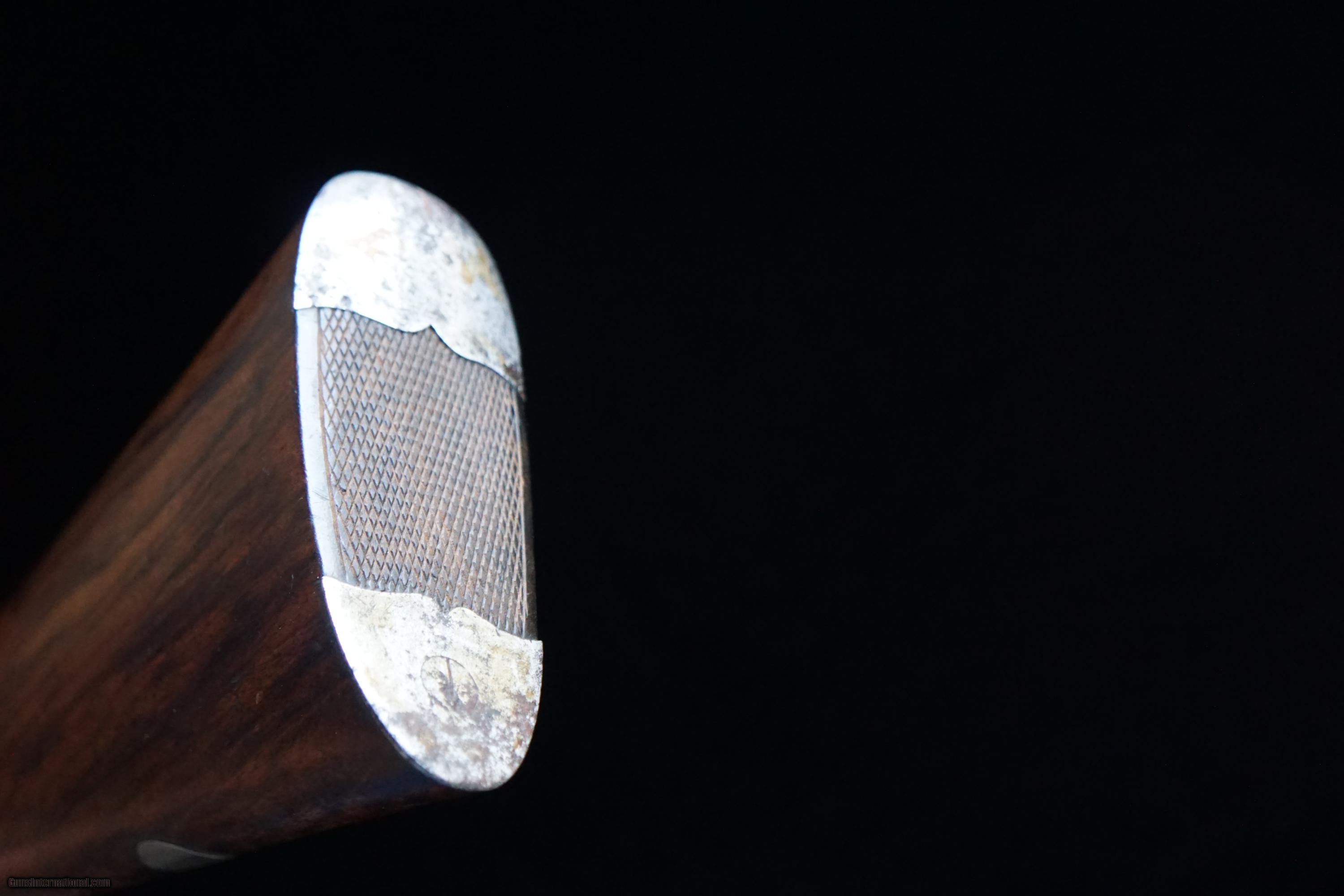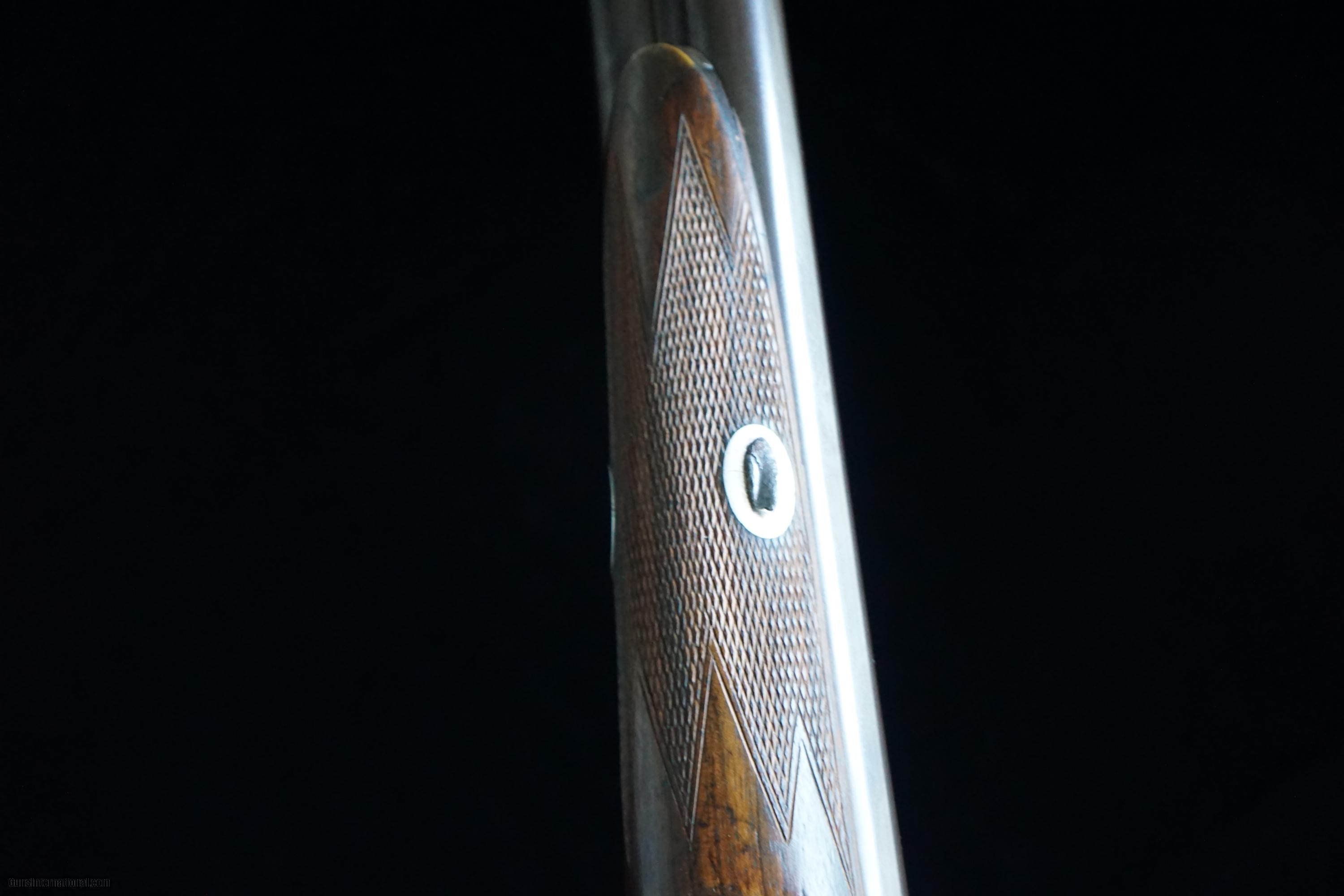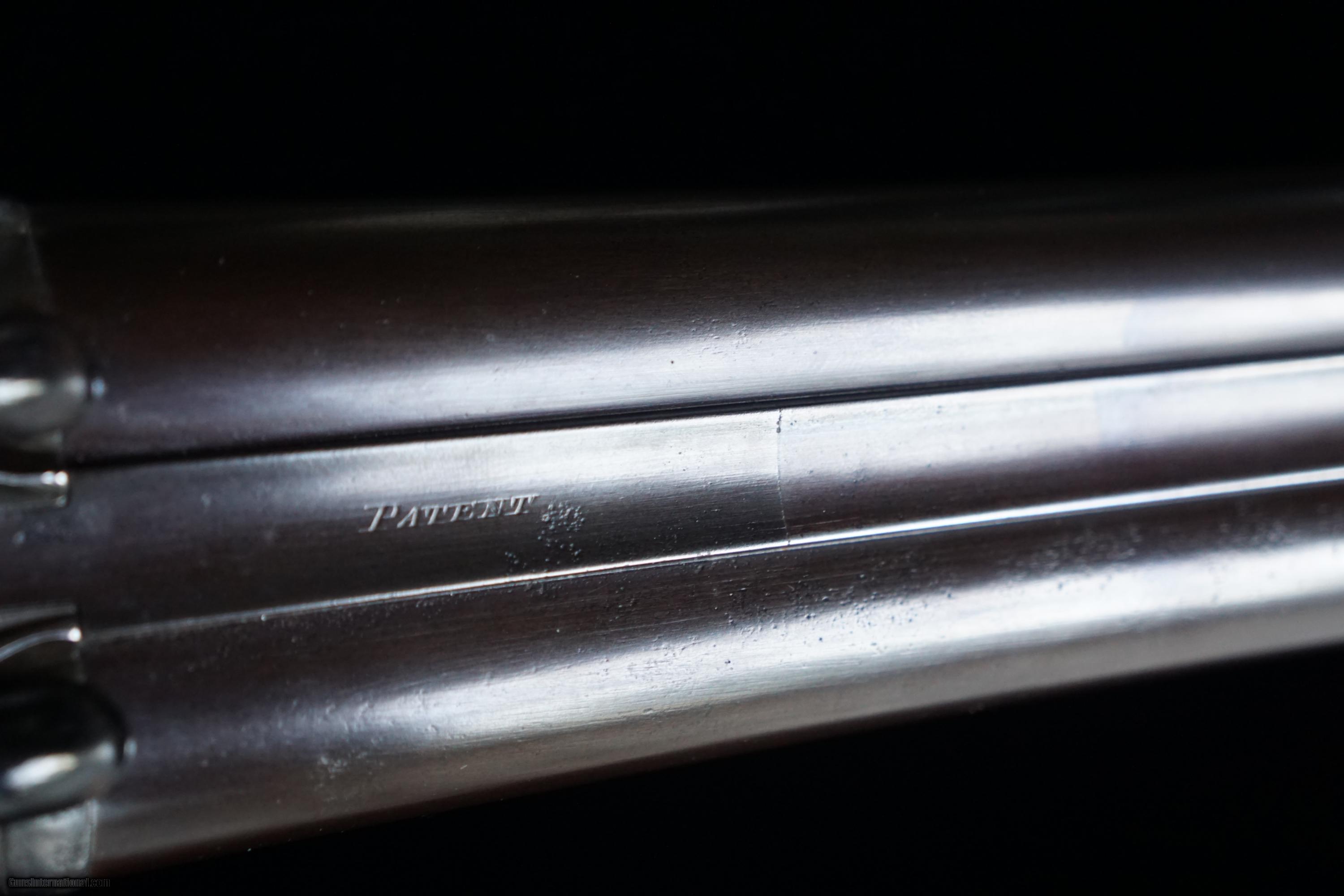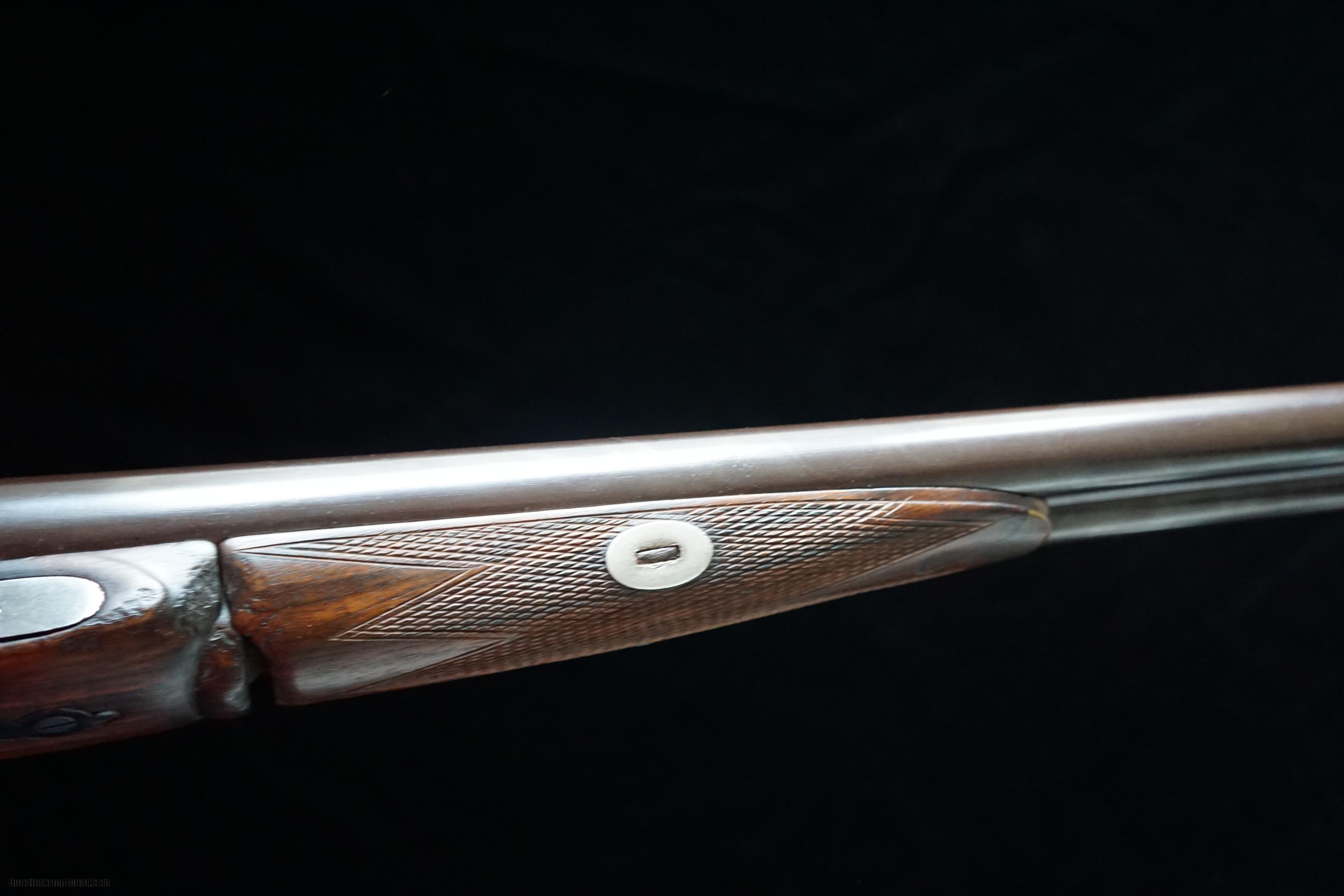 Description: Here is a rare and uinique Westley Richards bar-in-wood from the most fertile and dynamic period of innovation in the British gunmaking industry. This very pretty example was completed in 1872. The barrels (black powder only) are 30" long with 2 1/2" chambers and excellent bores, with 9 thousandths of choke in each. The action features carved teardrop fences, the locks are non-rebounding, and the hammers are of the pinfire type. The gun uses the Westley Richards improved toplever snap action. (The action is ever-so-slightly loose.) The toplever is marked WESTLEY RICHARDS PATENT. The stock is figured walnut with crisp checkering and heel and toe plates. Forend key is slightly bent, and could be easily set right. The stock measures 1 5/8" x 2 1/8" x 13 7/8". The weight is 6 lbs 12 oz. This fine double would make an excellent addition to a collection of early British guns, and it would also be fun to take out in the field to slay a grouse or three. FEEL FREE TO CONTACT ME WITH ANY QUESTIONS, AND PLEASE CHECK MY OTHER LISTINGS OF REASONABLY PRICED BRITISH, CONTINENTAL AND AMERICAN SPORTING ARMS. SHIPPING IS ALWAYS FREE. SOLD Antique: Yes |