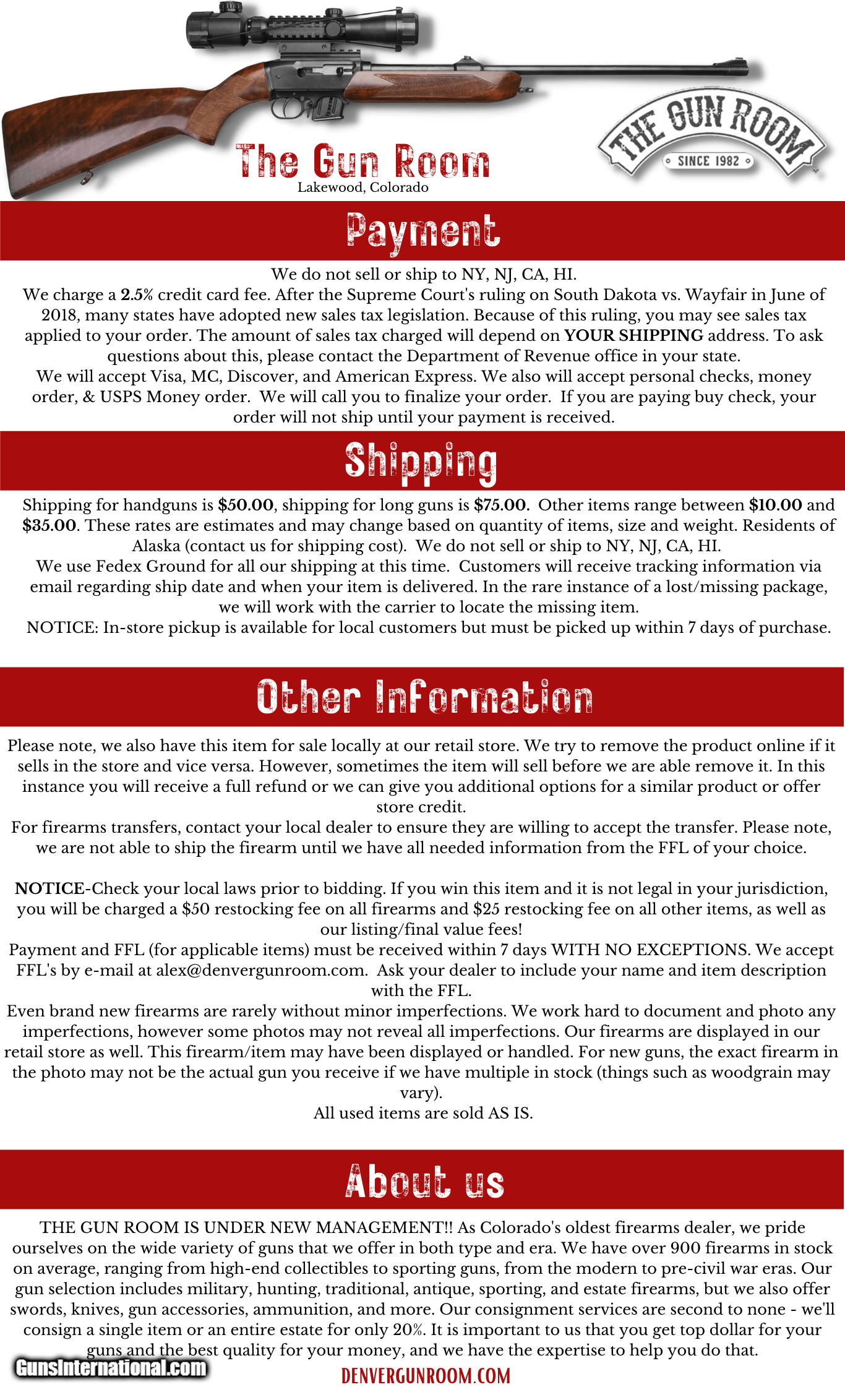 About Us: *We Now Ship to California* Internet sales are managed 10am to 6pm MST, MON-SAT. Our inventory listed for sale is not live, just because you click “BUY NOW” doesn’t mean you have purchased the firearm. We consider a sale final once we have received payment. All our listings are also available for sale in our retail store. Shipping STARTS at $80 for long guns and STARTS at $50 for handguns ***NOTE: IF YOU ACCEPT A GUN TRANSFER, YOU ARE NO LONGER ELIGIBLE FOR A REFUND OR EXCHANGE. We ship to the contiguous United States and Alaska, with some state law restrictions. As Denver's oldest firearms dealer, we have over 1000 firearms in stock on average, ranging from high-end collectibles to sporting guns, from the modern to pre-civil war eras.