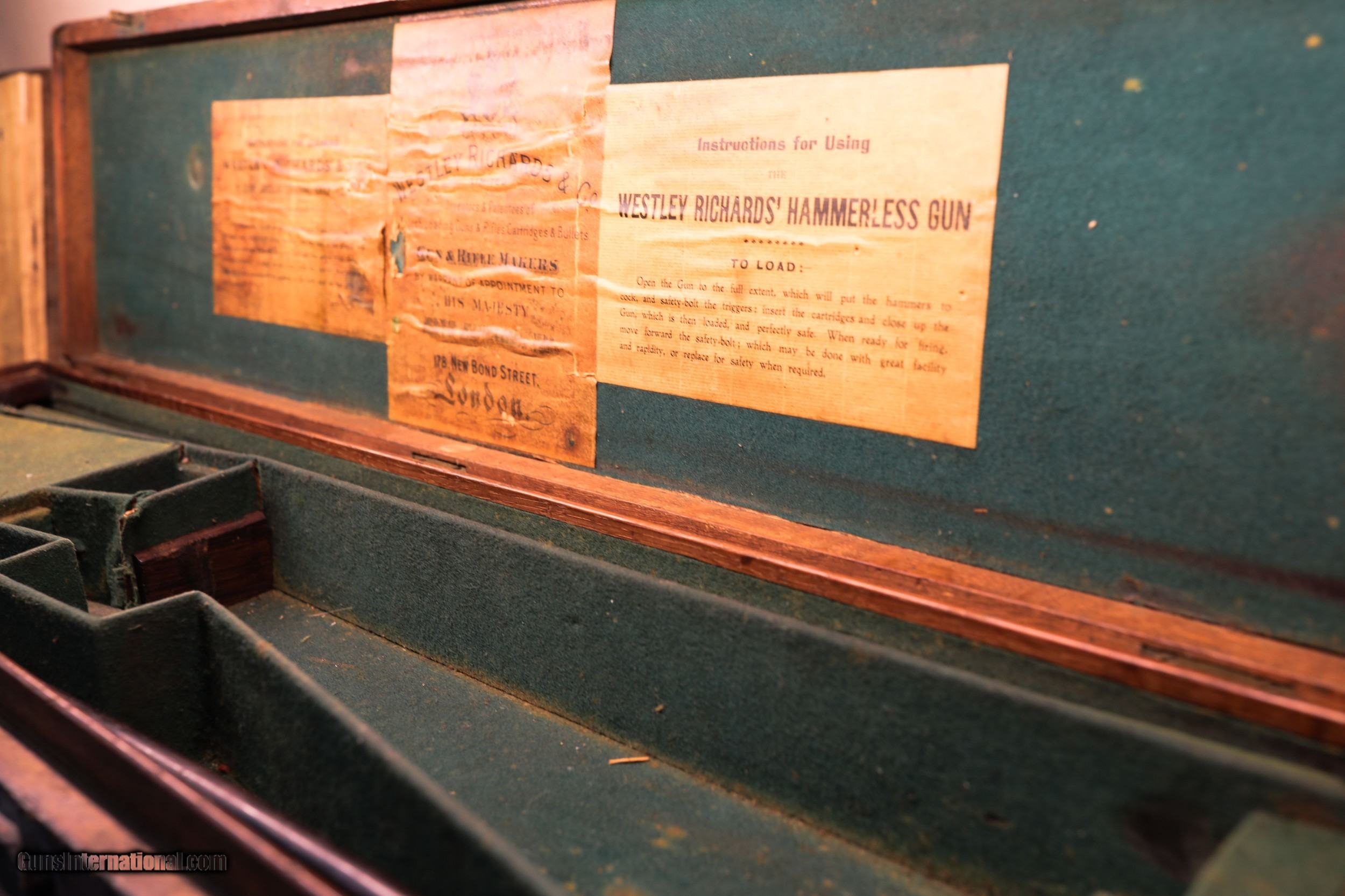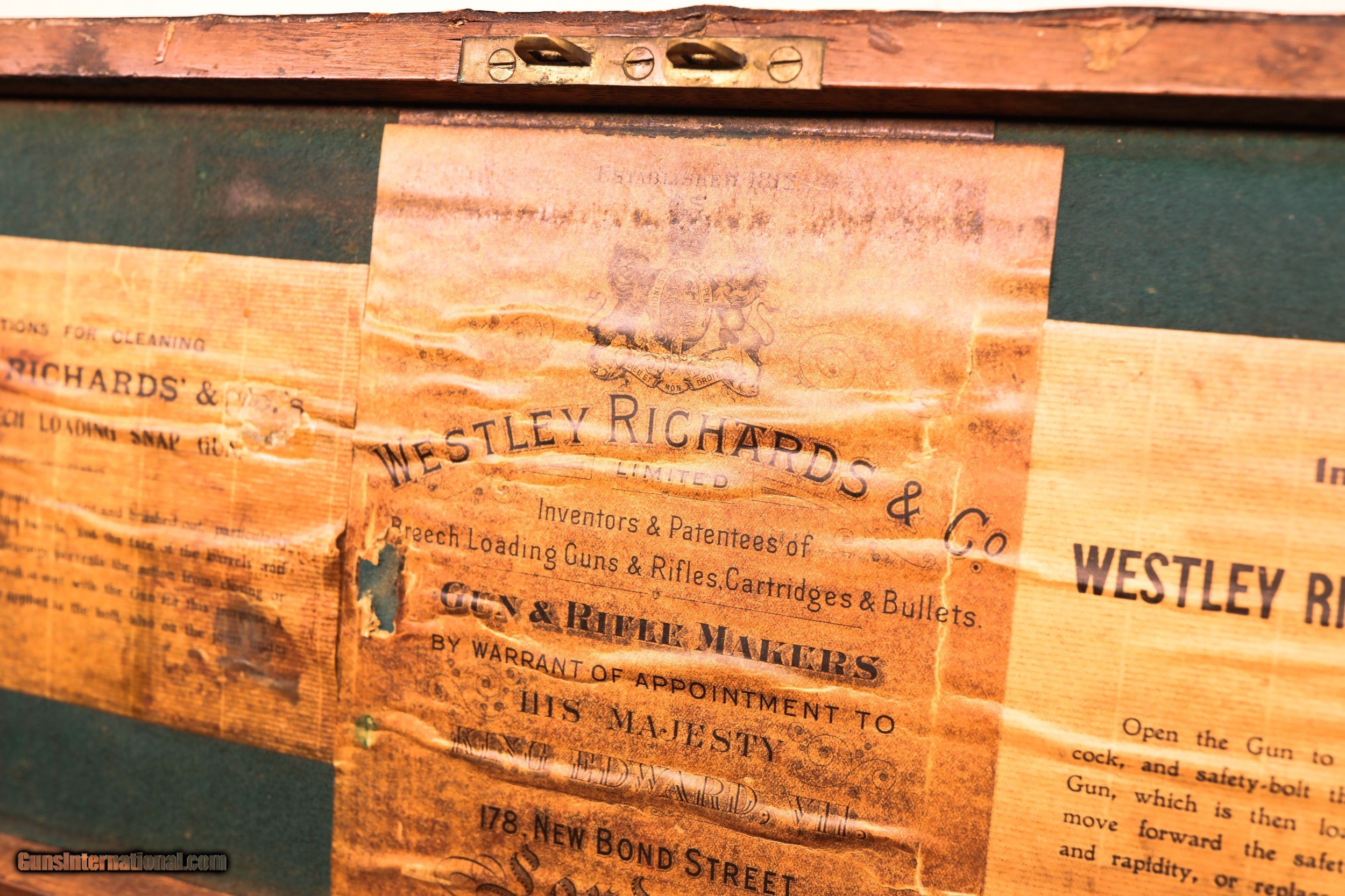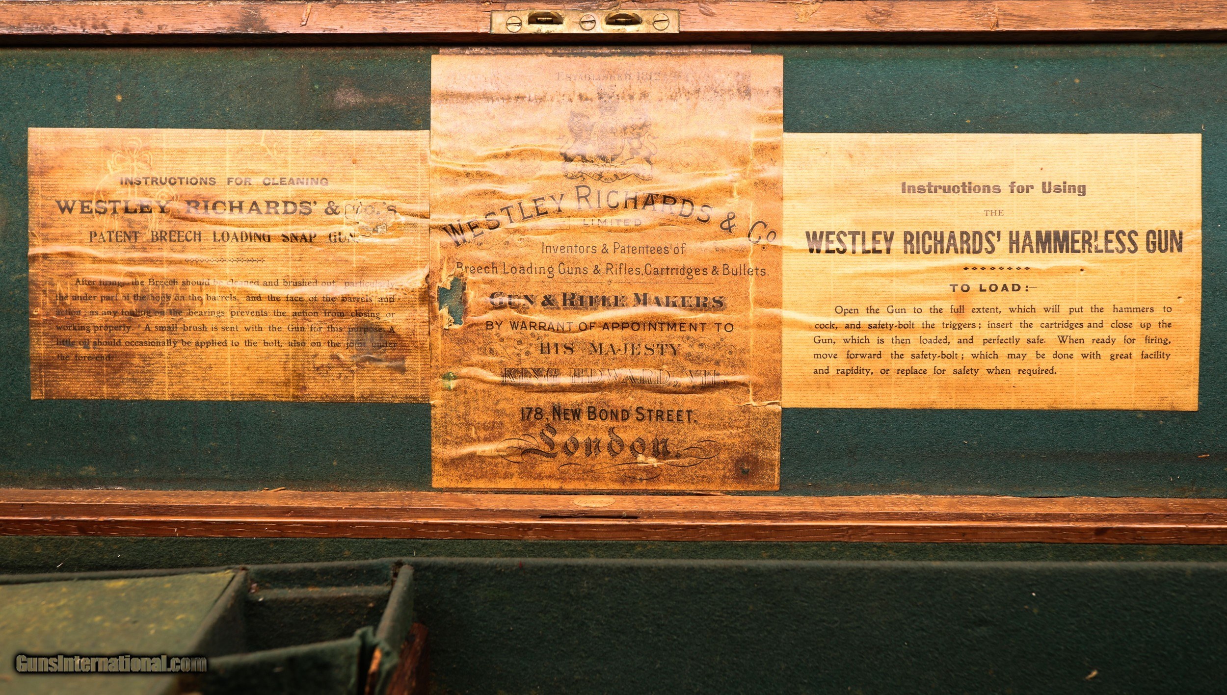 Description: Westley Richards 12Ga Manufactured in 1888 Includes Original Leather Bound Case SOLD Antique: Yes Shotgun Gauge: 12 Gauge Manufacturer: Westley Richards Model: None Marked Serial Number: 14354 Barrel Length: 30 Condition: Excellent Metal Condition: Excellent Wood Condition: Excellent Bore Condition: Great Stock Comb: 1 1/2 Stock Heel: 2 1/8 Stock Cast: Right Hand LOP: 14.25 Choke Left: Imp Mod Choke Right: Cyl Case: Included and Original Item Location: Lakewood, CO |
