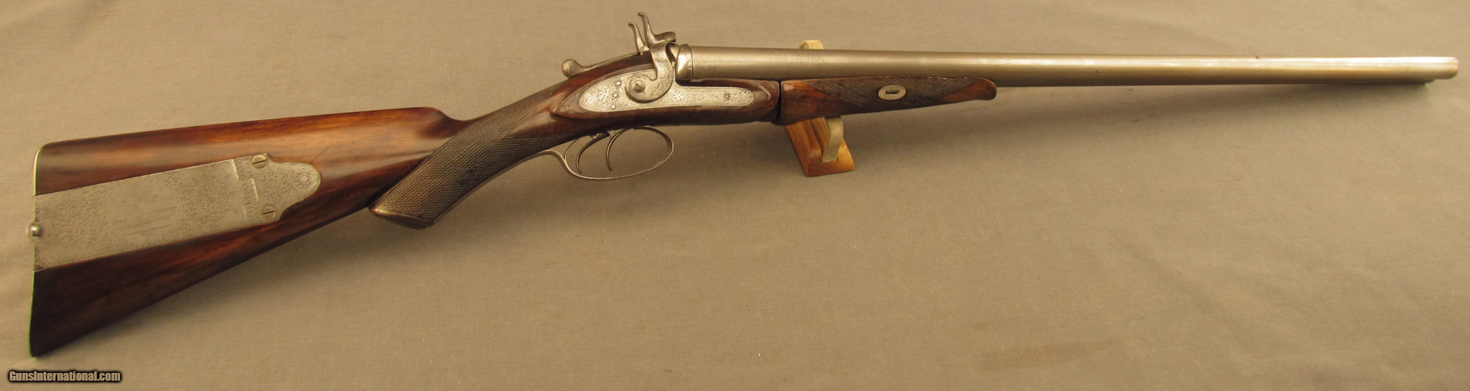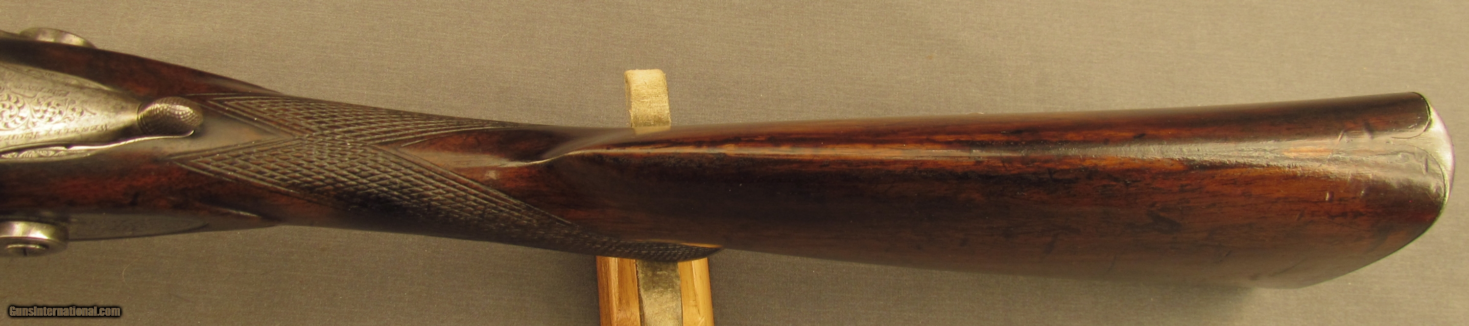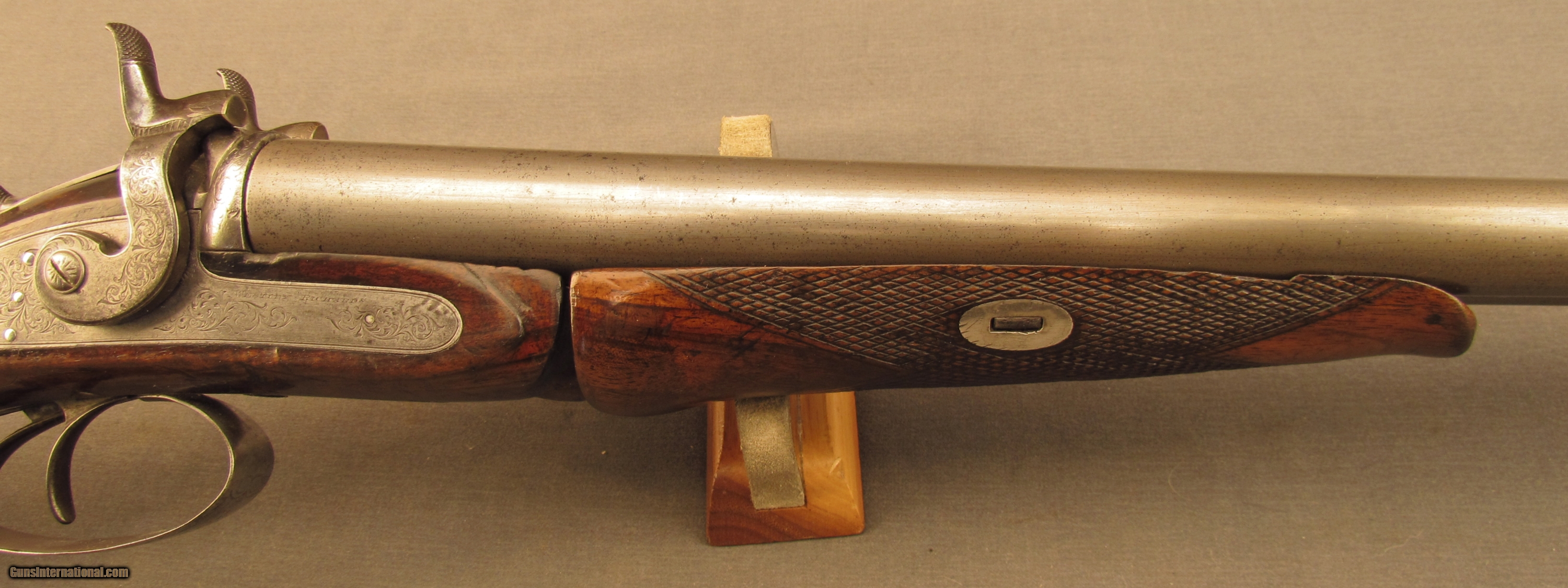 Description: Serial #4262, 12 ga., 28” barrels with very good bores that have light freckling and pitting along their lengths. This is a splendid and interesting gun that began life as a percussion double with large rectangular patchbox on the right side having an engraved standing lion motif. The gun was subsequently converted by Westley Richards to pinfire with the original forend sectioned and reshaped to provide an opening hinge (the barrels are still wedge-fastened), and a Westley Richards marked, pinfire breech-piece was fitted which transformed the original gun into a top lever opening design. The gun was later converted yet again (not by Westley Richards) by filling the original inletting of the pinfire breech with self-contained firing pin assemblies. Likewise, the original pinfire hammers were reshaped at the nose by grinding the pinfire hammers to a blunt tip (which was done for visual identification purposes only, since the hammers themselves contact the firing pins at the rear of the heads where they join the necks). The barrels are worn along the exterior, so there are no longer any discernible maker markings along the barrel rib, however the London proofs and matching serial number are still present on the undersides of the breech. The metal has an overall dull, pewter gray patina with scattered spots of freckling throughout, and some minor areas of pinprick pitting here and there. The English walnut has a fine old oil finish with scattered light handling marks and blemishes scattered throughout, including a small repair on the left side of the buttstock near the toe. The lock-up is still tight and the mechanism is fully functional. This is a very interesting gun that went through three ignition systems during its history, and would make a fantastic addition to any collection. Antique SOLD Antique: Yes Manufacturer: Westley Richards Model: Double Serial Number: 4262 Caliber Info: 12ga Gauge Info: 12ga |