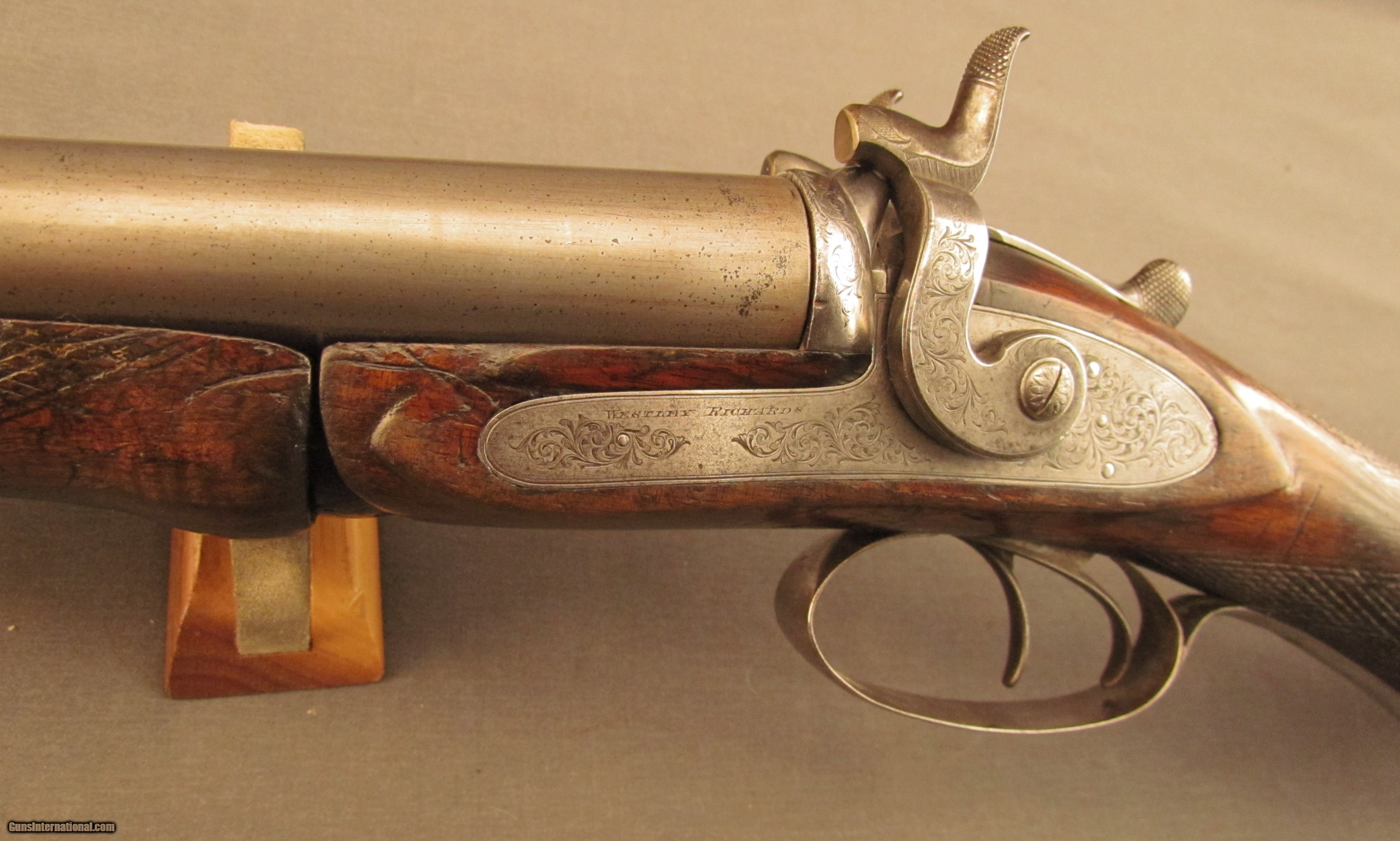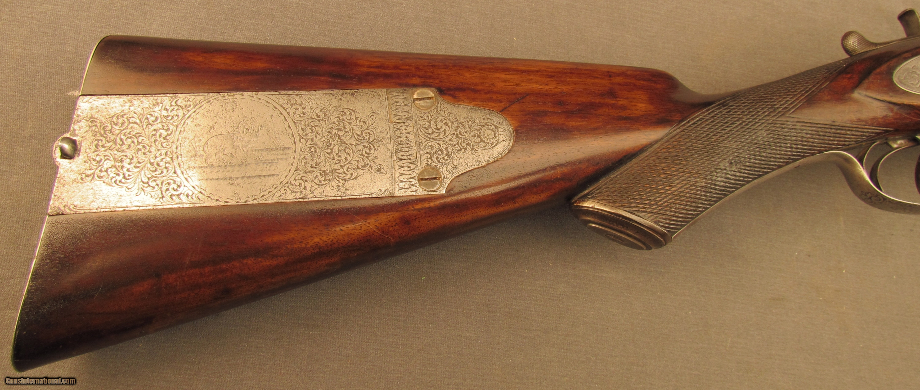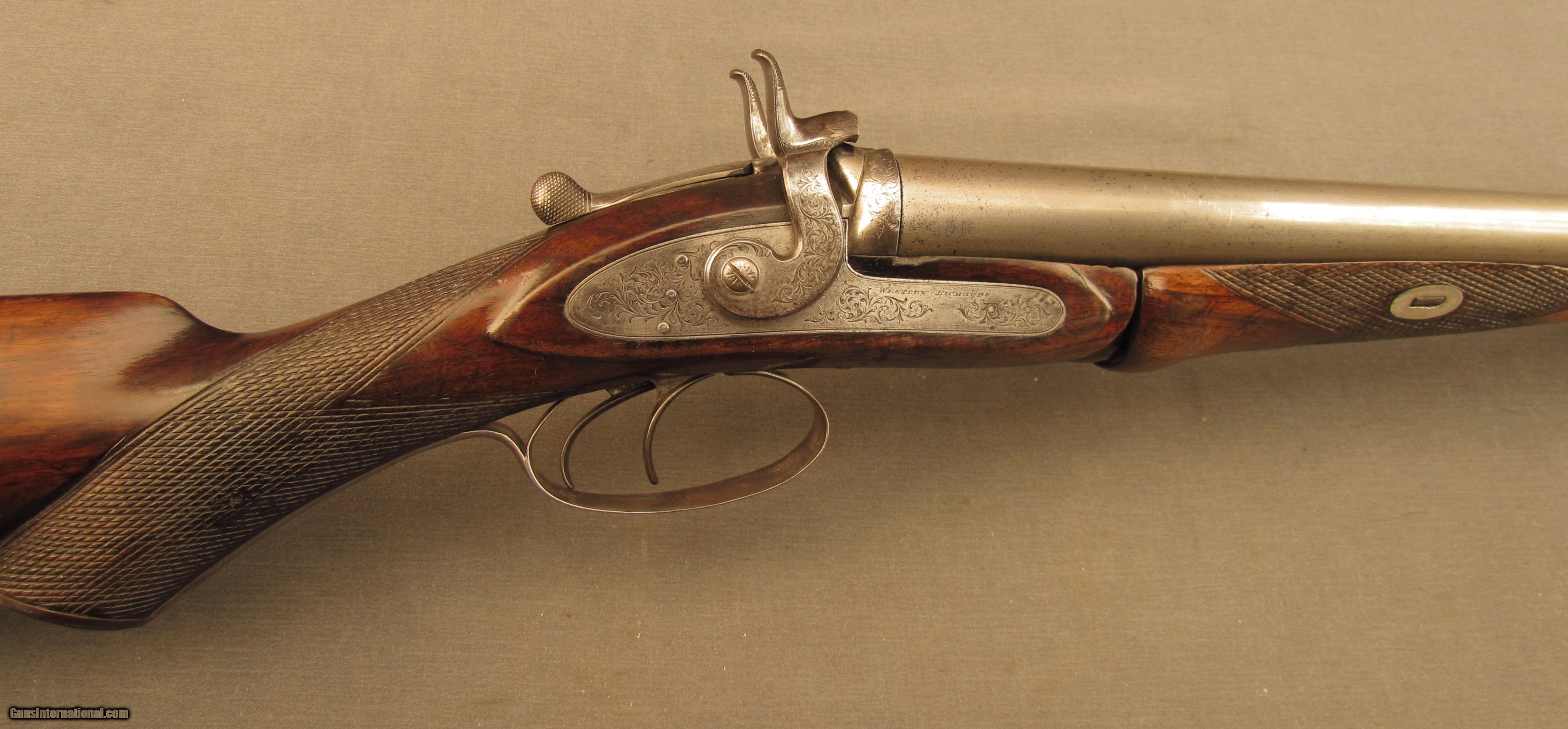 Description: Serial #4262, 12 ga., 28” barrels with very good bores that have light freckling and pitting along their lengths. This is a splendid and interesting gun that began life as a percussion double with large rectangular patchbox on the right side having an engraved standing lion motif. The gun was subsequently converted by Westley Richards to pinfire with the original forend sectioned and reshaped to provide an opening hinge (the barrels are still wedge-fastened), and a Westley Richards marked, pinfire breech-piece was fitted which transformed the original gun into a top lever opening design. The gun was later converted yet again (not by Westley Richards) by filling the original inletting of the pinfire breech with self-contained firing pin assemblies. Likewise, the original pinfire hammers were reshaped at the nose by grinding the pinfire hammers to a blunt tip (which was done for visual identification purposes only, since the hammers themselves contact the firing pins at the rear of the heads where they join the necks). The barrels are worn along the exterior, so there are no longer any discernible maker markings along the barrel rib, however the London proofs and matching serial number are still present on the undersides of the breech. The metal has an overall dull, pewter gray patina with scattered spots of freckling throughout, and some minor areas of pinprick pitting here and there. The English walnut has a fine old oil finish with scattered light handling marks and blemishes scattered throughout, including a small repair on the left side of the buttstock near the toe. The lock-up is still tight and the mechanism is fully functional. This is a very interesting gun that went through three ignition systems during its history, and would make a fantastic addition to any collection. Antique SOLD Antique: Yes Manufacturer: Westley Richards Model: Double Serial Number: 4262 Caliber Info: 12ga Gauge Info: 12ga |