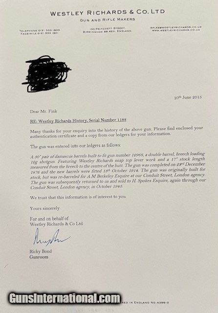 Description: All proceeds from the sale of this beautiful Westley Richards 12ga 25” Side by Side will be donated to Bonefish & Tarpon Trust. This gun has been inspected by renowned gunsmith Mark Novak and in complete proper working order. Bonefish & Tarpon Trust's mission is to conserve bonefish, tarpon, and permit—the species, their habitats and the larger fisheries they comprise. BTT pursues this mission through science-based conservation, education, and advocacy across Florida, The Bahamas, Belize and Mexico, as well as in coastal states from Texas to Virginia. Learn more at: BTT. We will ship for free to your nearest FFL. Feel free to message us at anytime with any questions you may have or to make an offer. We also provide a 3% discount if you pay with a check/money order and do not charge out of state taxes. -Manufacturer: Westley Richards -Model: Box Lock SXS -Serial Number: 1188 -Used -Gauge/Caliber: 12 Gauge -Chamber Size: 2 ½”- 3” -Year Manufactured: 1876 -Barrel Length: 25” -SXS Right Barrel Marking: “Westley Richards” “Sleeved” -SXS Left Barrel Marking: “Westley Richards” Sleeved” -Hand: Neutral -Length of Pull: 14 7/8” -Drop at Comb: 1 ¾” -Drop at Heel: 2 ½” -Fixed Chokes SXS: Right barrel- MOD & Left Barrel- FULL -Ejectors: Yes -Trigger Type: Double Trigger -Stock Type: Prince of Wales -Receiver Finish: Case Color -Weight: 6lbs 10oz -Country of Origin: Birmingham, England -Action: Break Action -Stock/Forend Finish Originality: To our knowledge we do not know if the stock/forend has been refinished but it does have a newer butt pad which indicates the stock could have been refinished at some point in time but we cannot confirm this. -Receiver Finish Originality: Original -Barrel Finish Originality: This gun was re-fitted with 30” steel proofed barrels by Westley Richards. The original barrels were Damascus. The re-fitted steel proofed barrels were cut down to 25” barrels at some point in time. -Bore Condition: Good -Items the Firearm comes with: Pictures of original logbook from Westley Richards with SN# 1188, Westley Richards Research Letter and Certificate, and a leaver break down case. -Current Damages Explained: Minor scratching and handling marks on both sides of stock. Some scratches are a little deeper than surface scratching but no major dents/dings. -Barrel Damages: There are a few spots where the bluing is worn and some slight scratching on both sides of the barrels. No major damage, just normal wear. -Dents or Deep Gouges: NONE -Rust or Corrosion: NONE -Firearm Condition: -Good: In safe working condition, minor wear on working surfaces, no broken parts, may have minor fading on some metal surfaces, may have minor corrosion, or may have minor pitting, may have minor scratches or wear on stock/forend. All cosmetic and nothing that will interfere with proper functioning. This gun has been inspected by renowned gunsmith Mark Novak and in complete proper working order. The shotgun built in 1876 was a box lock action, a relatively new concept at the time. While the Anson & Deeley box lock design—developed in 1875 by two Westley Richards employees—was still in its infancy, it revolutionized break-action shotguns by housing the firing mechanism within the body (or “box”) of the action, instead of external hammers. This design offered cleaner lines, improved reliability, and easier maintenance. This 1876 Westley Richards shotgun would have been among the early adopters of this now-classic box lock system. Typically chambered for black powder shells and featuring fine English walnut stocks, fine engraving, and robust Damascus barrels, these guns were built to endure and perform in the field or at the estate shoot. The 1876 box lock model remains a historically significant piece, representing a critical evolution in sporting arms and the beginning of one of the most enduring shotgun action designs in history. Collectors prize these early models today not just for their craftsmanship, but for their place at the crossroads of tradition and innovation in British gun making. SOLD Shotgun Gauge: 12 Gauge Manufacturer: Westley Richards Model: Box Lock Serial Number: 1188 Barrel Length: 25 Condition: USED |
