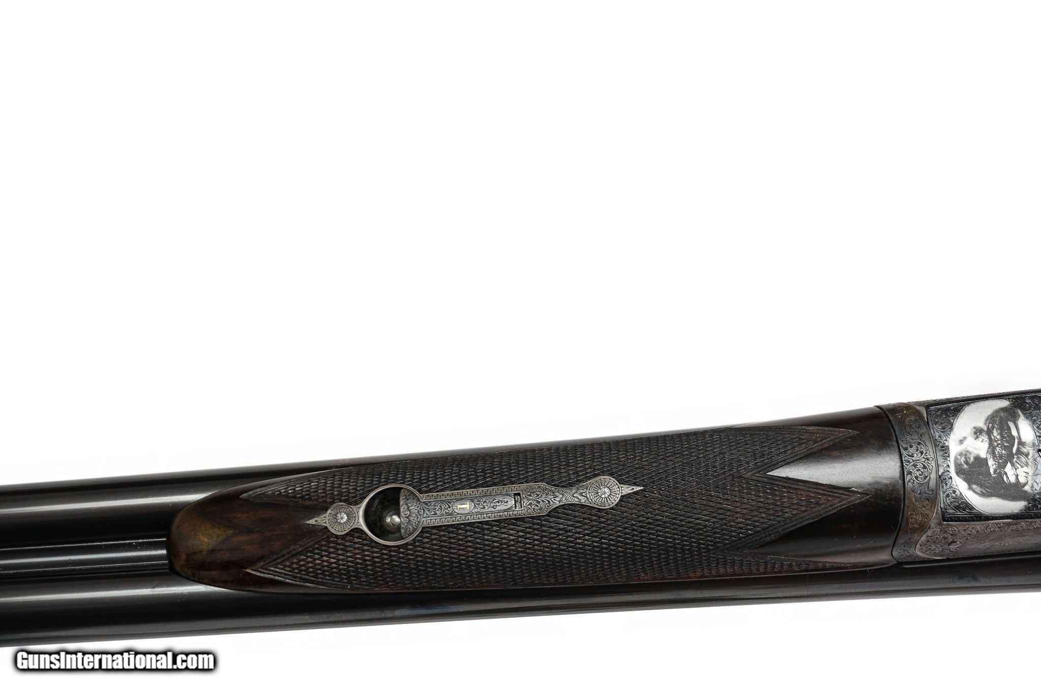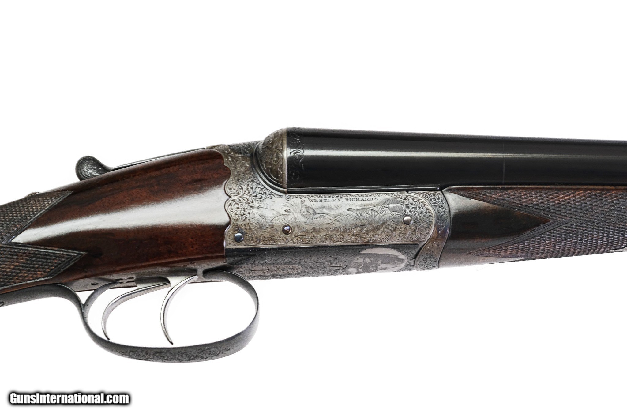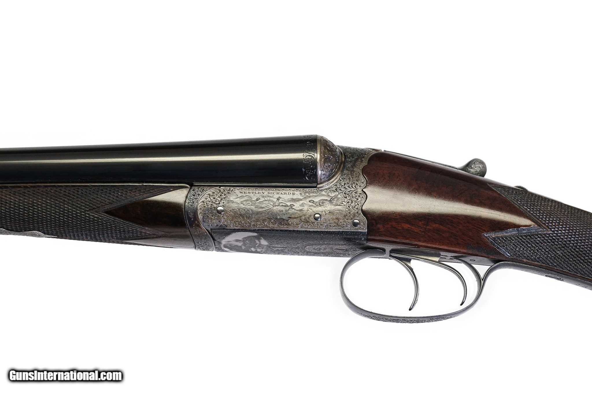 Description: Westley Richards - Boxlock, SxS, 12ga. 28" Barrels Choked M/M. Splintered forend, straight grip, kickeez recoil pad, double trigger, automatic ejector. Wesley Richards patented ejector and top lever. This is gun #1 of a pair, marked Wesley Richards of London. This gun has gone through an extensice restoration with 100% case color barrel blue and finish it is a scalloped and rebated frame with highely detailed game scenes of pheasants patridiged and a magnificent bolia dog head on the frame. Very high quality gun. Inv: 79245 6 lbs. 8 oz. 15 ¼" x 1 ½" x 2 3/8" $3,995.00 SOLD |