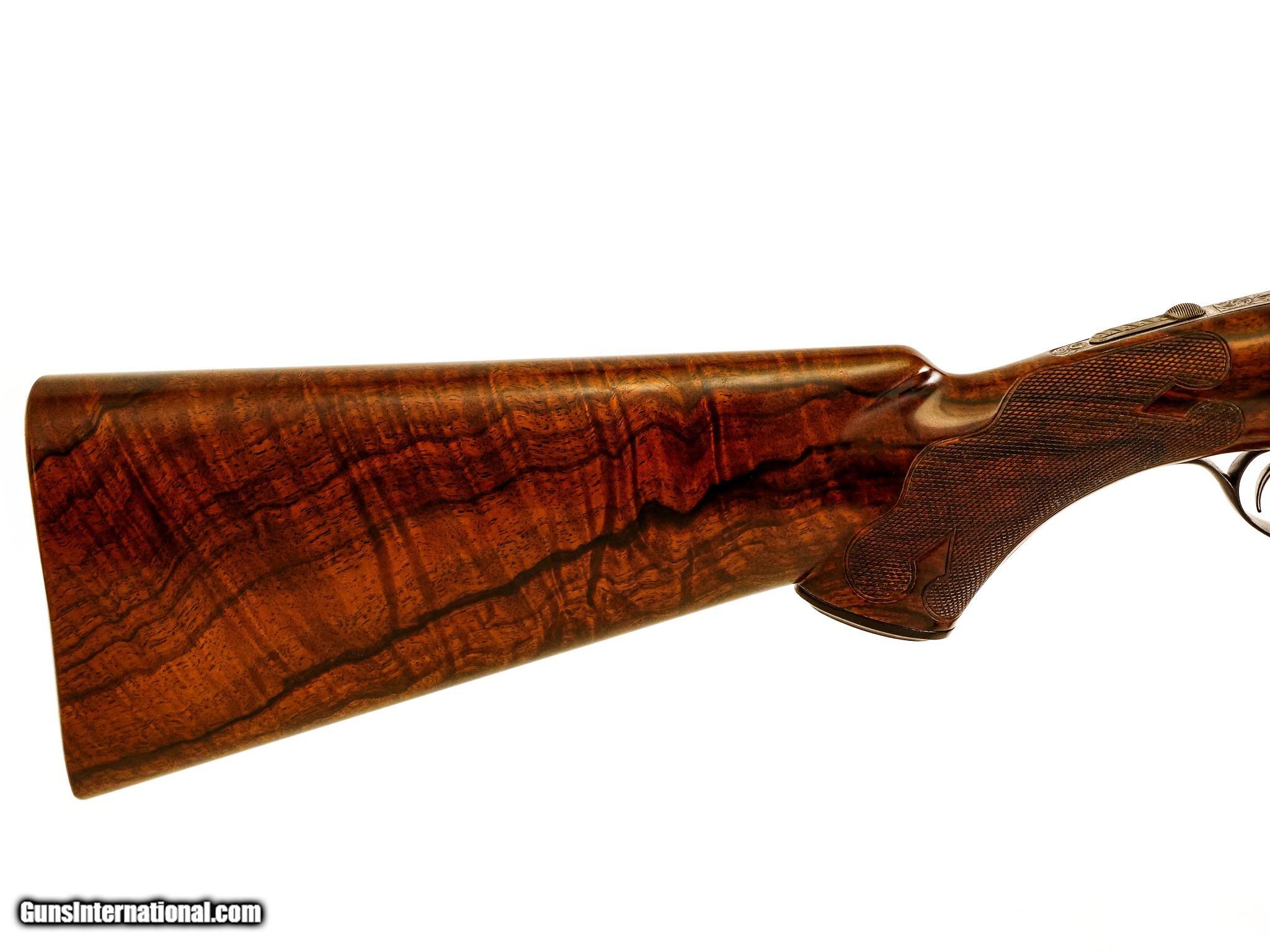 Description: Westley Richards - Boxlock, SxS, 16ga. 26" Barrels Choked IC/M. Barrels choked IC/Mod, beautiful circassian Turkish walnut capped pistol grip stock, checkered butt, beavertail forend, double triggers, automatic ejectors, solid game rib, crossbolt lockup, side clips, drop points on stock, absolutely gorgeous deep scroll engraving with WESTLEY RICHARDS & CO in ribbons, wedges engraved on breeches of barrels, wood and checkering in excellent condition, perfect and sharp engraving, strong case coloring, a great 16ga. lightweight game gun, available for immediate delivery. S & H - $50.00. Inv: 52096 5 lbs. 14 oz. 14 1/8” x 1 ½” x 2 ½” $12,995.00 SOLD |