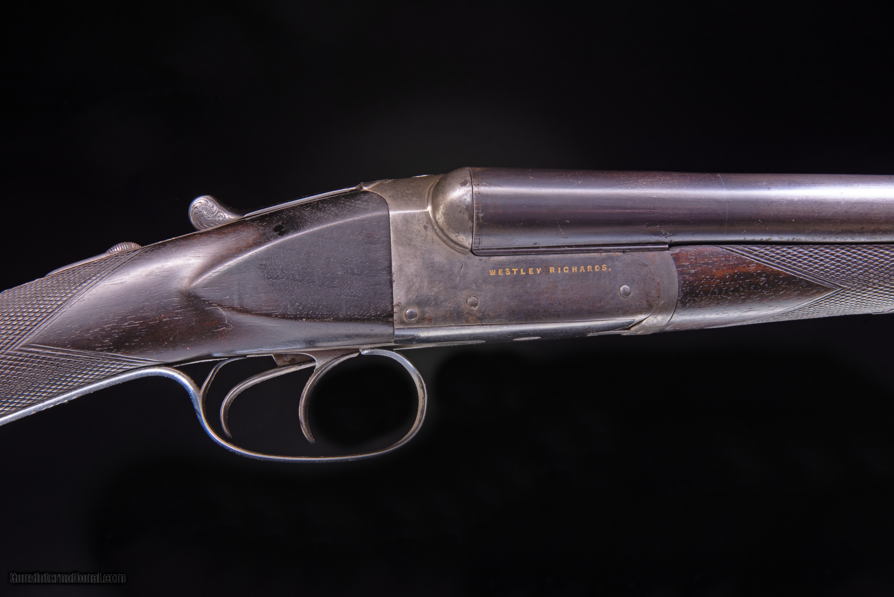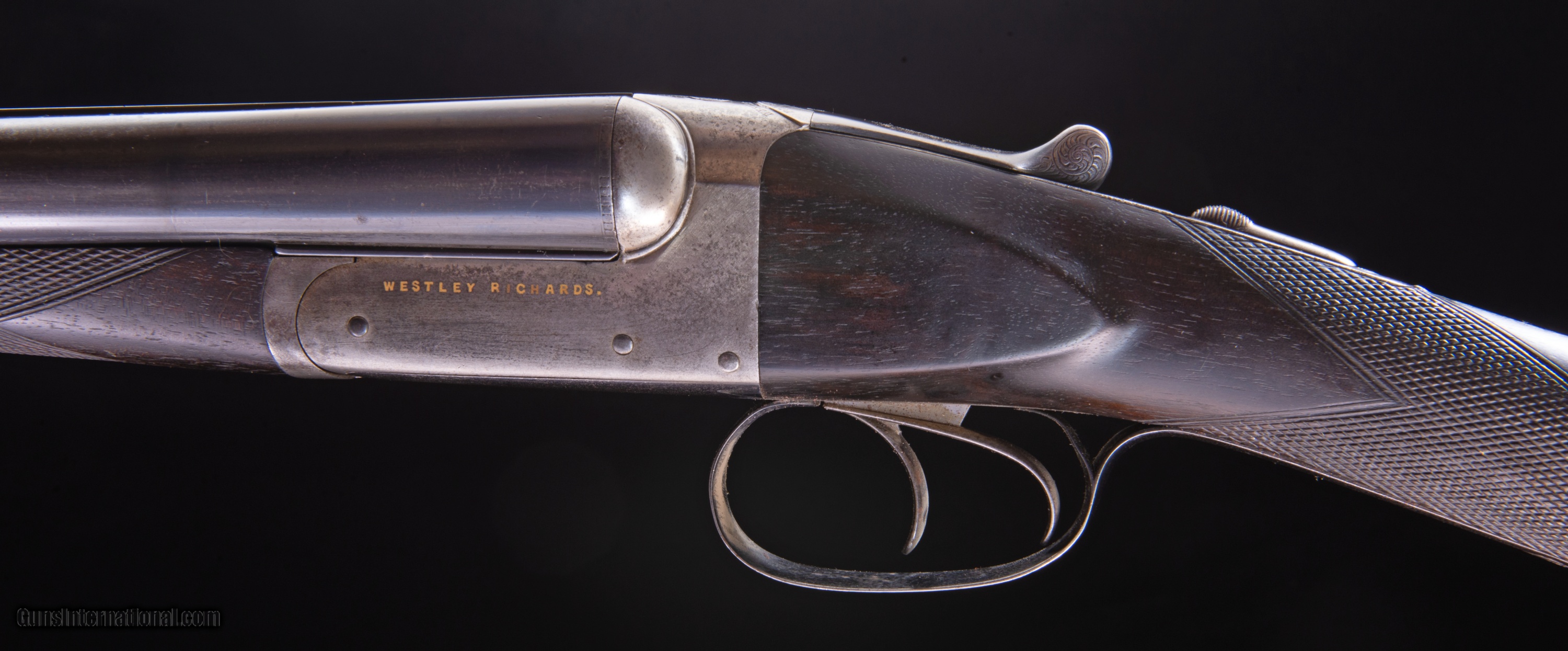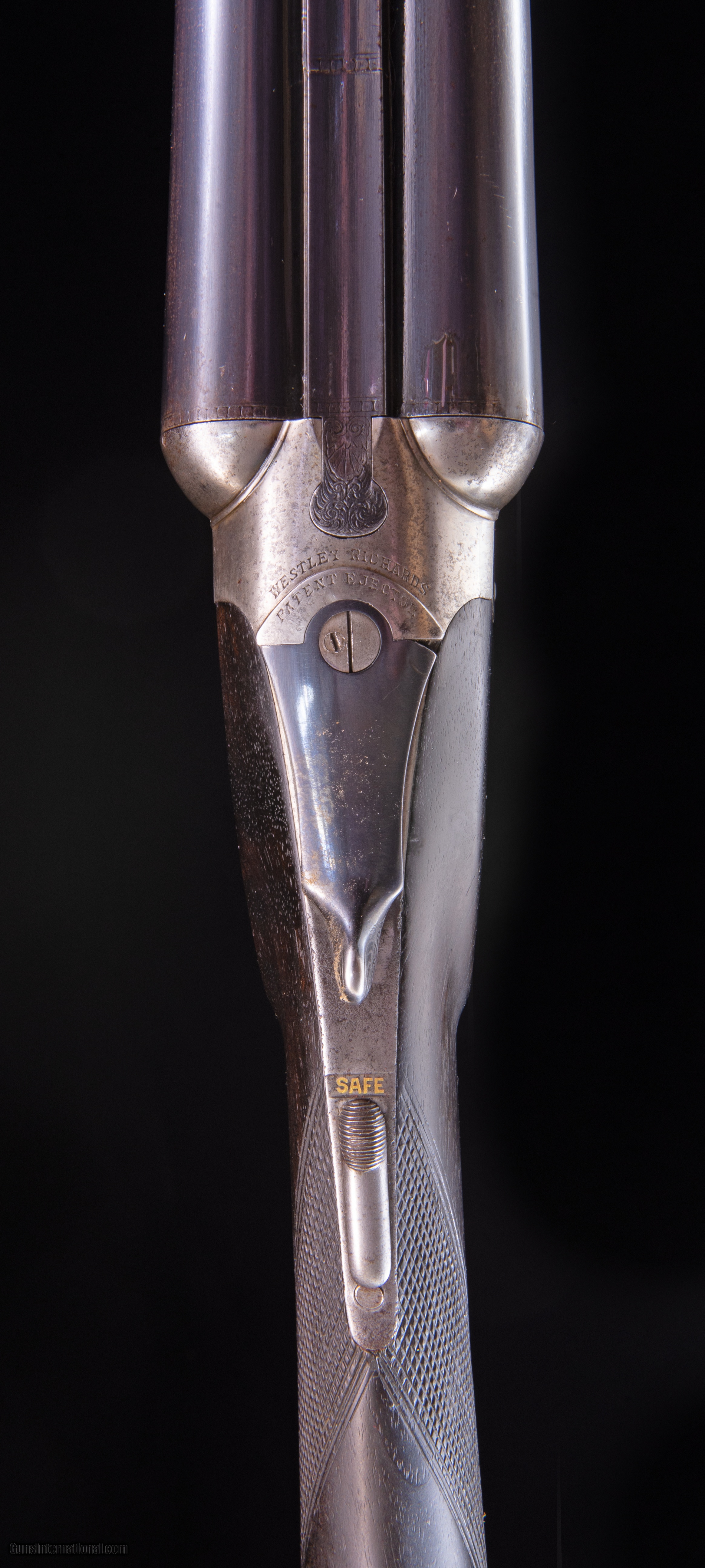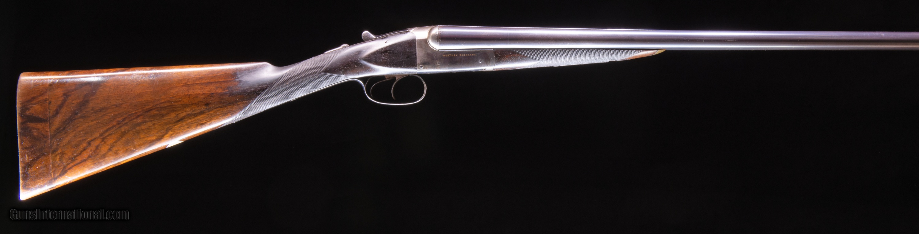Description: Boxlocks - This gun has a lot going for it but it has no engraving. The company name in gold and the Westley famous top lever / third bite rib extension is enough to make it special. This gun features 2 3/4" nitro proofs. The original stock has 14 1/4" wood.