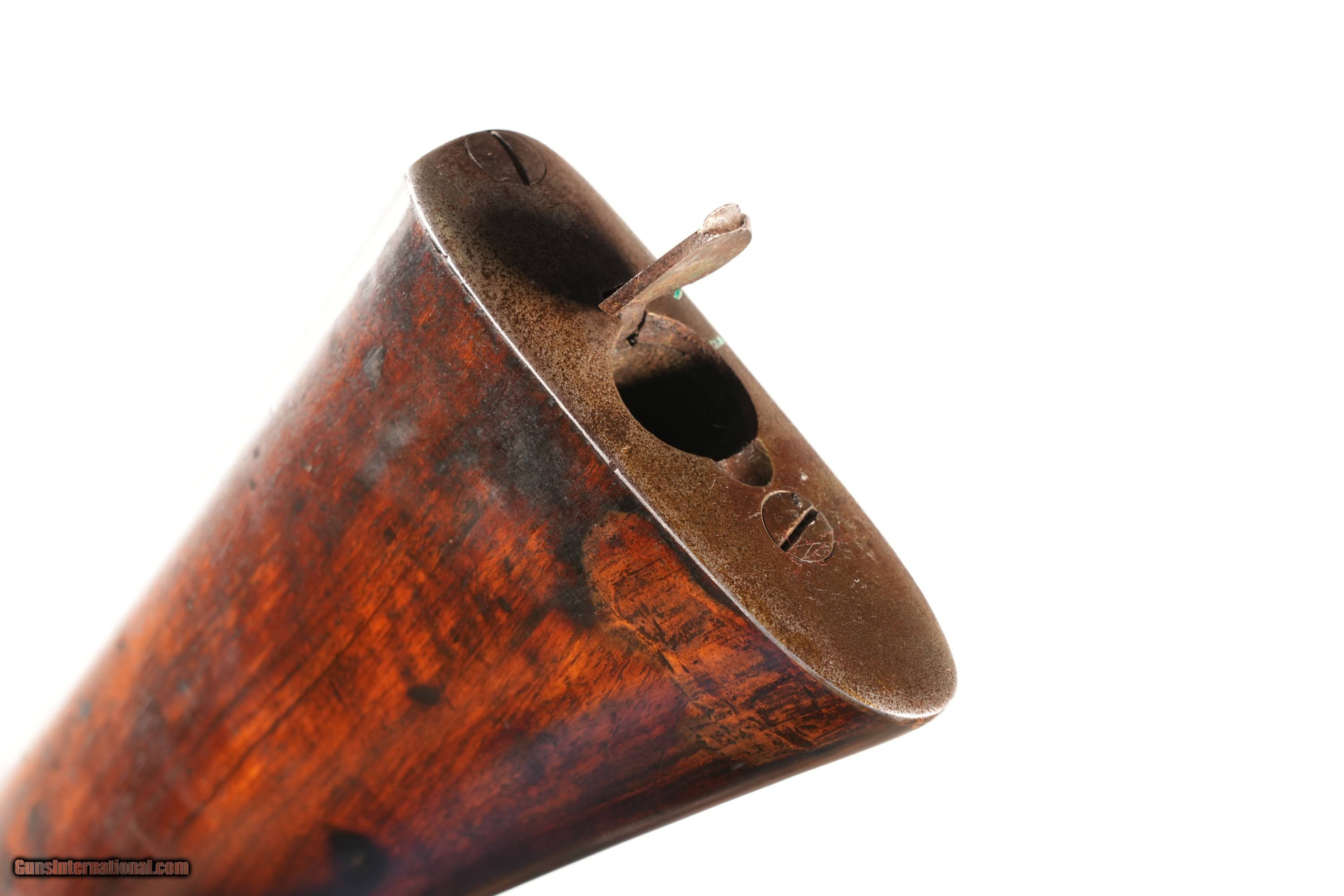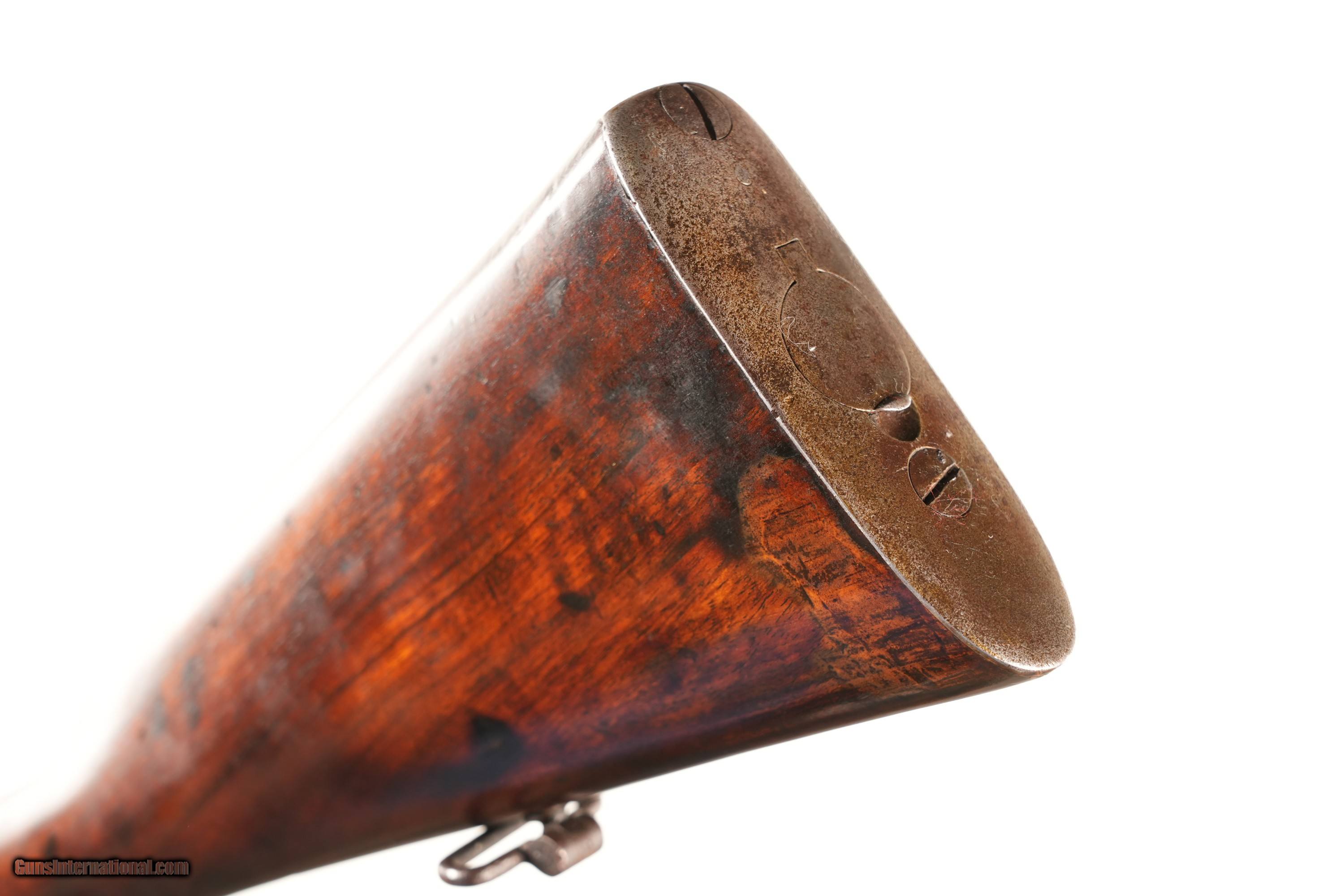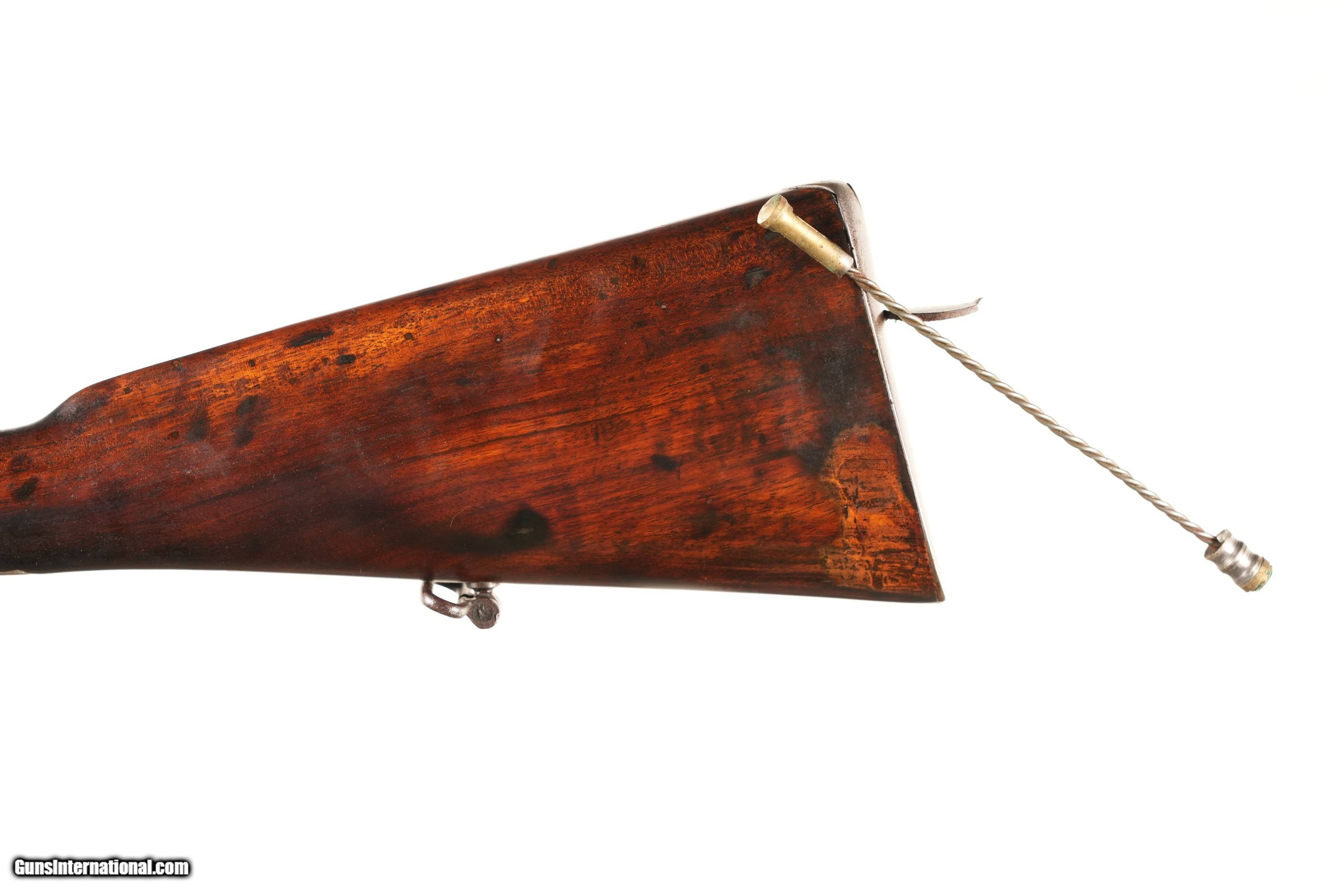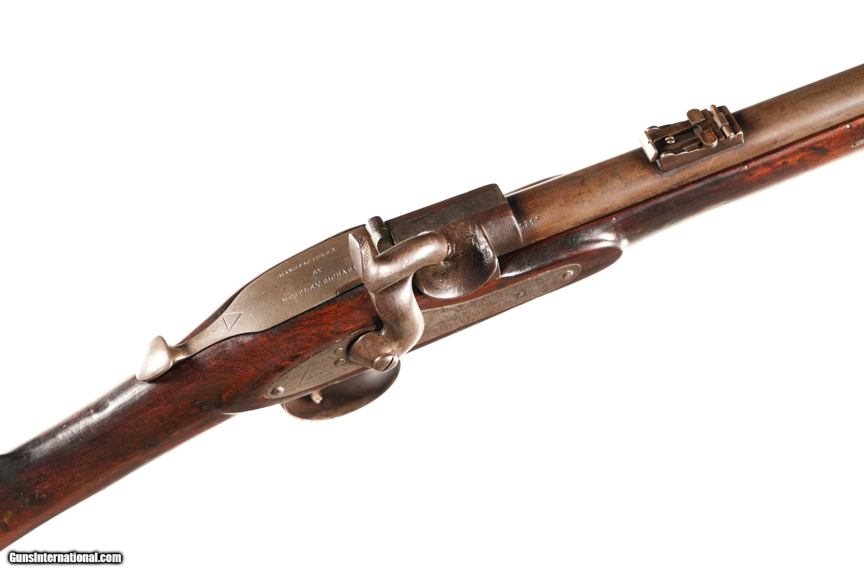 Description: Westley Richards Monkeytail Percussion Carbine – .450 Whitworth – 25" Barrel Serial #6255 | Dated 1873 | .450 Whitworth Caliber | No. 4473 A fine example of the Westley Richards Monkeytail Percussion Carbine, chambered in .450 Whitworth and dated 1873, this scarce breechloader features the distinctive monkeytail lever breech system. This particular model likely served a commercial or colonial market and retains the original character and working integrity that made Westley Richards a major name in 19th-century firearms innovation. Features a 25" barrel, percussion ignition, and military-style sights. The bore is bright and sharply rifled, showing the accuracy potential of the Whitworth pattern rifling. Metal surfaces have aged to a mottled, untouched patina, and the gun remains in mechanically sound condition.