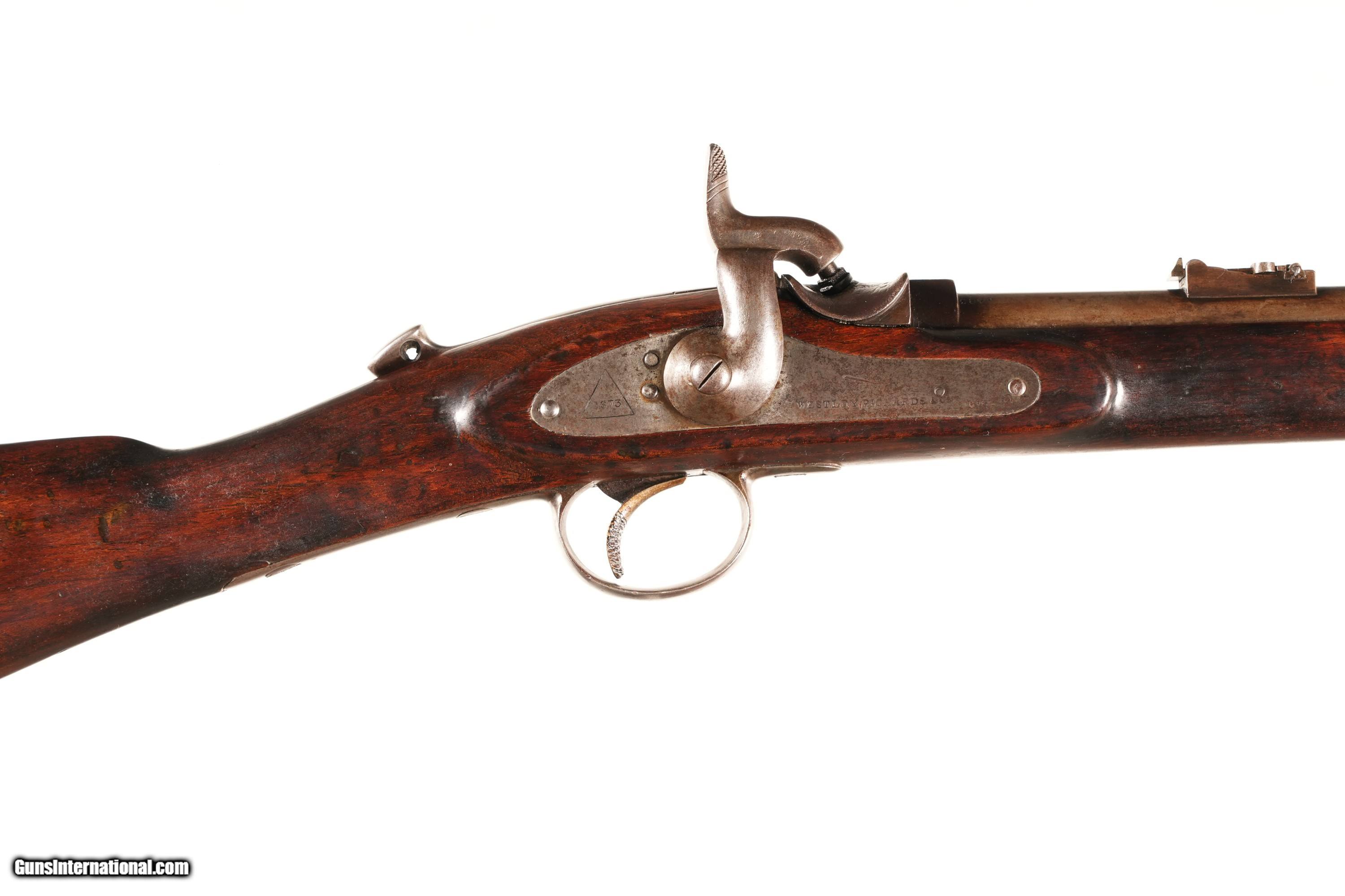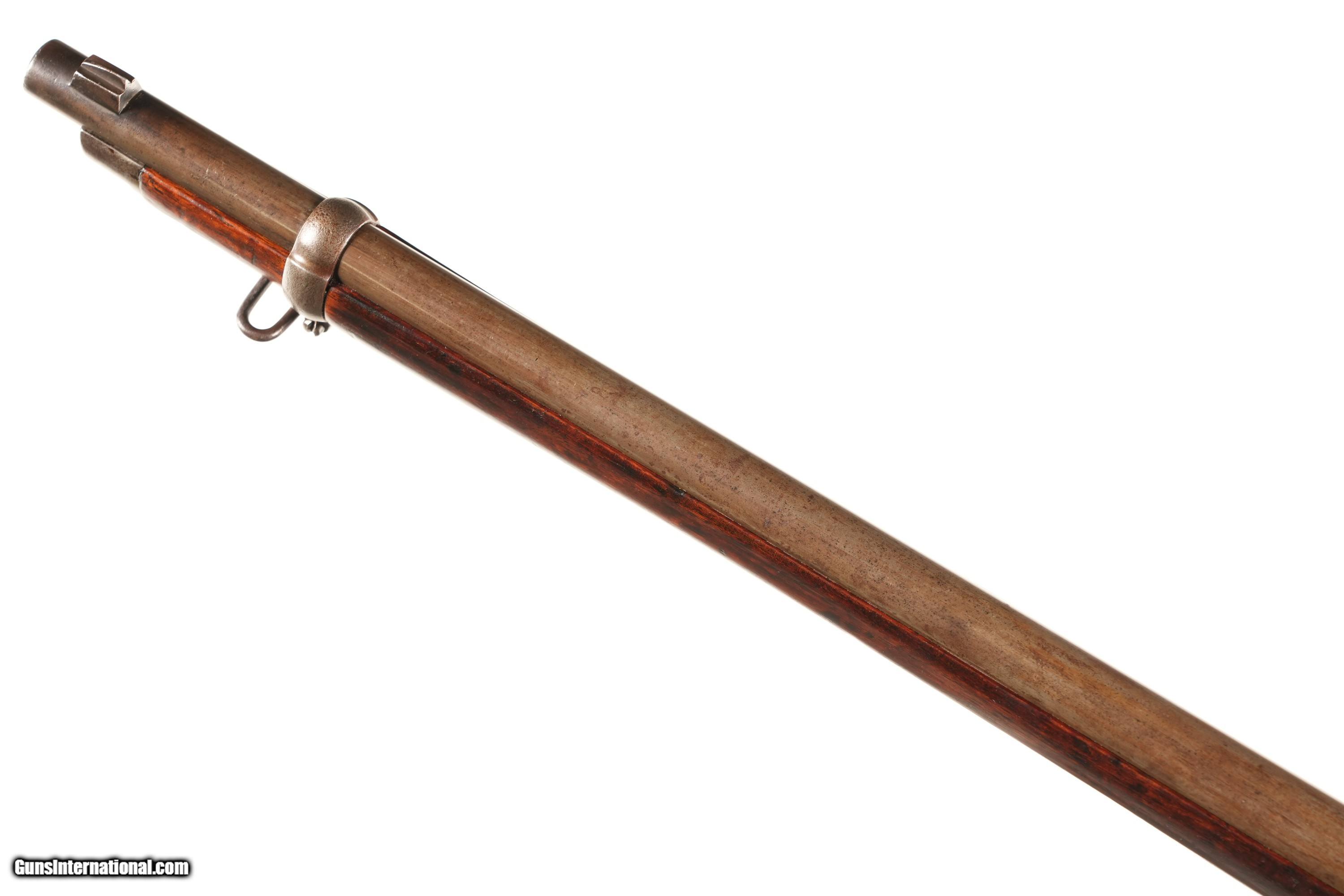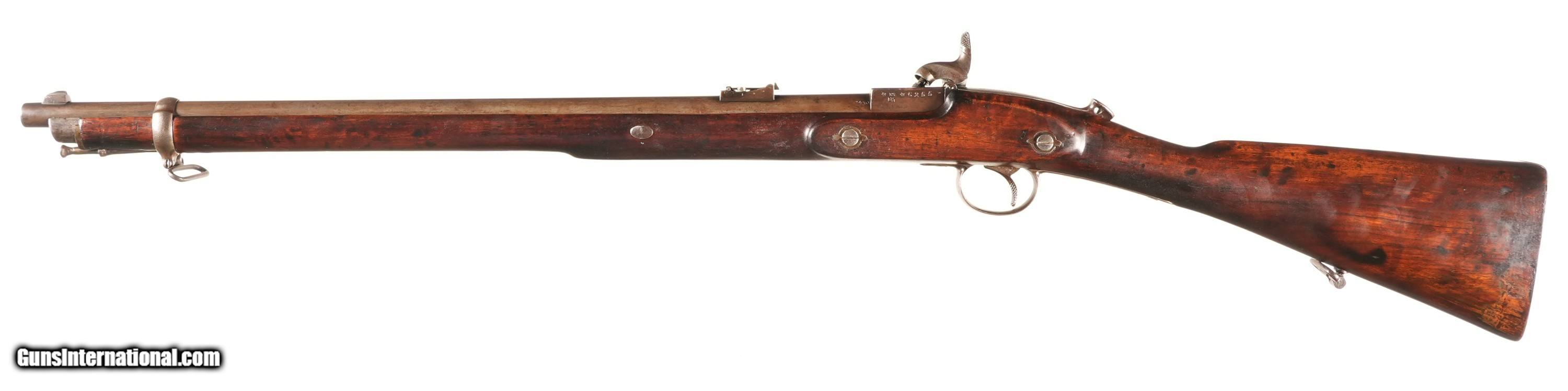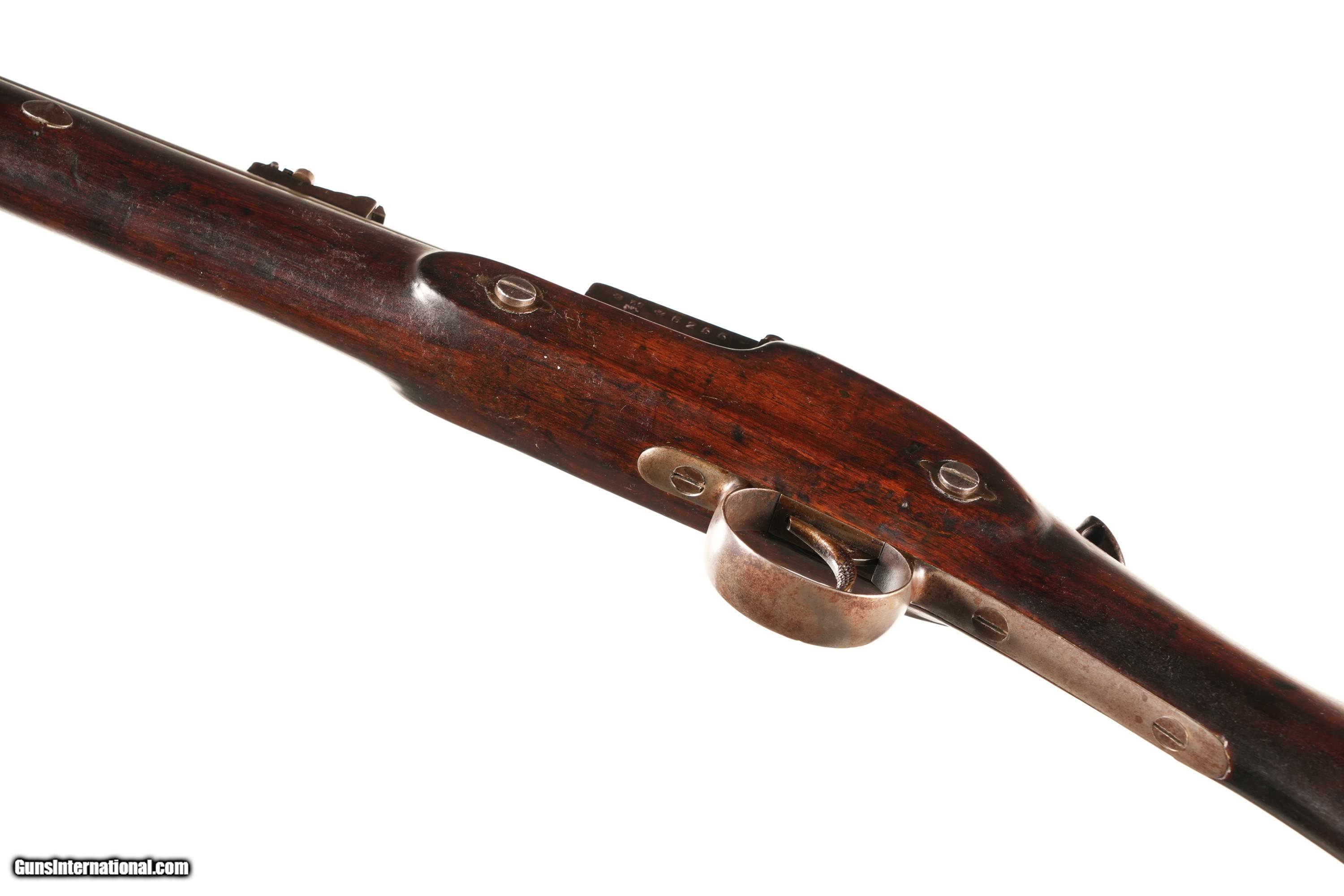 Description: Westley Richards Monkeytail Percussion Carbine – .450 Whitworth – 25" Barrel Serial #6255 | Dated 1873 | .450 Whitworth Caliber | No. 4473 A fine example of the Westley Richards Monkeytail Percussion Carbine, chambered in .450 Whitworth and dated 1873, this scarce breechloader features the distinctive monkeytail lever breech system. This particular model likely served a commercial or colonial market and retains the original character and working integrity that made Westley Richards a major name in 19th-century firearms innovation. Features a 25" barrel, percussion ignition, and military-style sights. The bore is bright and sharply rifled, showing the accuracy potential of the Whitworth pattern rifling. Metal surfaces have aged to a mottled, untouched patina, and the gun remains in mechanically sound condition.