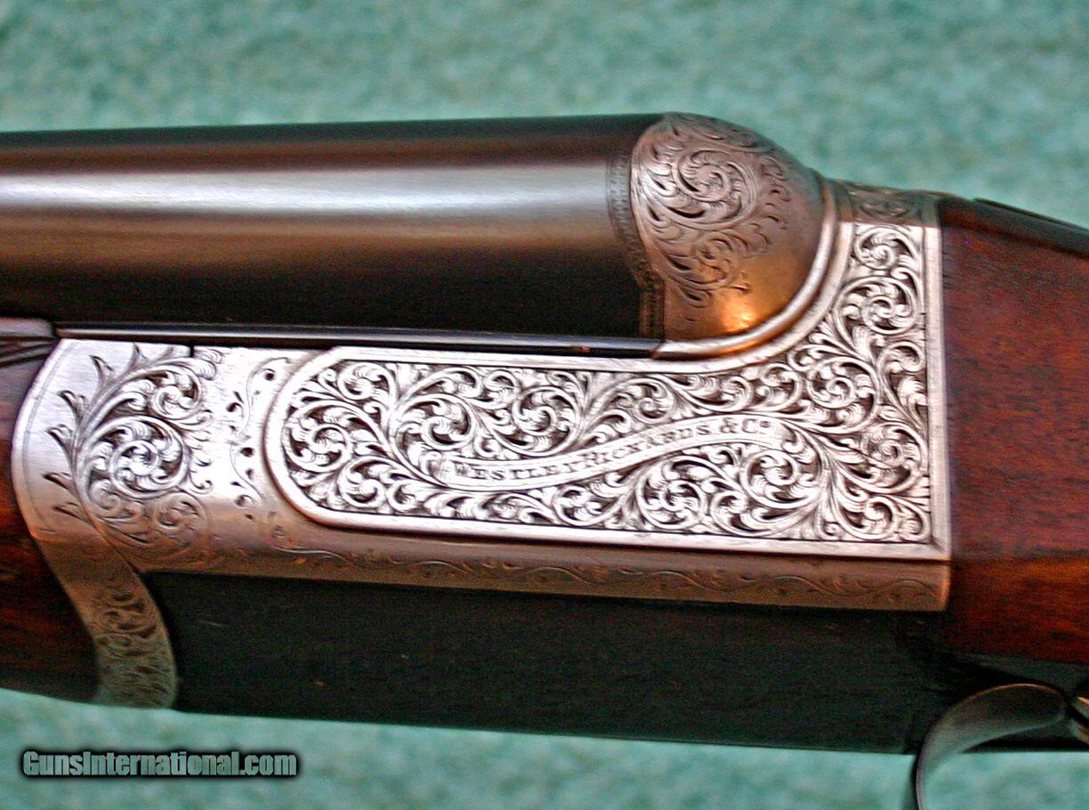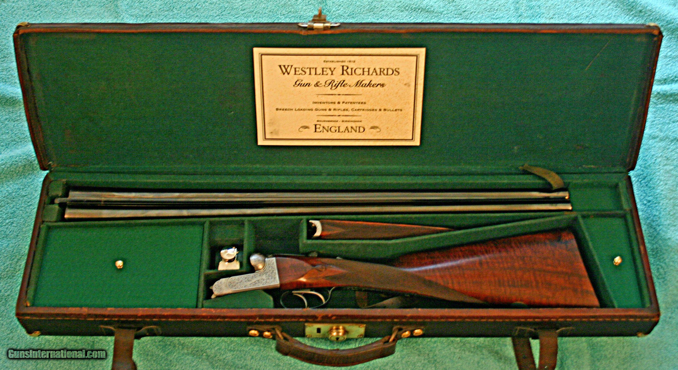 Description: SOLD *** Westley Richards Deluxe Drop Lock, Ejector, 12 gauge, 2 ¾” 27” bls, Hinged Floorplate, Excellent Plus Westley Richards Deluxe Detachable Locks (Droplock) Ejector shotgun, 12 ga., 2 ¾” chambers, 27” fluid steel barrels, choked F, IM. In excellent condition, this is the most advanced boxlock action ever created: the hand detachable lock action with side panels, hinged bottom plate, clipped fences and two triggers. Action has long bar beetle back automatic safety with “SAFE” in gold, dolls head extension 3rd bite, concave game rib engraved “Westley Richards.” No serious shotgun collection or battery of fine shotguns is complete without a Westley Richards droplock. If you don’t have one, your ensemble is incomplete. And if you want one, this is a BEST example. It is the Deluxe model with full coverage scroll engraving over a pleasing combination of coin finish and blackened bottom plate, trigger guard, and lower tang. The makers name is engraved in banners on both side panels, with beautifully figured dark English walnut with straight hand stock with vacant inlaid monogram gold oval; and matching splinter forend with an inlayed horn tip. Although built in 1923, serial number 7171 still has bright bores and a lifetime of use with minimum wall thicknesses of .035” for both barrels, and was totally re-inspected and tuned up by Westley Richards in 2015. The barrels were re-blacked by Westley Richards at that time as it was found without issue and with all original components, and had been well maintained. Chokes are .729 left (F) and .733 right (IM). Dimensions are 14 ½” (to checkered butt) x 1 ½” x 1 7/16” with ¼” cast off (for the right hand). Weight 7 lb. 4 oz. This is a great example of droplock boxlock that if more length is needed, could easily go to 15 ½” with the addition of a 1” leather-covered pad. Major Sir Gerald Burrard, in his trilogy on sporting guns, The Modern Shotgun, wrote: “Westley Richards detachable lock guns are undoubtedly the strongest, weight for weight, of all the box lock actions.” See his explanation below* This pre-owned gun was purchased by me from Westley Richards and shipped from London. It comes in its original case with maker’s label. The 1923 case has had some (minimal) professional restoration as 93-year-old English wool is not as durable as 93-year-old wood and metal that has been well maintained. History of the Westely Richards Droplock: Michael McIntosh, in his Gamefield Classics, writes (about Westley Richards): “You’d think having patented the first effective top fastener for a break-action gun, the original boxlock design, and the two most widely copied forend fasteners in the world would be enough. In 1907, Leslie Taylor and John Deeley (then owners of Westley Richards) patented a bottom plate that is removeable… such that you can lift the locks out with your fingers and reinstall them, or replacements, in mere moments…. In 1908 Taylor patented a change in which the bottom plate is hinged at the rear and simply swings open like a trapdoor.” Geoffrey Boothroyd, in his book, Sidelocks and Boxlocks, writes (with respect to Westley Richards drop lock): “The detachable lock has a number of benefits. There is the utter simplicity of the lock, four moving parts, and the ease of removal and replacement. We are of course, fortunate, that Westley Richards are very much still in business and that they also still build guns…I don’t have a Westley Richards with detachable locks…Indeed, the locks, when detached, are a delight to behold and, if I were fortunate enough to own a Westley Richards gun of this type, I think I would keep these jeweled masterpieces separate from the gun and have them mounted in a suitable display case so that I could enjoy looking at them when not in use.” *Major Sir Gerald Burrard, in his trilogy on sporting guns, The Modern Shotgun, explained that the detachable lock system, besides being nifty, is an extremely strong gun frame since there is no reason to drill a hole through the action bar for the tumbler peg, allowing the need to mill only narrow slots in the bar to accommodate the locks which leaves more steel in the frame than that of the conventional box lock. Buyer must furnish current FFL copy for shipping. Buyer has 3-day full refund non-firing return privilege. Price: $13,500.00 Seller is the author of The Rifleman’s Rifle (Winchester pre-64 Model 70s) and will furnish a Letter of Provenance that this gun is from his collection. Please check out author’s feedback on ebay under rcrwin70roger. Shipping is $50 to buyer’s FFL, payment by MO, certified check , wire transfer or personal check with wait for validation. For questions, call (678) 971-4173 and ask for Roger. SOLD |