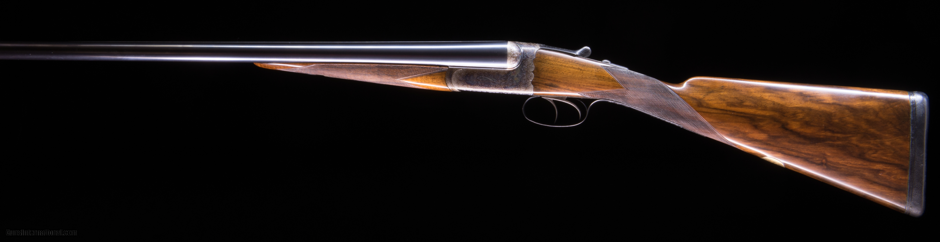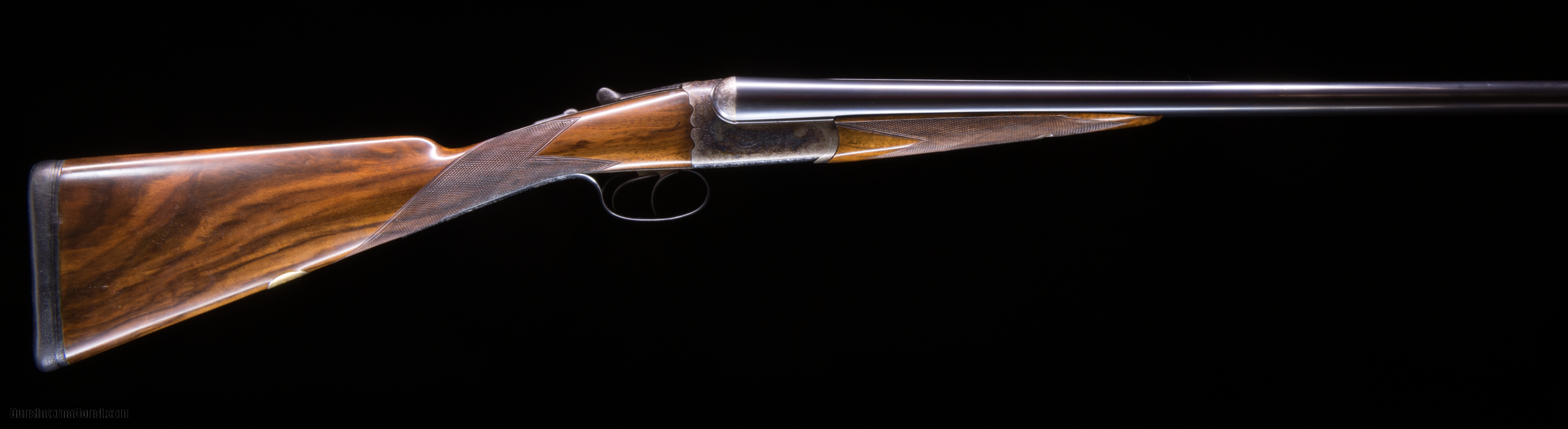 Description: Boxlocks - Finished in 1903 this classic droplock is in excellent condition with near 100% new case hardening, near 100% blacking on the barrels, and 95% or better wood finish. *Note the great stock dimensions and chokes perfect for most bird hunting. *** Note: To see this gun with high resolution photos and a zoom-in feature, go to the vintagedoubles main site and search for the gun ID: 3804 or browse the main site to see our full gun collection. SOLD Curio/Relic: Yes Manufacturer: Westley Richards Deluxe Droplock with High Quality Restoration Model: Deluxe Serial Number: 16803 Ejectors: Yes Barrels: 28 Barrel Type: Sleeved Action: Droplock Gauge Info: 12 gauge Stock Comb: 1 7/16 Stock Heel: 2 Stock Cast: 3/16 LOP: 14 1/2" ( 13 3/4" wo Weight: 6 lbs. 10 oz. Choke Left: .011 IC Choke Right: .005 Skeet Proof:Nitro: 2 1/2 Minimum Wall Thickness Left: .030 Minimum Wall Thickness Right: .029 |