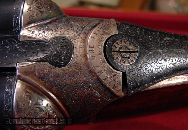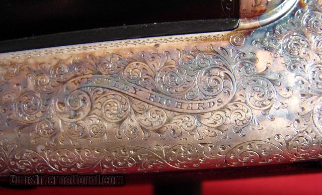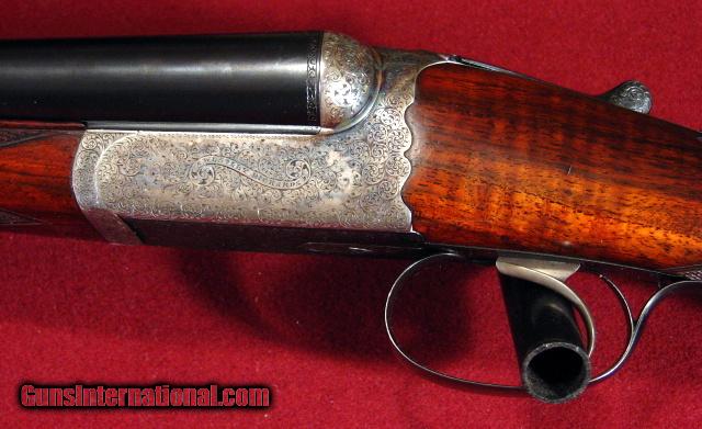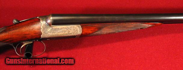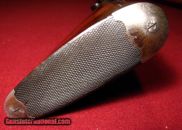 Description: Westley Richards 178 New Bond St, London 12 Gauge Droplock two barrel set with Ferlach Bohler Special Steel chopperlump ejector barrels with 2 3/4" chambers new in 1966. Bores in both sets remain as new. Both with concave game top ribs carrying the Westley Richards inscription and both ring with a pronounced chime. Barrel # 1- 28 3/8" IC/M bored .730 right and .729 left. Choked .007 right and .019 left Barrel # 2- 30" M/F bored .728 right and .727 left. Choked .014 right and .027 left Fancy scalloped back reciever with 90% coverage crisp scroll engraving and retaining 30% original case colors. Single selective trigger. Original buttstock and forend in near exhibition English Walnut with deeply contrasting marblecake lines. Both solid and free of cracks or repairs. Splinter forend with Deeley forend release. Horn tip. DAC-1 11/16" DAH-2 1/8 13 3/4" LOP to rear position single trigger. Checkered butt with engraved steel heal and toe clips. Slight cast off. Weighs 6lb 15oz with the 30" barrels and 6lb 13oz with the 28 3/8" barrels. Stock oval inscribed " Donated by Nan & Frank Pachmayr to Ducks Unlimited" This is a nice piece originally manufactured in 1906 and now with two sets new chopperlump barrels. Tight and on face with both barrel sets. Excellent weight and dimmensions. Great eye appeal and with droplocks. An heirloom ready to use for the next 110 years. SOLD |