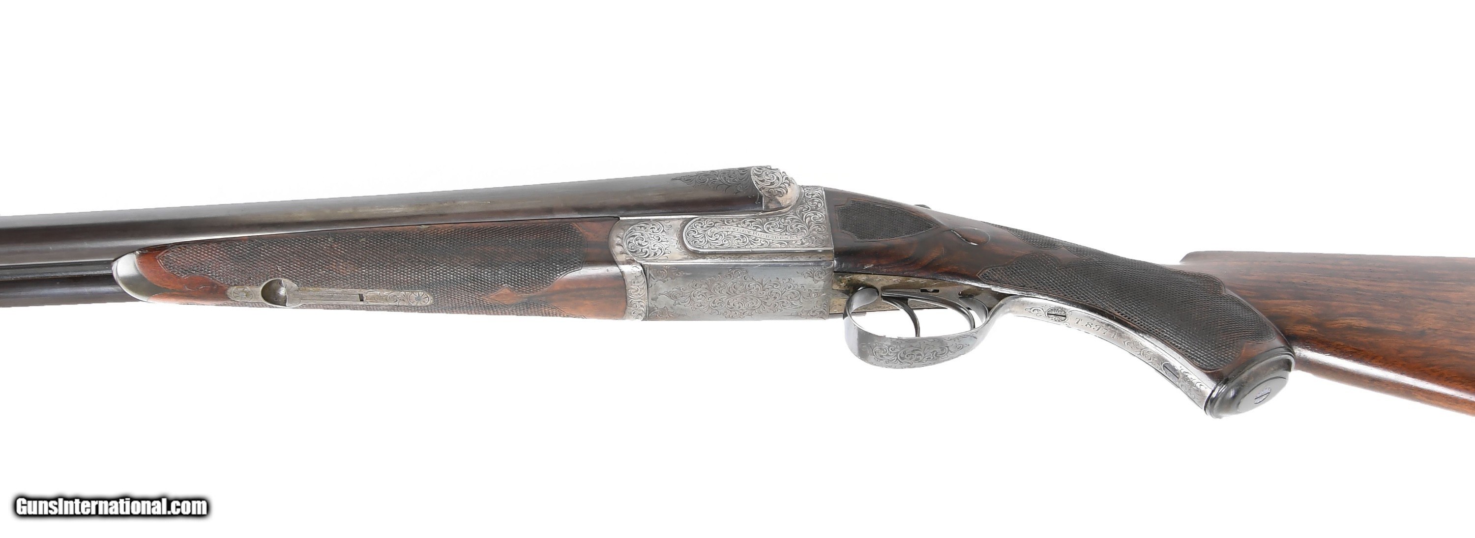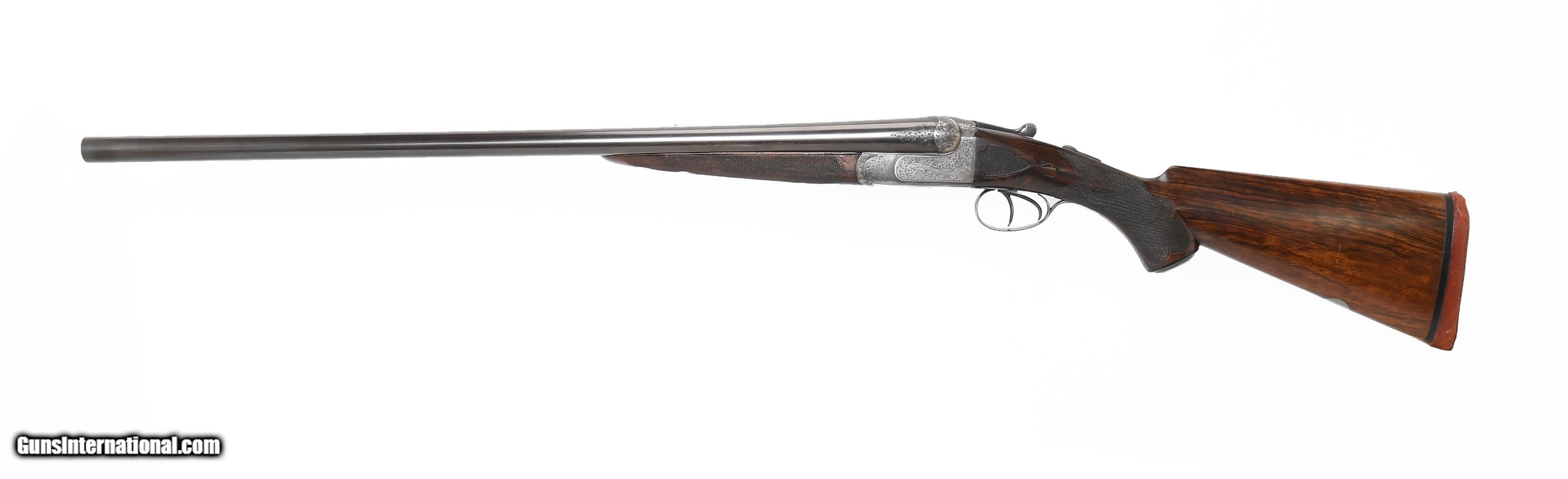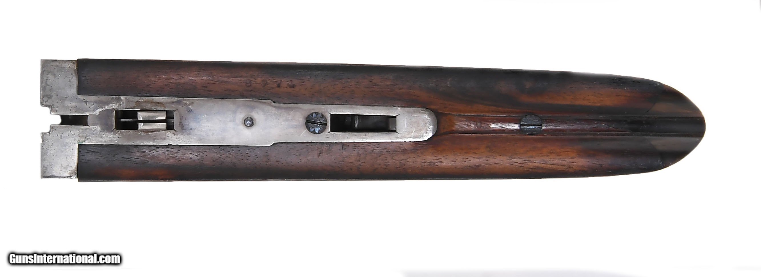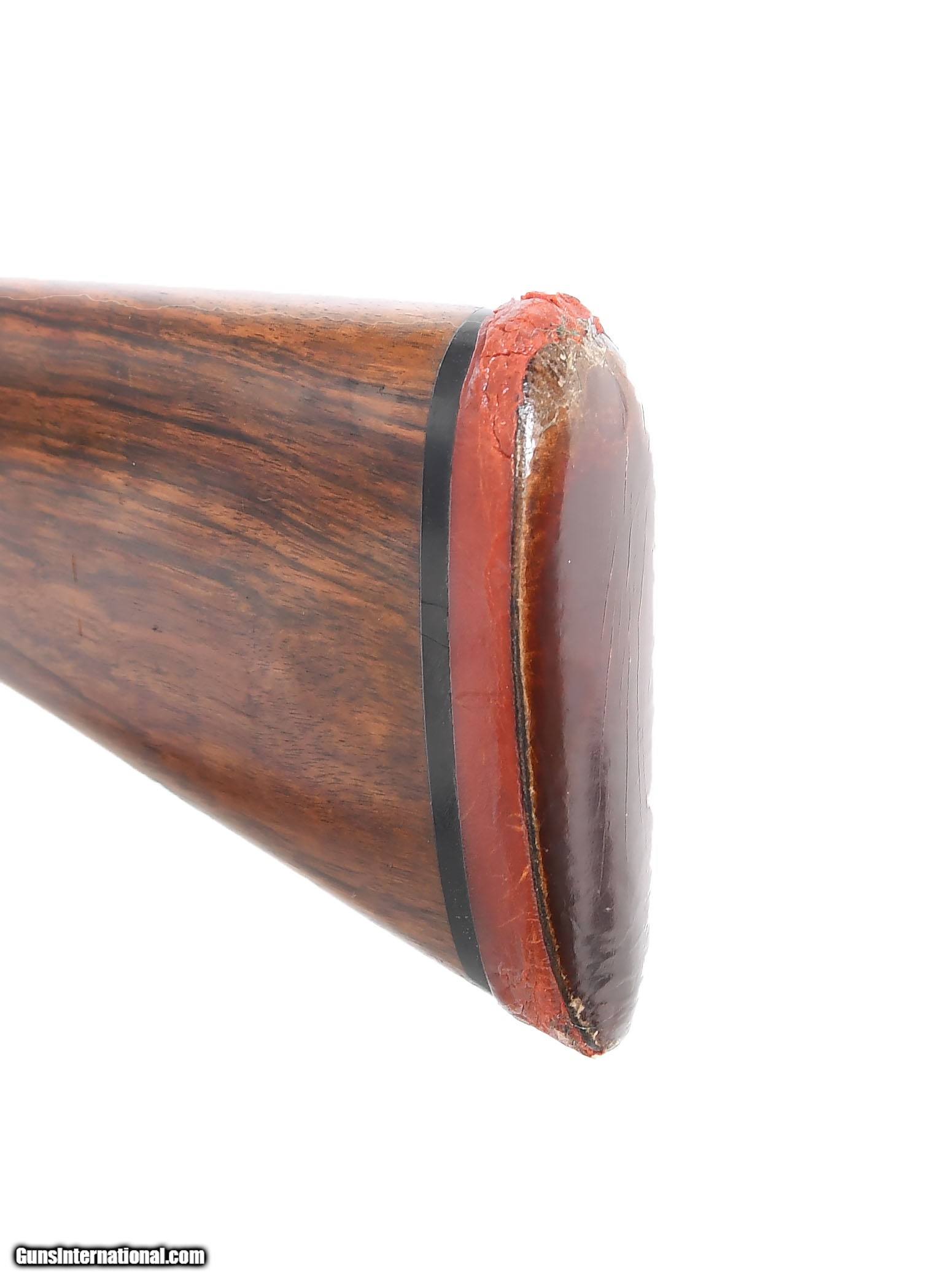 Description: Westley Richards, Droplock action, 12 gauge SxS shotgun, circa 1920’s. Of note from Westley Richards is that the configuration of this gun with the raised panels on the action, the square back (not scalloped), clipped fences, and this engraving pattern were called The “Travers” Gun. Conjecture is that the gun was so named because of a well-known shooting club on Travers Island near New York! Some examples have been found with “Travers” engraved on top of the barrels. The engraved action has a hinged floor plate with correctly numbered drop locks in the gun. Double triggers, automatic ejectors, automatic safety, rib extension and side clips (clipped fences). It has 26” solid rib barrels. The right bore is .738” with .009” choke (I/C) and minimum wall thickness of .035”. The left bore is .734” with .030” choke (Full) also with a minimum wall thickness of .035”. Both have 2 ¾” (70mm) chambers. Bores are bright and shiny. The stock has a 14 1/8” LOP over what could be an original leather faced recoil pad with 1 5/8” DAC and 2 ¾” DAH. 3/8" right hand cast. Very interesting Droplock in fine condition. Weighs 6 lbs. 5 oz. SN: T8974 SOLD Curio/Relic: Yes |