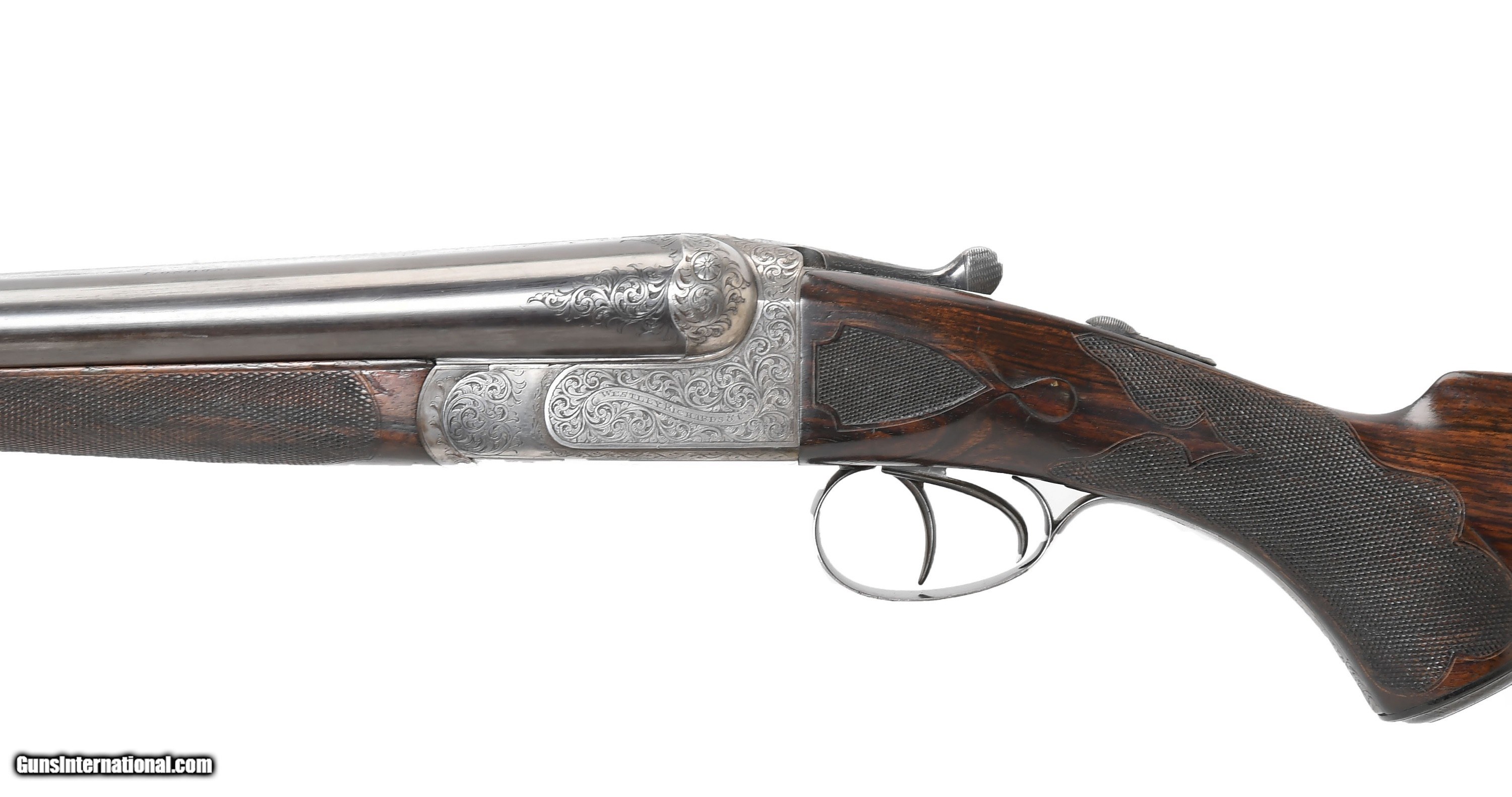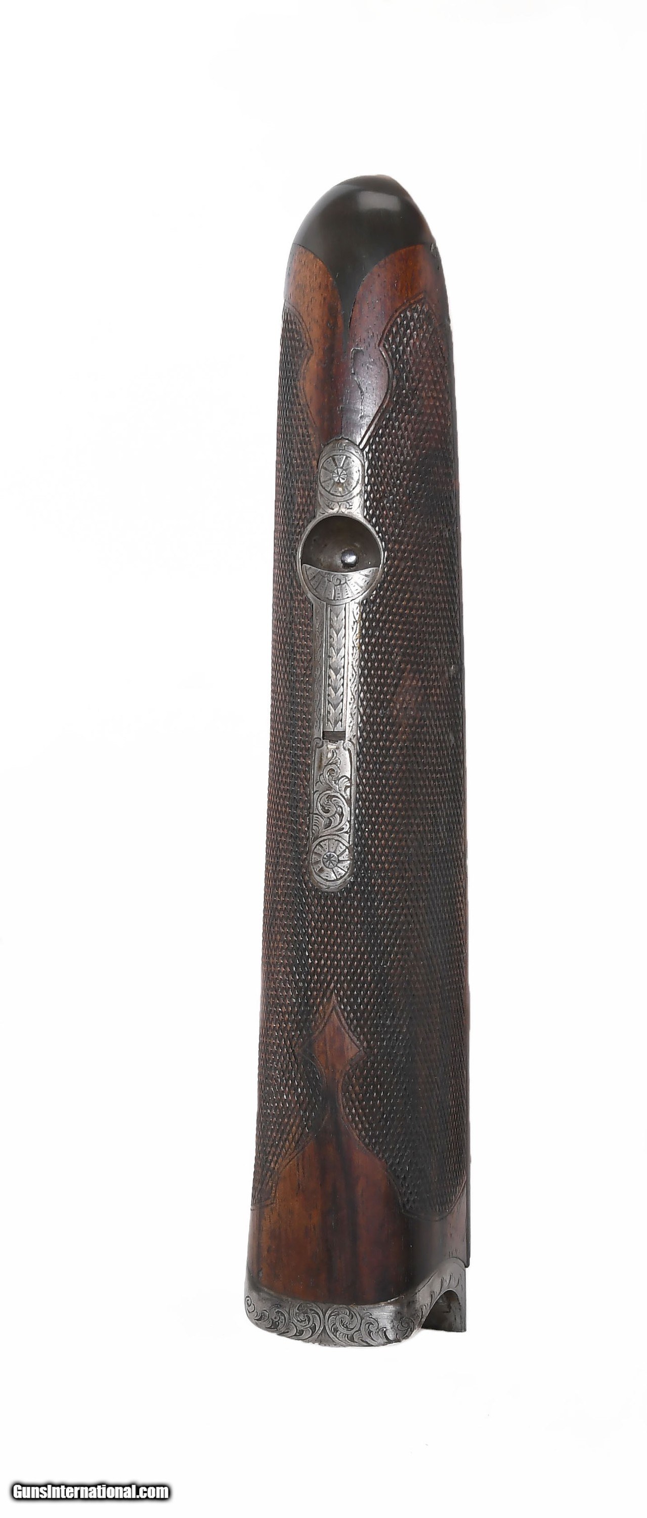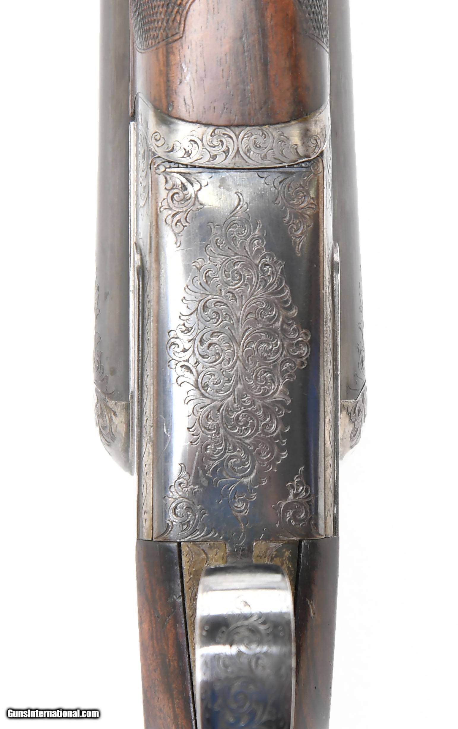 Description: Westley Richards, Droplock action, 12 gauge SxS shotgun, circa 1920’s. Of note from Westley Richards is that the configuration of this gun with the raised panels on the action, the square back (not scalloped), clipped fences, and this engraving pattern were called The “Travers” Gun. Conjecture is that the gun was so named because of a well-known shooting club on Travers Island near New York! Some examples have been found with “Travers” engraved on top of the barrels. The engraved action has a hinged floor plate with correctly numbered drop locks in the gun. Double triggers, automatic ejectors, automatic safety, rib extension and side clips (clipped fences). It has 26” solid rib barrels. The right bore is .738” with .009” choke (I/C) and minimum wall thickness of .035”. The left bore is .734” with .030” choke (Full) also with a minimum wall thickness of .035”. Both have 2 ¾” (70mm) chambers. Bores are bright and shiny. The stock has a 14 1/8” LOP over what could be an original leather faced recoil pad with 1 5/8” DAC and 2 ¾” DAH. 3/8" right hand cast. Very interesting Droplock in fine condition. Weighs 6 lbs. 5 oz. SN: T8974 SOLD Curio/Relic: Yes |