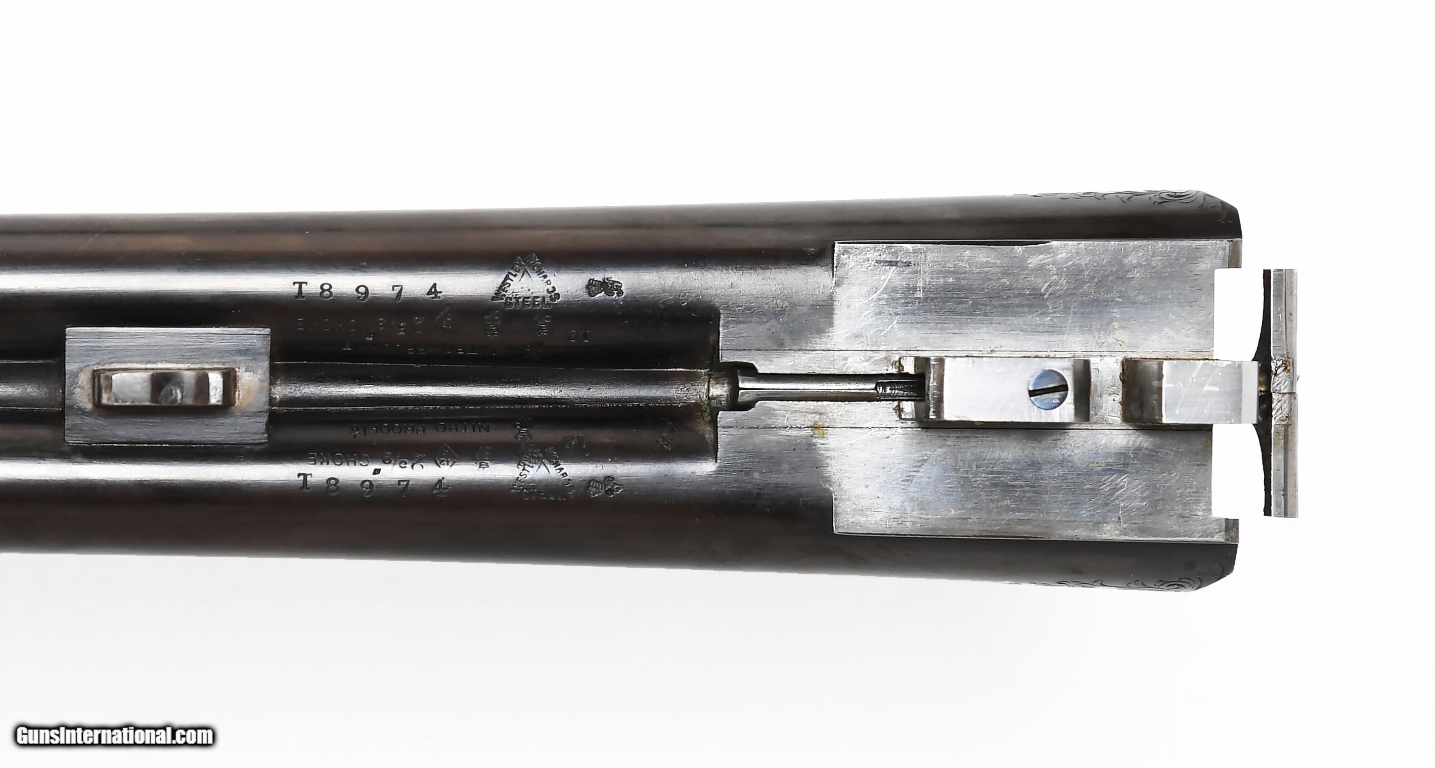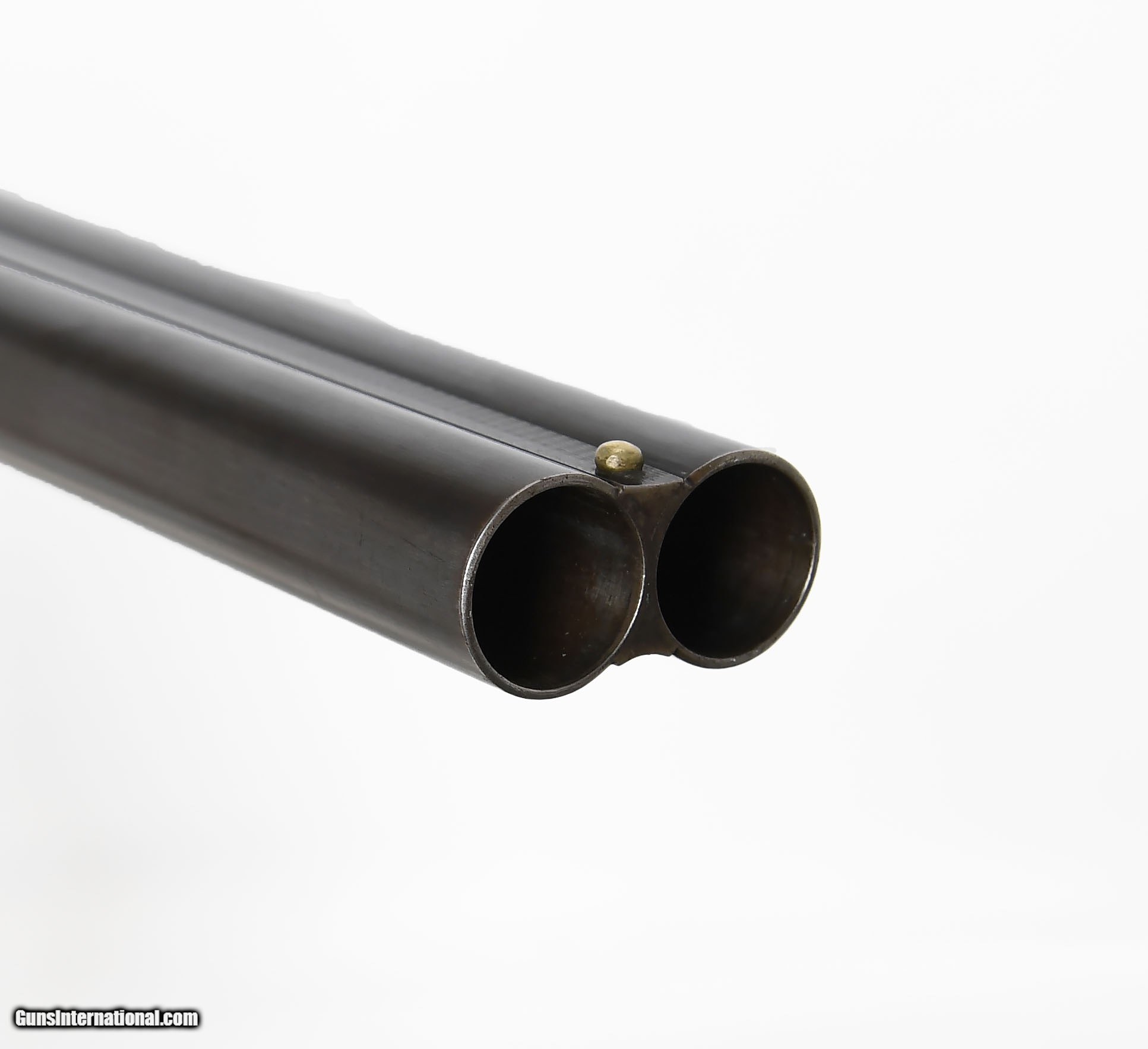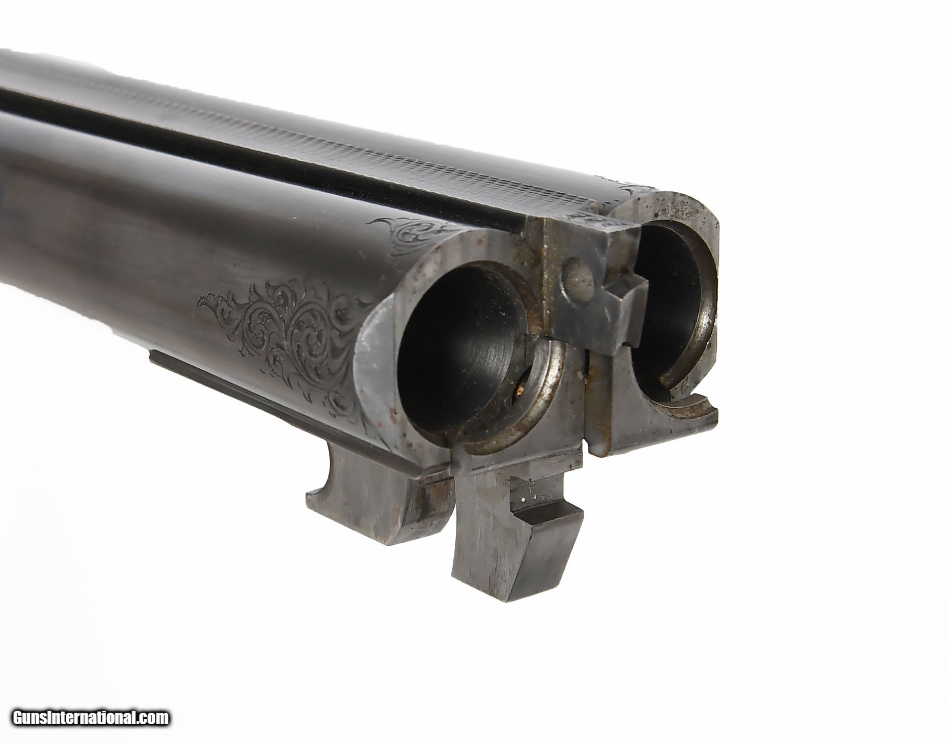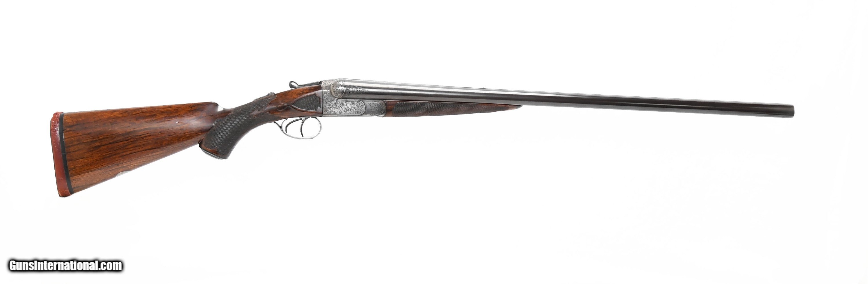 Description: Westley Richards, Droplock action, 12 gauge SxS shotgun, circa 1920’s. Of note from Westley Richards is that the configuration of this gun with the raised panels on the action, the square back (not scalloped), clipped fences, and this engraving pattern were called The “Travers” Gun. Conjecture is that the gun was so named because of a well-known shooting club on Travers Island near New York! Some examples have been found with “Travers” engraved on top of the barrels. The engraved action has a hinged floor plate with correctly numbered drop locks in the gun. Double triggers, automatic ejectors, automatic safety, rib extension and side clips (clipped fences). It has 26” solid rib barrels. The right bore is .738” with .009” choke (I/C) and minimum wall thickness of .035”. The left bore is .734” with .030” choke (Full) also with a minimum wall thickness of .035”. Both have 2 ¾” (70mm) chambers. Bores are bright and shiny. The stock has a 14 1/8” LOP over what could be an original leather faced recoil pad with 1 5/8” DAC and 2 ¾” DAH. 3/8" right hand cast. Very interesting Droplock in fine condition. Weighs 6 lbs. 5 oz. SN: T8974 SOLD Curio/Relic: Yes |
