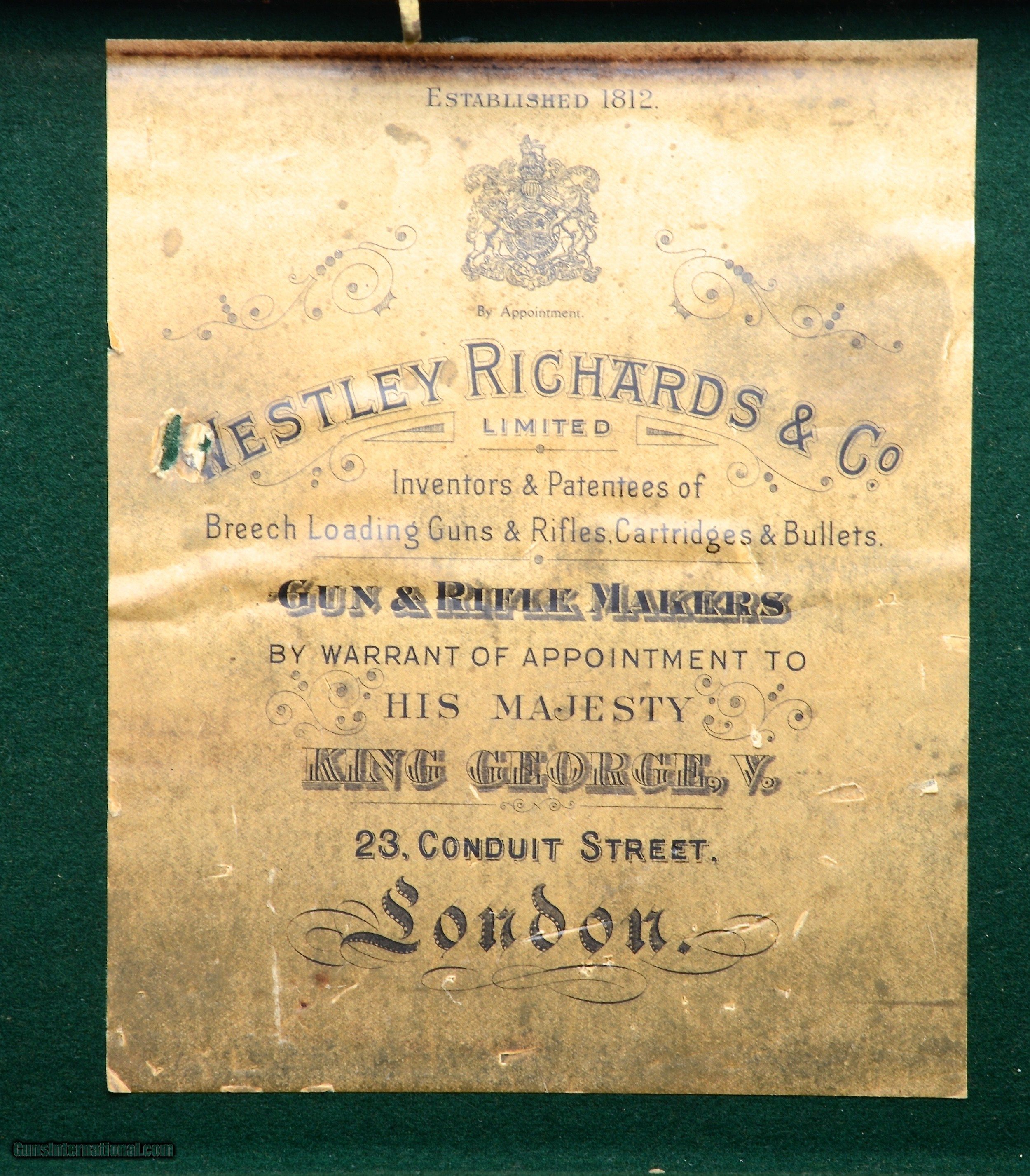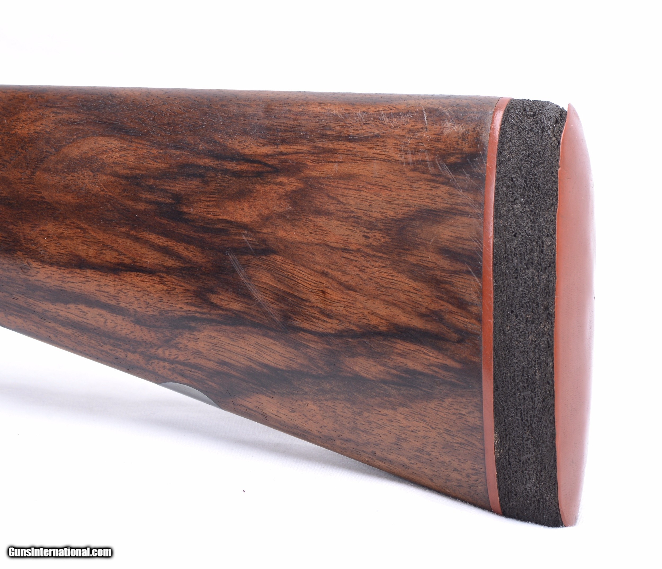 Description: Westley Richards Droplock 12 gauge SxS shotgun. The Westley Richards droplocks are considered among the very best shotguns ever made. There were several style changes and this gun has all of the best changes…scalloped receiver and hinged floor plate. I believe that this gun was built as a “Pigeon” gun as it has 30” barrels with a hand cut solid rib that tapers from 12mm (1/2”) to 7.25mm (9/32”) at the muzzle and it has front and mid factory installed ivory beads. The bores are .735 diameter with .040” nominal wall thicknesses and choke of .012” (IC) and .045” (XF). Chambered for 2 ¾” shells and proved at 1 ¼. The finely engraved receiver retains over 80% original case colors. It is fitted with the “patent one trigger” and automatic ejectors. A very solid gun mechanically, completely “on face” and no indications of hard use. The straight grip stock is finelycheckered matching the splinter forearm with Deeley release. The length of pull is 14”over the 1”leather faced pad and it has 1 ½”DAC and 2”DAH with 1/8”cast favoring a right hand shooter. The gun comes with the original makers leather luggage case with all accessories carrying the Westley Richards markings. The handle straps and the outside straps guides are in need of repair. The gun weight 7 lbs. 6 oz. and balances nicely between the hands. SN:T8681 SOLD Curio/Relic: Yes |
