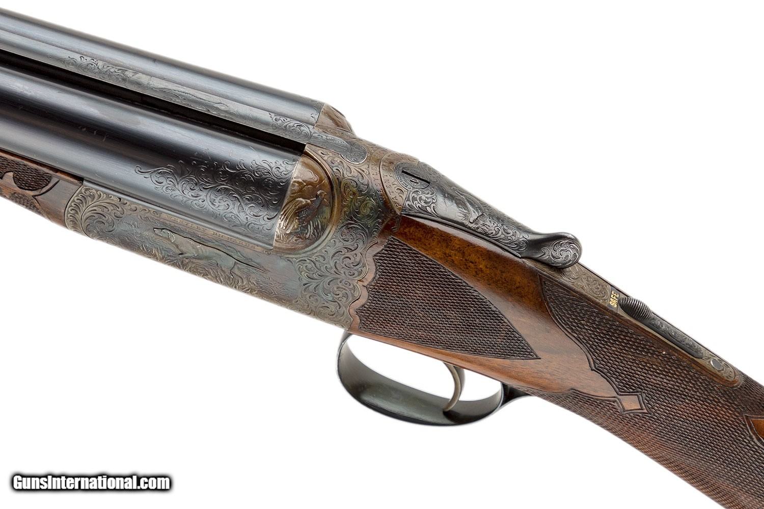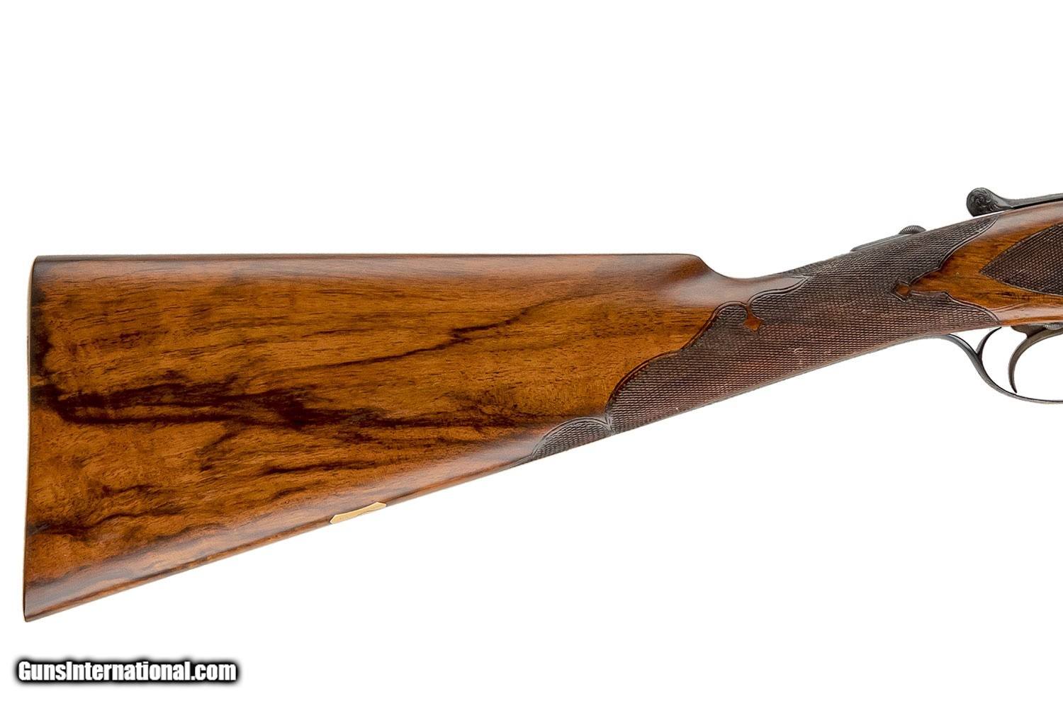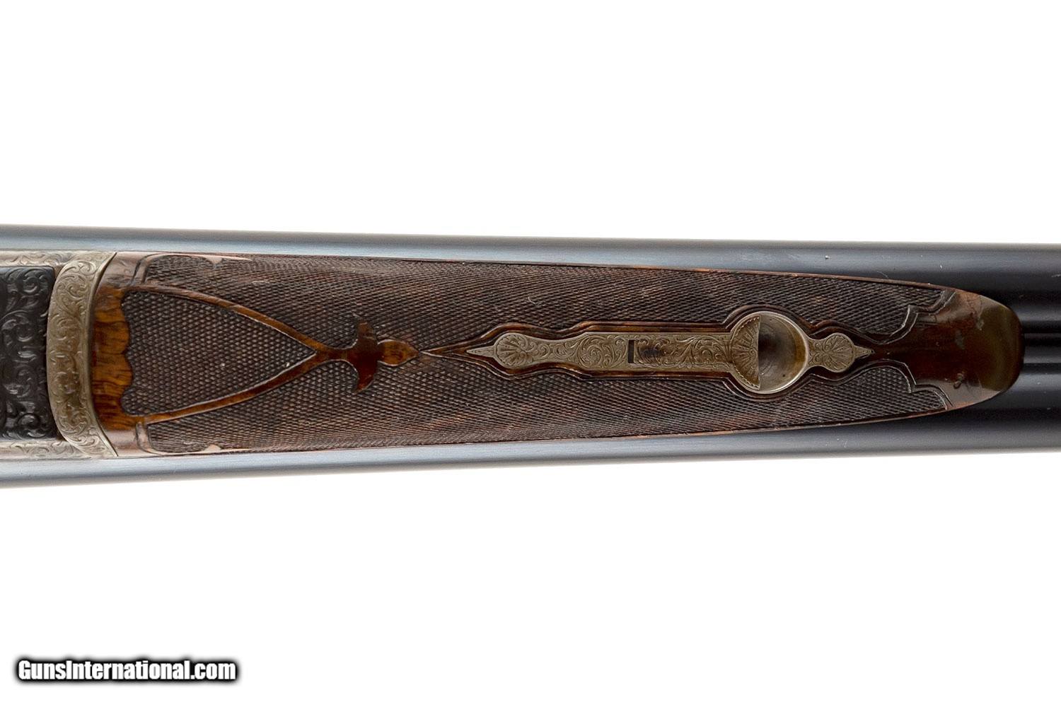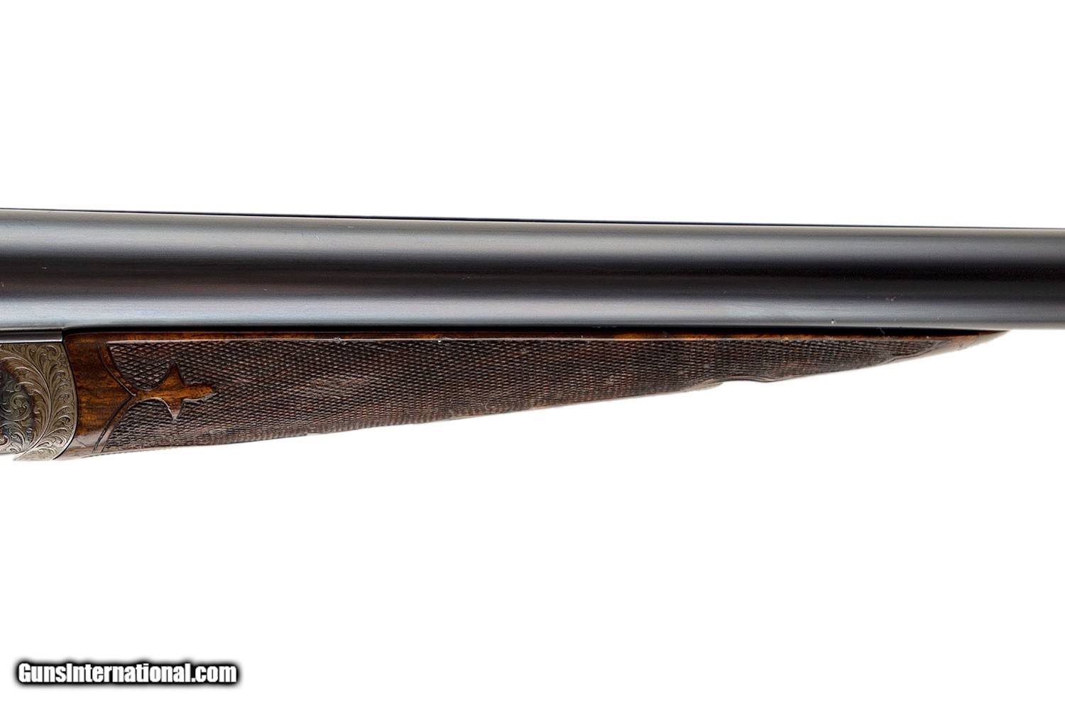Description: SN# 17XXX 28" SOLID RIB BARRELS (.013 AND .019 CONSTRICTIONS) 2 3/4" CHAMBERS LONDON REPROOF 2008 TO 2 3/4" WALLS: .023 LT, .023 RT BORES: .739 LT, .737 RT SINGLE SELECTIVE TRIGGER EJECTORS SPLINTER FOREARM ENGLISH GRIP CHECKERED BUTT GREAT REFINISHED CONDITION WITH SOME LIGHT HANDLING FEW MINOR FINSIH SCRATCHES ON BARREL BORES ARE BRIGHT AND SHINY 6LBS 2 OZ 2 1/8" DAH 1 1/2" DAC 14 5/8" LOP CASED EXTRA SET OF LOCKS IN FAUX CROCODILLY CASE SOLD |