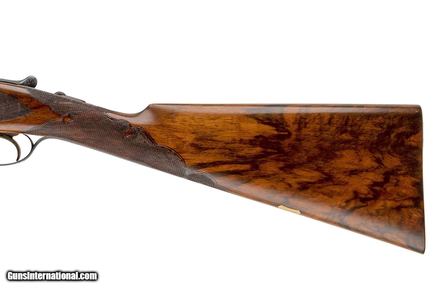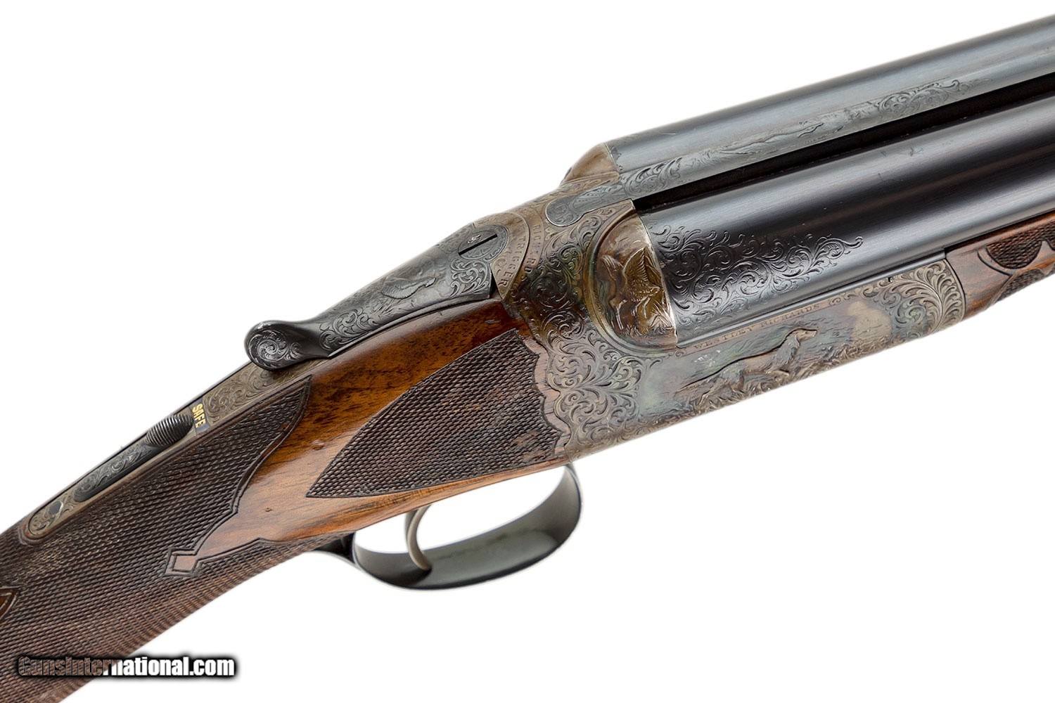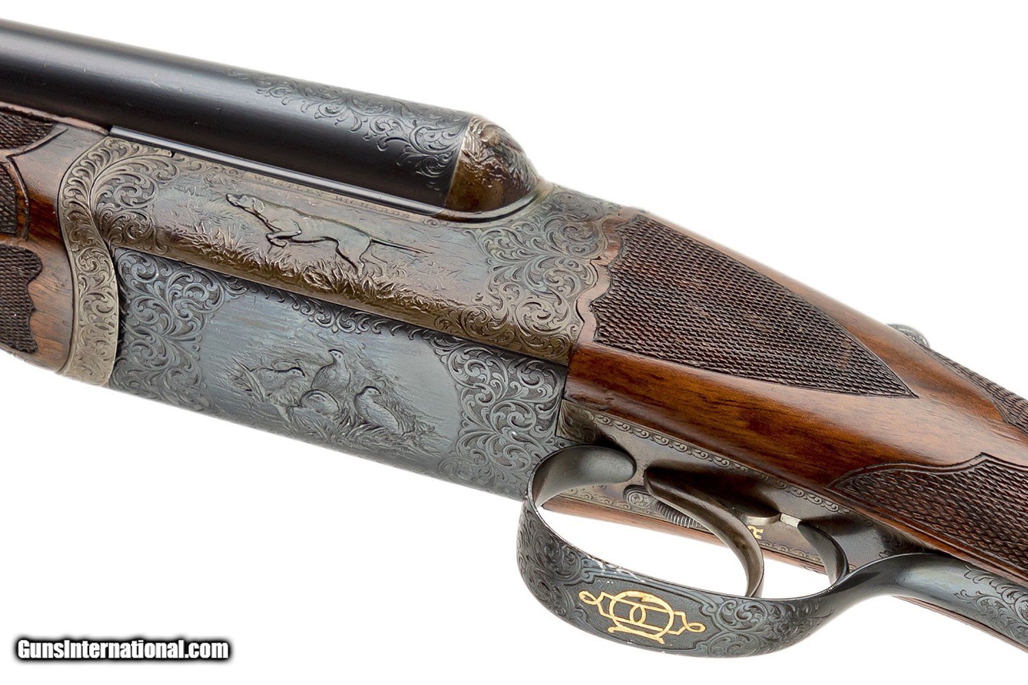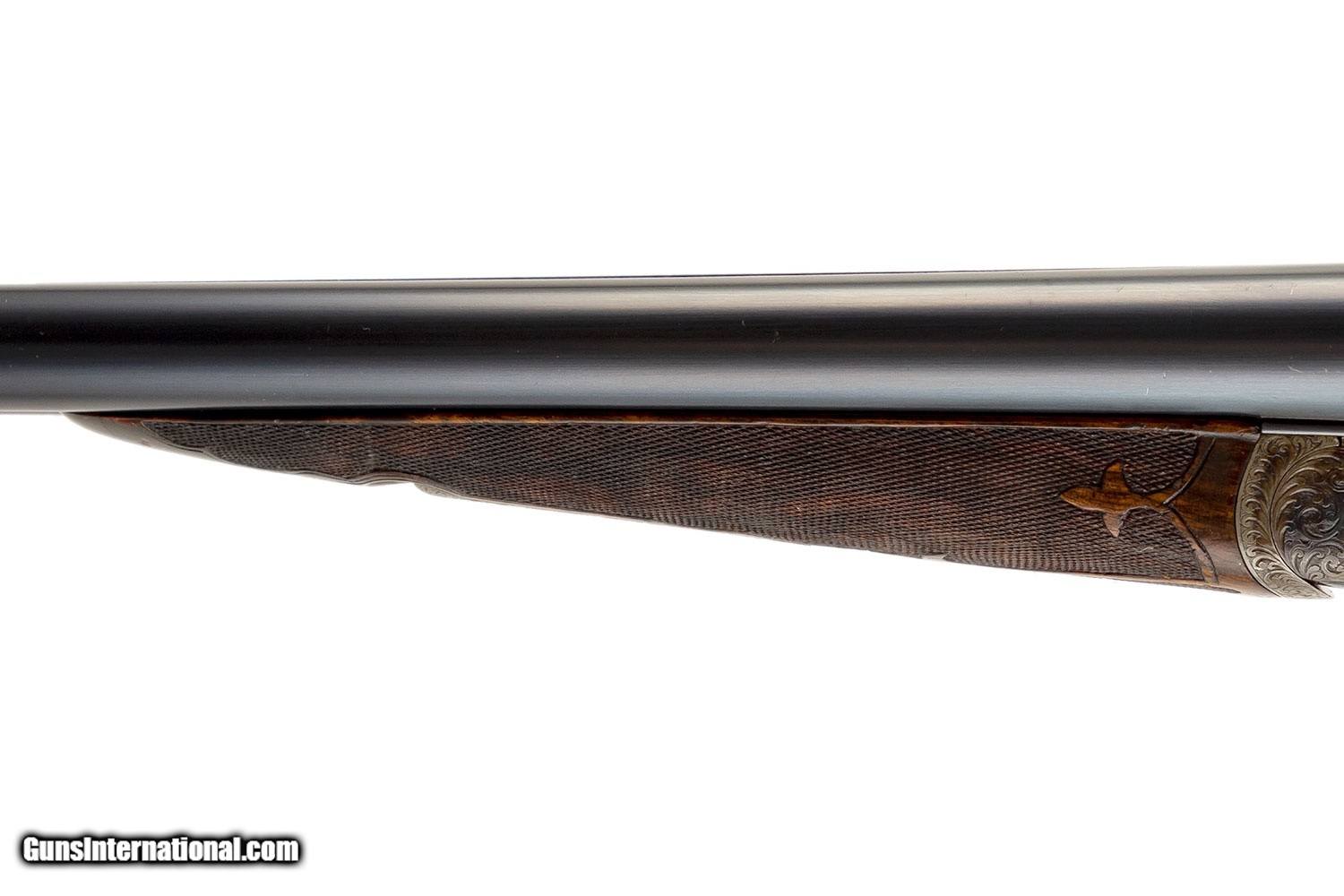 Description: SN# 17XXX 28" SOLID RIB BARRELS (.013 AND .019 CONSTRICTIONS) 2 3/4" CHAMBERS LONDON REPROOF 2008 TO 2 3/4" WALLS: .023 LT, .023 RT BORES: .739 LT, .737 RT SINGLE SELECTIVE TRIGGER EJECTORS SPLINTER FOREARM ENGLISH GRIP CHECKERED BUTT GREAT REFINISHED CONDITION WITH SOME LIGHT HANDLING FEW MINOR FINSIH SCRATCHES ON BARREL BORES ARE BRIGHT AND SHINY 6LBS 2 OZ 2 1/8" DAH 1 1/2" DAC 14 5/8" LOP CASED EXTRA SET OF LOCKS IN FAUX CROCODILLY CASE SOLD |