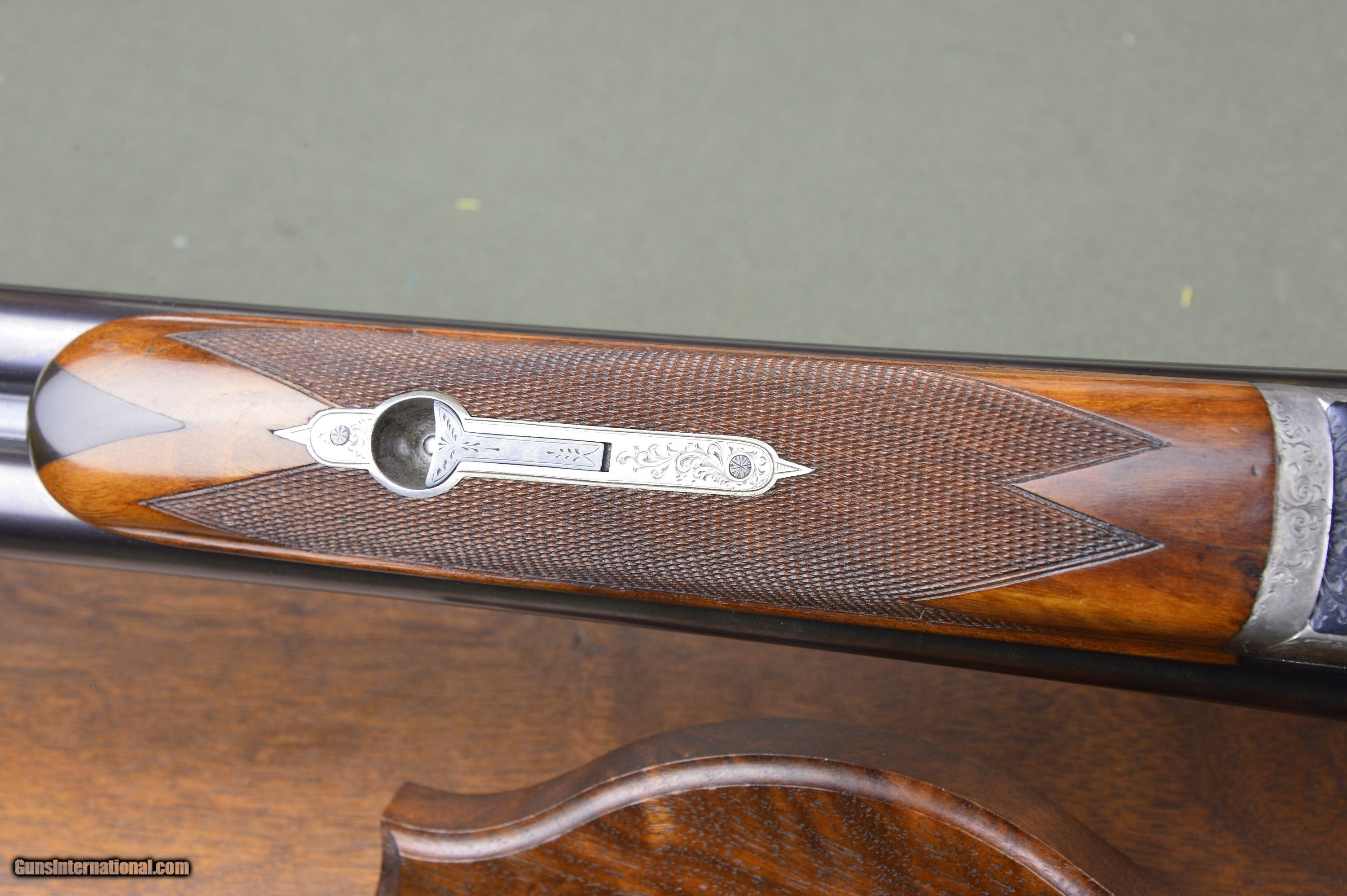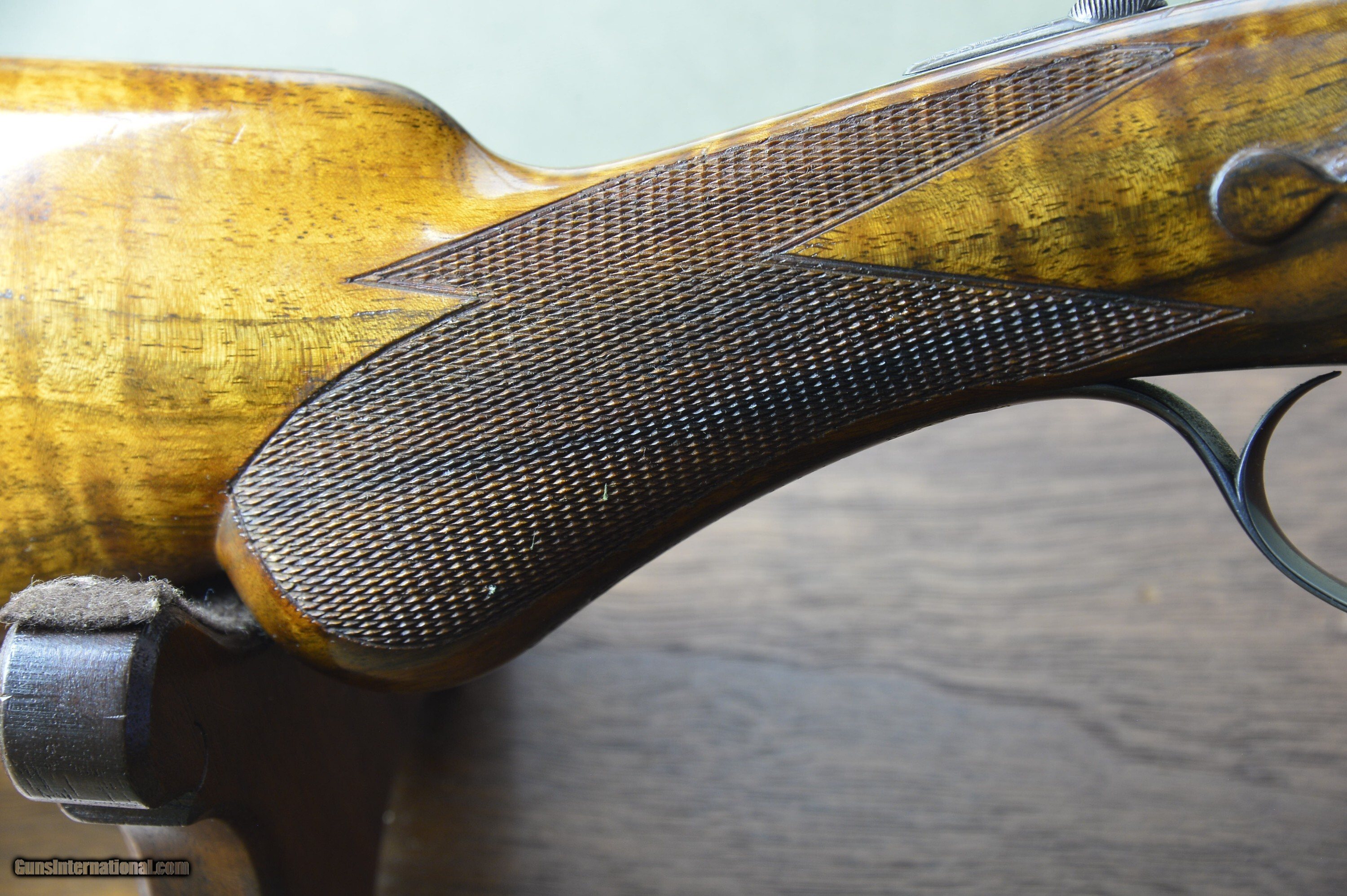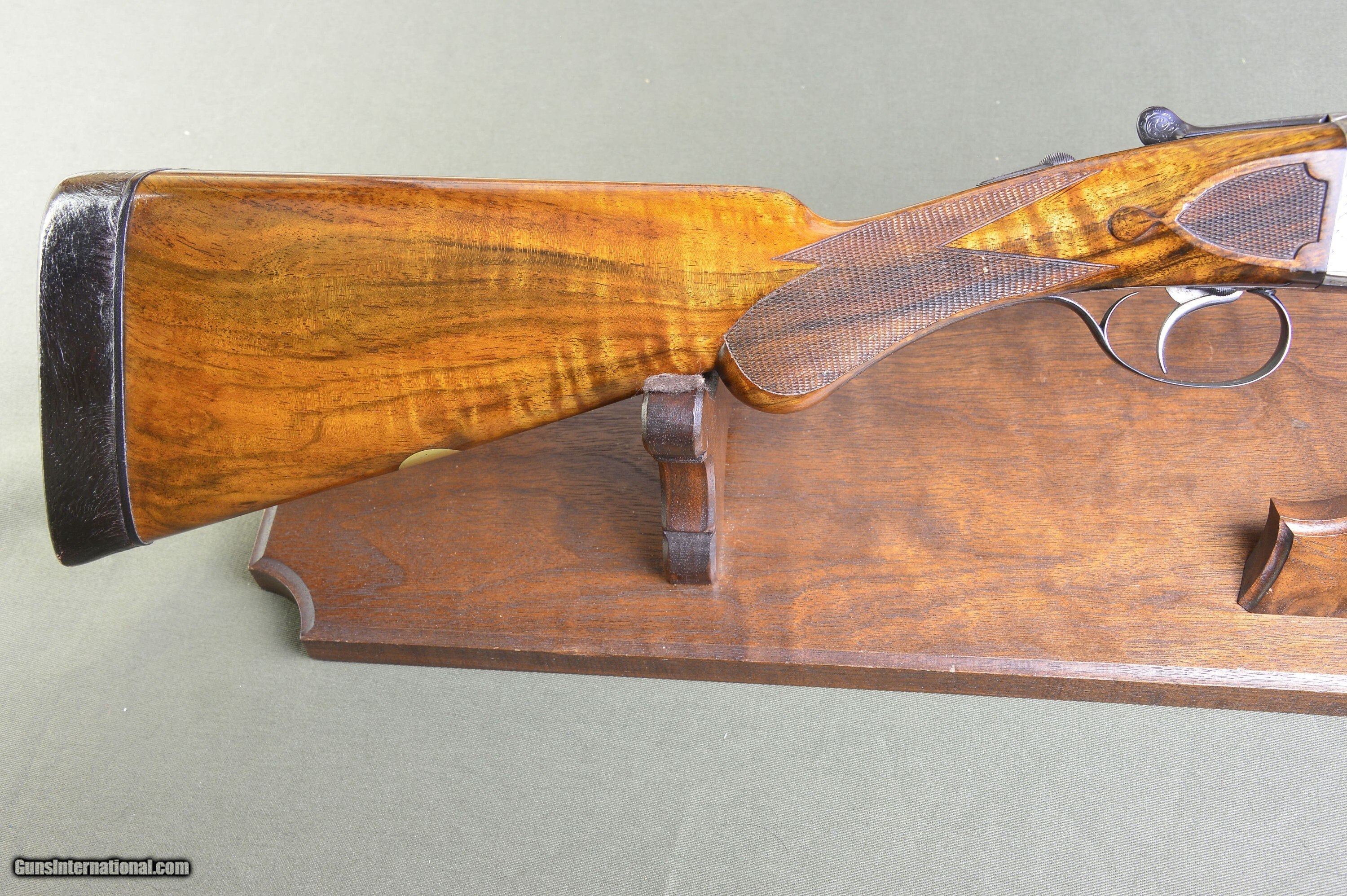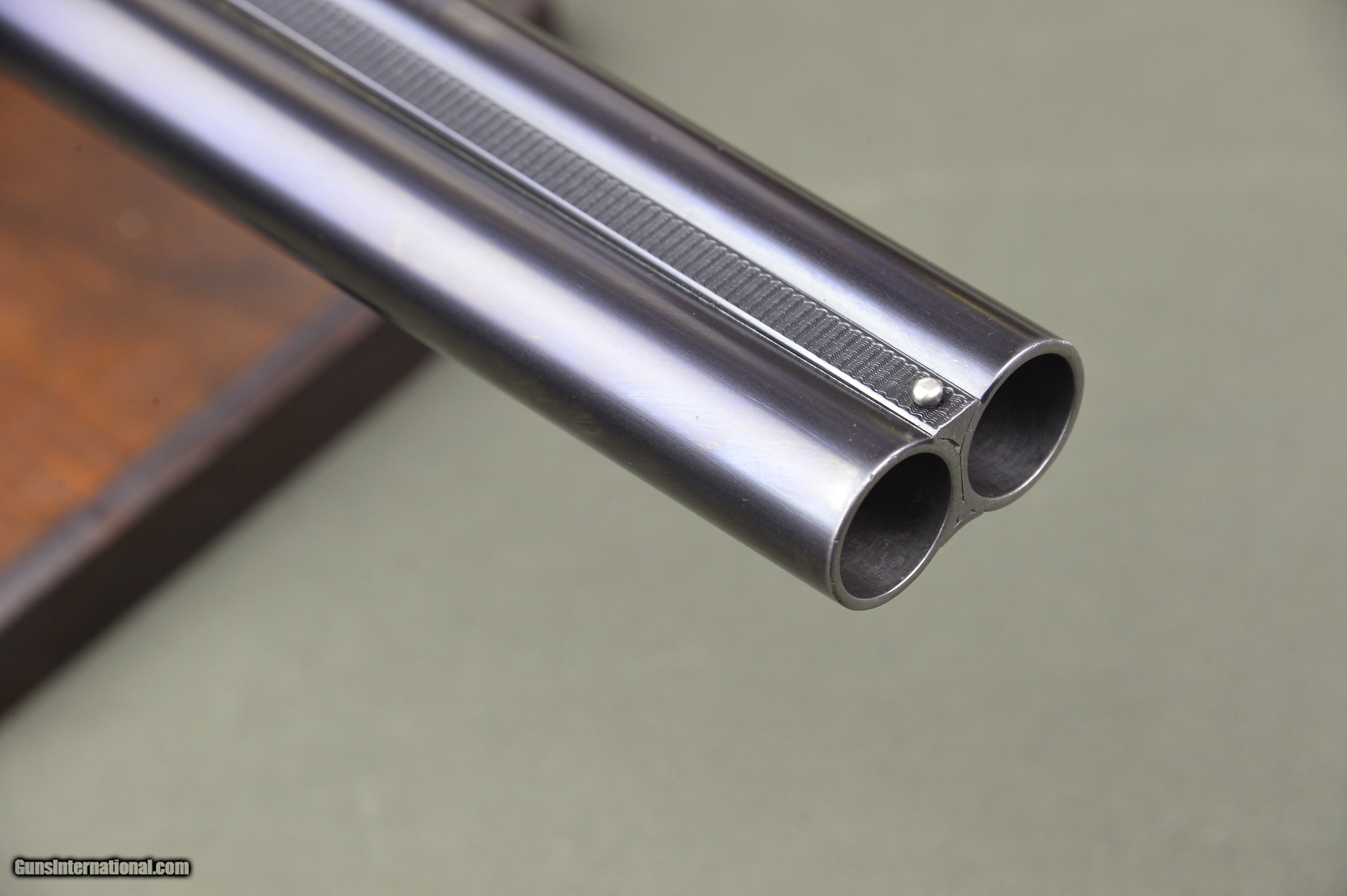 Description: Rare and handsome Westley Richards Droplock Pigeon Gun proofed for 1-1/4oz loads with sharp engraving and residual case coloring. Nicely figured French walnut stock and forearm. Single selective trigger, sideclips for strength, automatic ejectors, and auto safety. Westley Richards serial number T6569 was made 1914-15 and weighs 7lbs 12oz. Great weight for flyer shooting and clays. Presented in its original oak & leather case with maker’s labels and straps. The 30” nitro steel barrels are chambered for 2-1/2” shotshells proofed for 1-1/4oz loads and the forcing cones have been professionally relieved, possibly at the time of manufacture. They are topped by a raised solid tapered striated rib. The top of the right barrel is inscribed “Westley Richards Co.” and top of the left has “London” inscribed. The right barrel is bored 0.734 with a constriction of 0.035 for Full choke. Minimum wall thickness is 0.040. The left barrel is bored 0.735 and has a constriction of 0.040 for Extra Full choke. Minimum wall thickness is 0.036. The swept back Prince of Wales stock and splinter forearm are made of nicely figured French walnut. The forearm has a checkered grip panel, an ebony insert, and a Deeley forearm latch. Stock dimensions are 14-1/2” including a 1-1/4” leather pad by 1-5/8” by 2-1/2”. Cast off the righthanded shooter. This Westley Richards droplock pigeon gun has 30” nitro steel barrels; most droplocks were made with 28” barrels. It is a sturdy pigeon gun with barrel top extension, 1-1/4oz proofs, and sideclips. With its overall weight of 7lb 12oz lowering felt recoil it is a pleasure to shoot in the rings or on clays. These droplocks do not become available very often. Don’t wait too long. *** Please note that the photographs are part of the description. I am an FFL and require a signed copy of your dealer’s FFL license. Not for sale where prohibited by state or local laws. Buyer is responsible for all shipping, insurance, and any other related charges. I give a 3-day non-firing inspection period which begins when it arrives at the buyer’s FFL or specified address if the gun is classified as an Antique. Returns at buyer’s expense. *** Price: $14,995.00 Contact Seller |