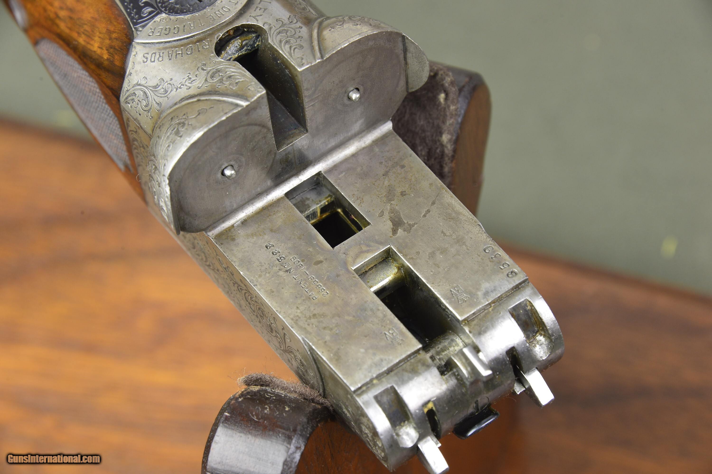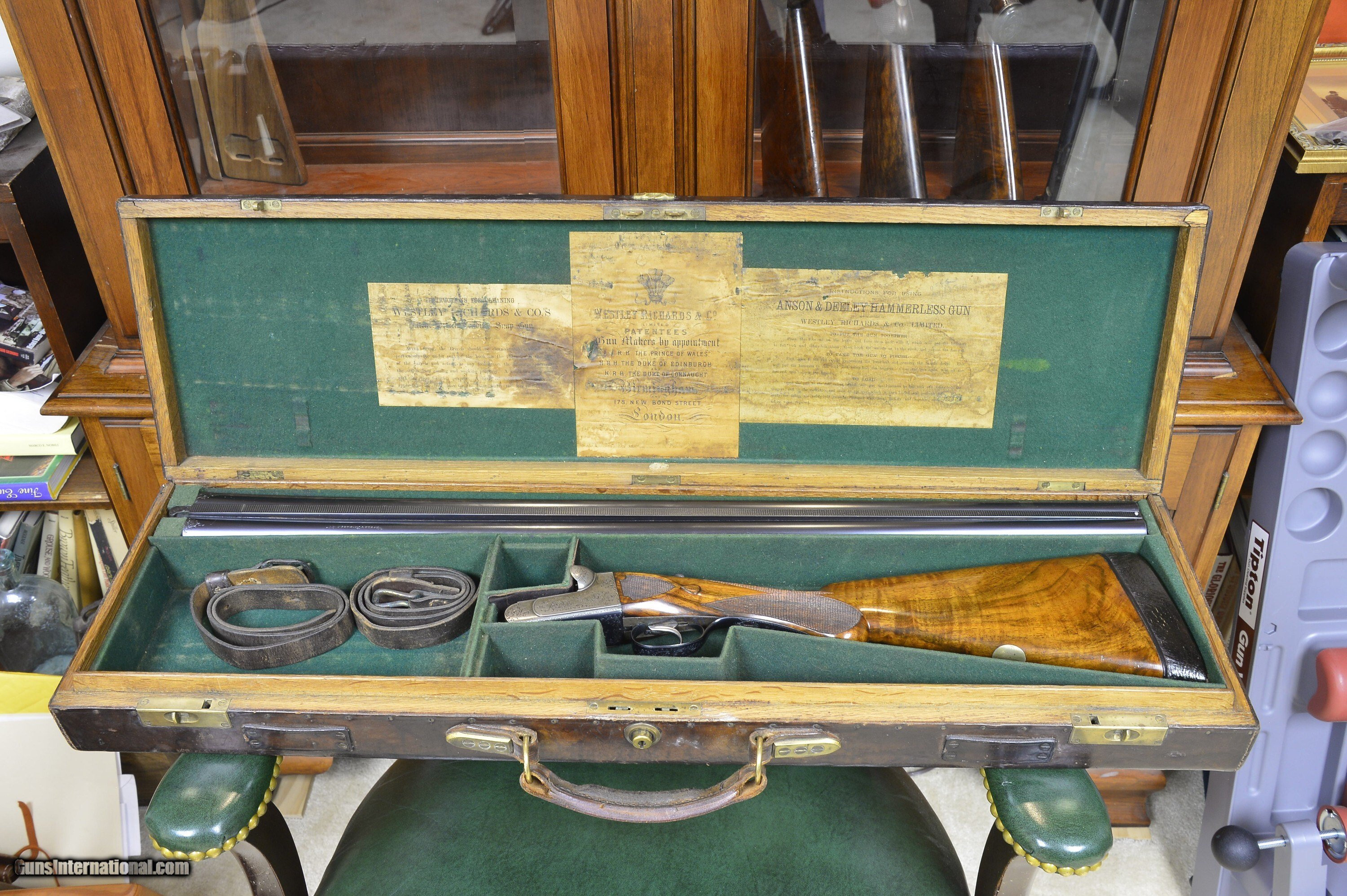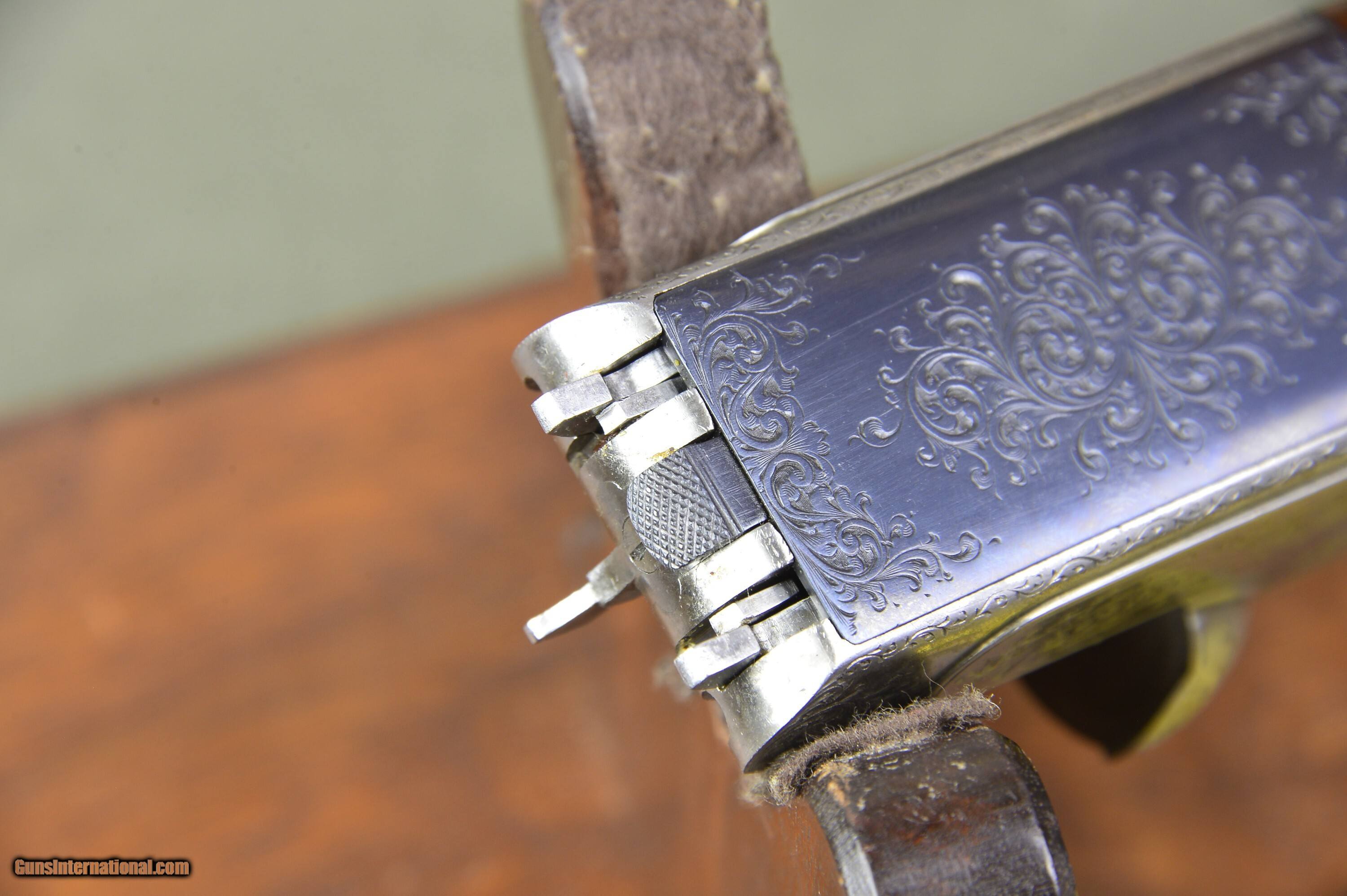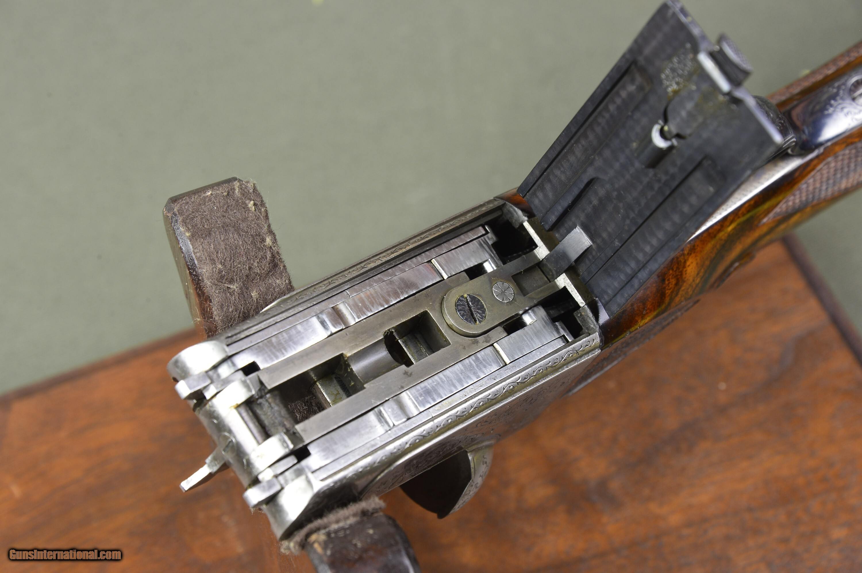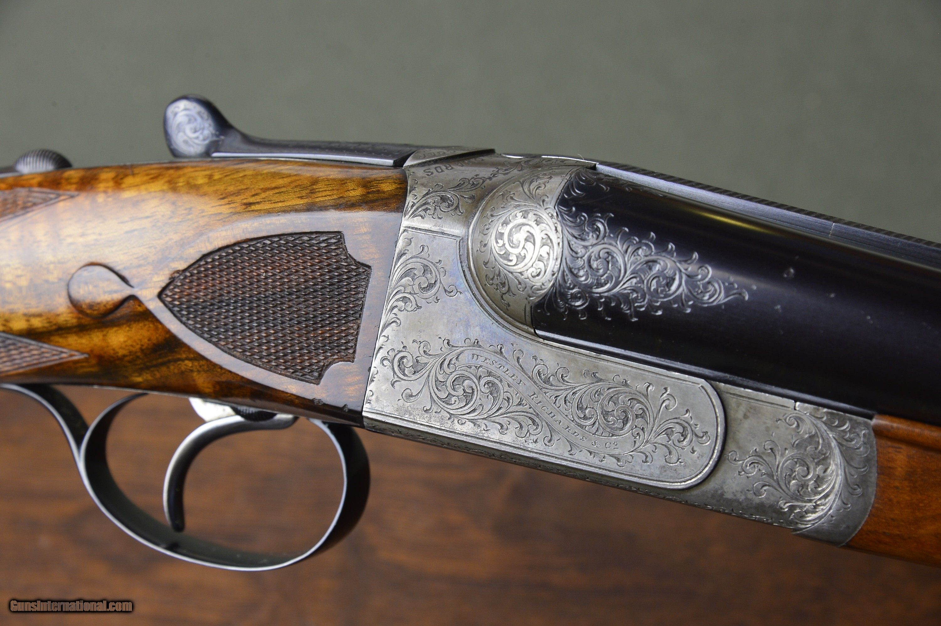 Description: Rare and handsome Westley Richards Droplock Pigeon Gun proofed for 1-1/4oz loads with sharp engraving and residual case coloring. Nicely figured French walnut stock and forearm. Single selective trigger, sideclips for strength, automatic ejectors, and auto safety. Westley Richards serial number T6569 was made 1914-15 and weighs 7lbs 12oz. Great weight for flyer shooting and clays. Presented in its original oak & leather case with maker’s labels and straps. The 30” nitro steel barrels are chambered for 2-1/2” shotshells proofed for 1-1/4oz loads and the forcing cones have been professionally relieved, possibly at the time of manufacture. They are topped by a raised solid tapered striated rib. The top of the right barrel is inscribed “Westley Richards Co.” and top of the left has “London” inscribed. The right barrel is bored 0.734 with a constriction of 0.035 for Full choke. Minimum wall thickness is 0.040. The left barrel is bored 0.735 and has a constriction of 0.040 for Extra Full choke. Minimum wall thickness is 0.036. The swept back Prince of Wales stock and splinter forearm are made of nicely figured French walnut. The forearm has a checkered grip panel, an ebony insert, and a Deeley forearm latch. Stock dimensions are 14-1/2” including a 1-1/4” leather pad by 1-5/8” by 2-1/2”. Cast off the righthanded shooter. This Westley Richards droplock pigeon gun has 30” nitro steel barrels; most droplocks were made with 28” barrels. It is a sturdy pigeon gun with barrel top extension, 1-1/4oz proofs, and sideclips. With its overall weight of 7lb 12oz lowering felt recoil it is a pleasure to shoot in the rings or on clays. These droplocks do not become available very often. Don’t wait too long. *** Please note that the photographs are part of the description. I am an FFL and require a signed copy of your dealer’s FFL license. Not for sale where prohibited by state or local laws. Buyer is responsible for all shipping, insurance, and any other related charges. I give a 3-day non-firing inspection period which begins when it arrives at the buyer’s FFL or specified address if the gun is classified as an Antique. Returns at buyer’s expense. *** Price: $14,995.00 Contact Seller |