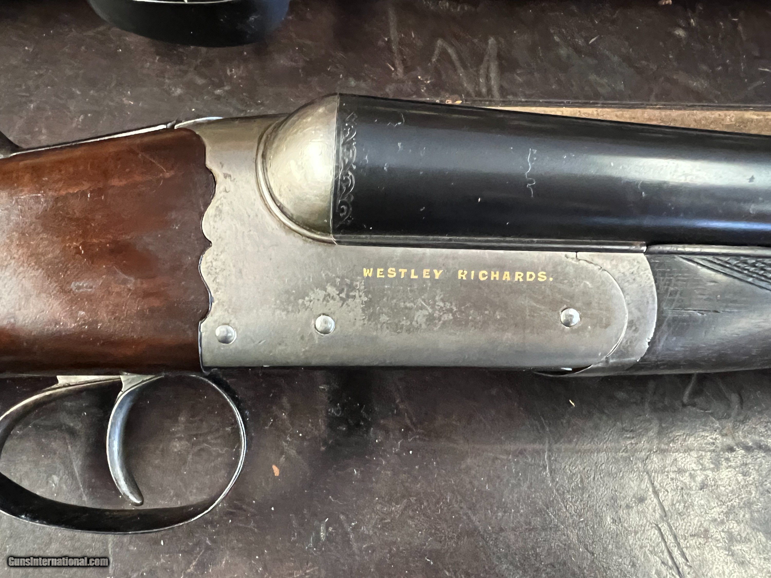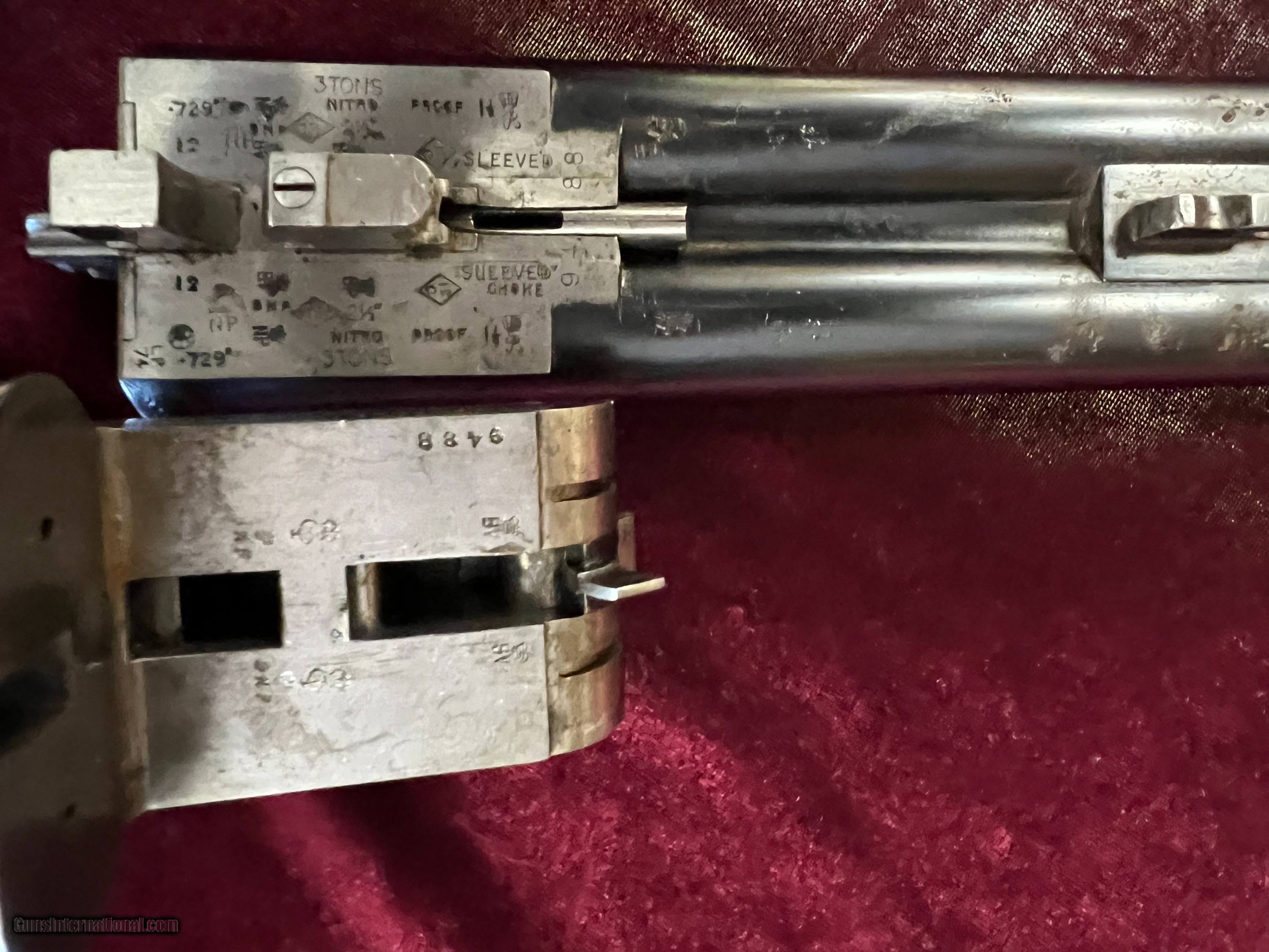 Description: Hello all. In this listing we are selling a Pair of Gold Name Westley Richards. These Side by Side shotguns sport 28" Nitro Proof barrels. The serial numbers are 9488 and 1414. They are sleeved, 2 1/2" chambers, with one choked for 1/4 & 3/4 with 14 3/4" length of pull weighing 6 lbs 12 oz. The other is 6lbs 8oz with 1/4 and Full. Both guns are very crisp, both tight on face, with shiney bores. The checkering on the wood is crsip, including the checkered butts. The wood is fine, they have clean metal, with 95% blue. Both guns are in the makers full leather case with brass corners. The case is in great shape for its age. If you have any questions or would like additional photos, please feel free to contact us. Buyer pays shipping. We are selling this fabulous pair of side by sides for well below wholesale at $6500. SOLD Shotgun Gauge: 12 Gauge Manufacturer: Westley Richards Model: Gold Name Serial Number: 9488 / 1414 Barrel Length: 28 Weight: 6lbs 12oz / 6lbs 8oz Chokes: 1/4 & 3/4 / 1/4 & Full |