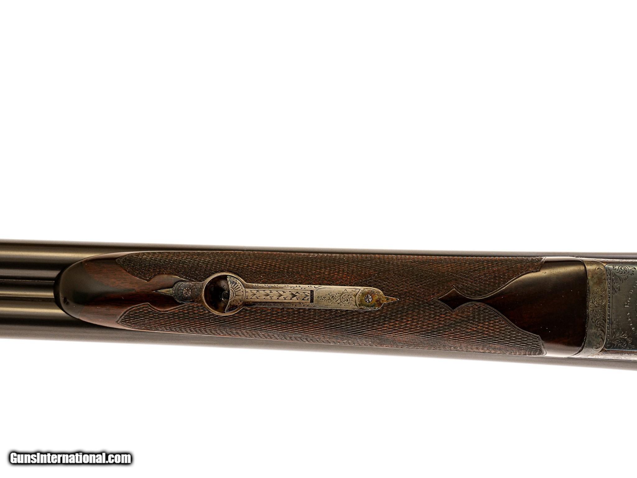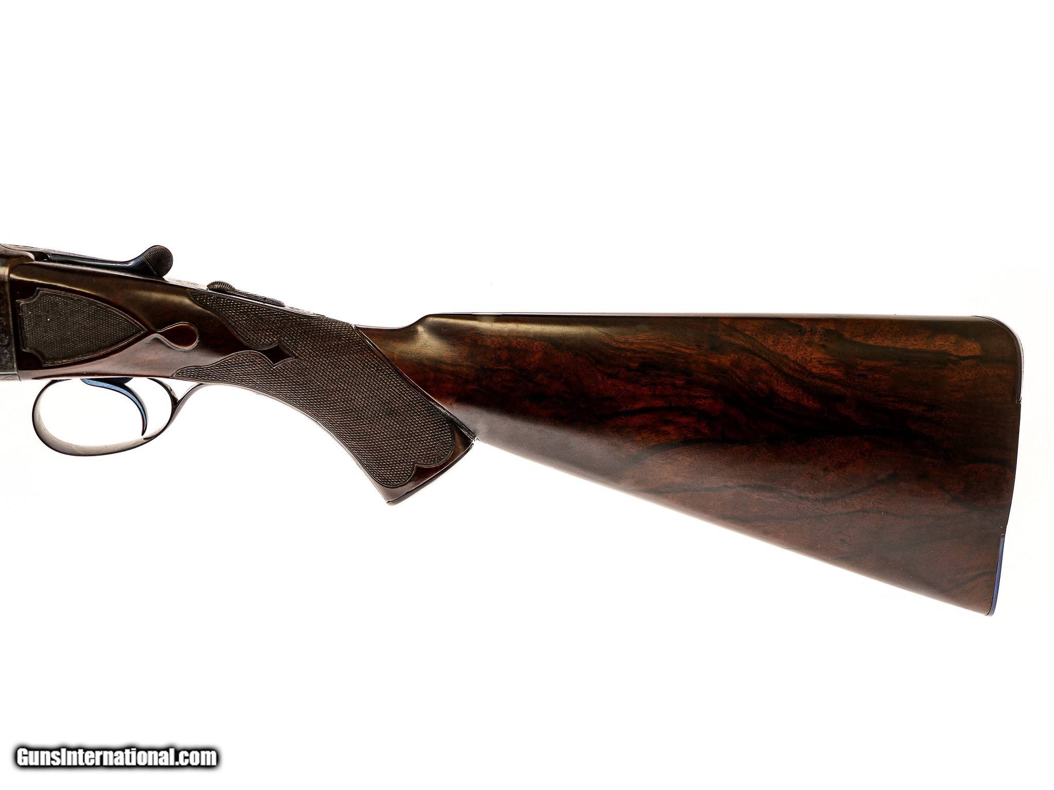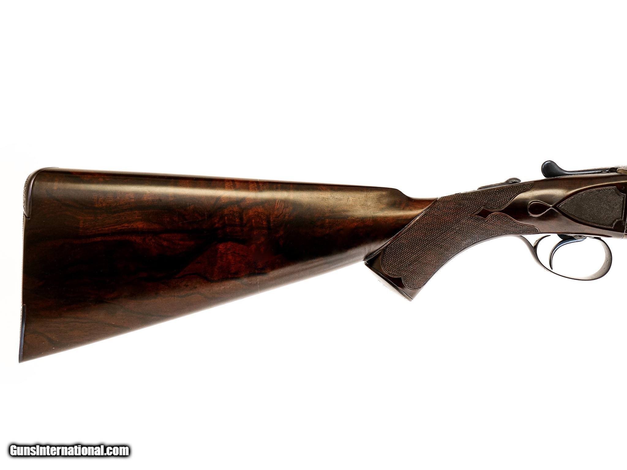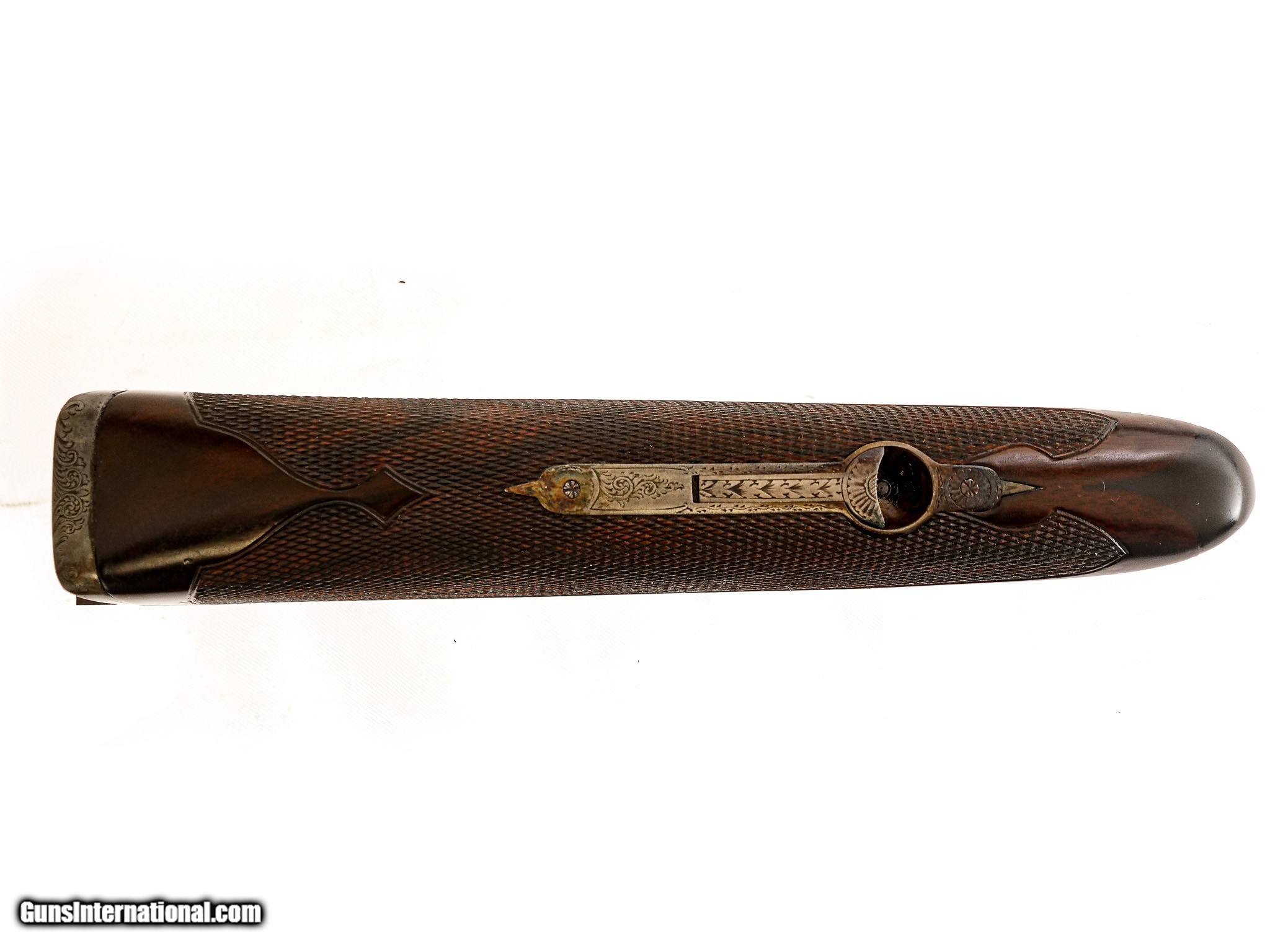 Description: Westley Richards - Pre-War, 20ga. 26" Barrels Choked IC/M. Proofed at 2 ½” and the chamber length remains 2 ½”. Drop Lock, patented single selective one trigger. Magnificent game scene and scroll engraving, side clip, third fastener, recessed checkered side panels, drop points, fleur-de-lis deluxe checkering, heel and toe plates, capped horn grip gap that is also engraved like the gun. Retains 98% of case color and blue, including on trigger and drop plate. Jeweled drop lock with interior hinged floor plate. Highly figured Turkish walnut, engraving is sharp like the day it was made. Gun remains AS NEW. Unused. Has all of its pre-war finishes. Truly an outstanding gun. Inv: 62247 5 lbs. 7 oz. 14 ¼" x 1 5/8" x 2 ½" $26,995.00 SOLD Curio/Relic: Yes |