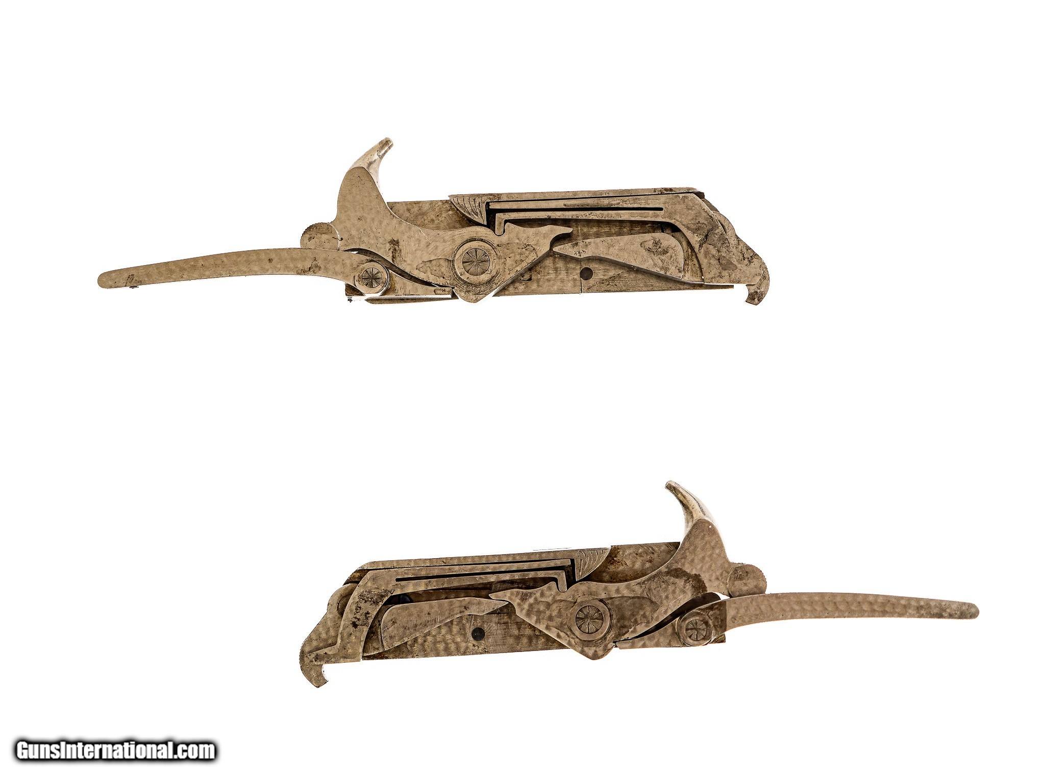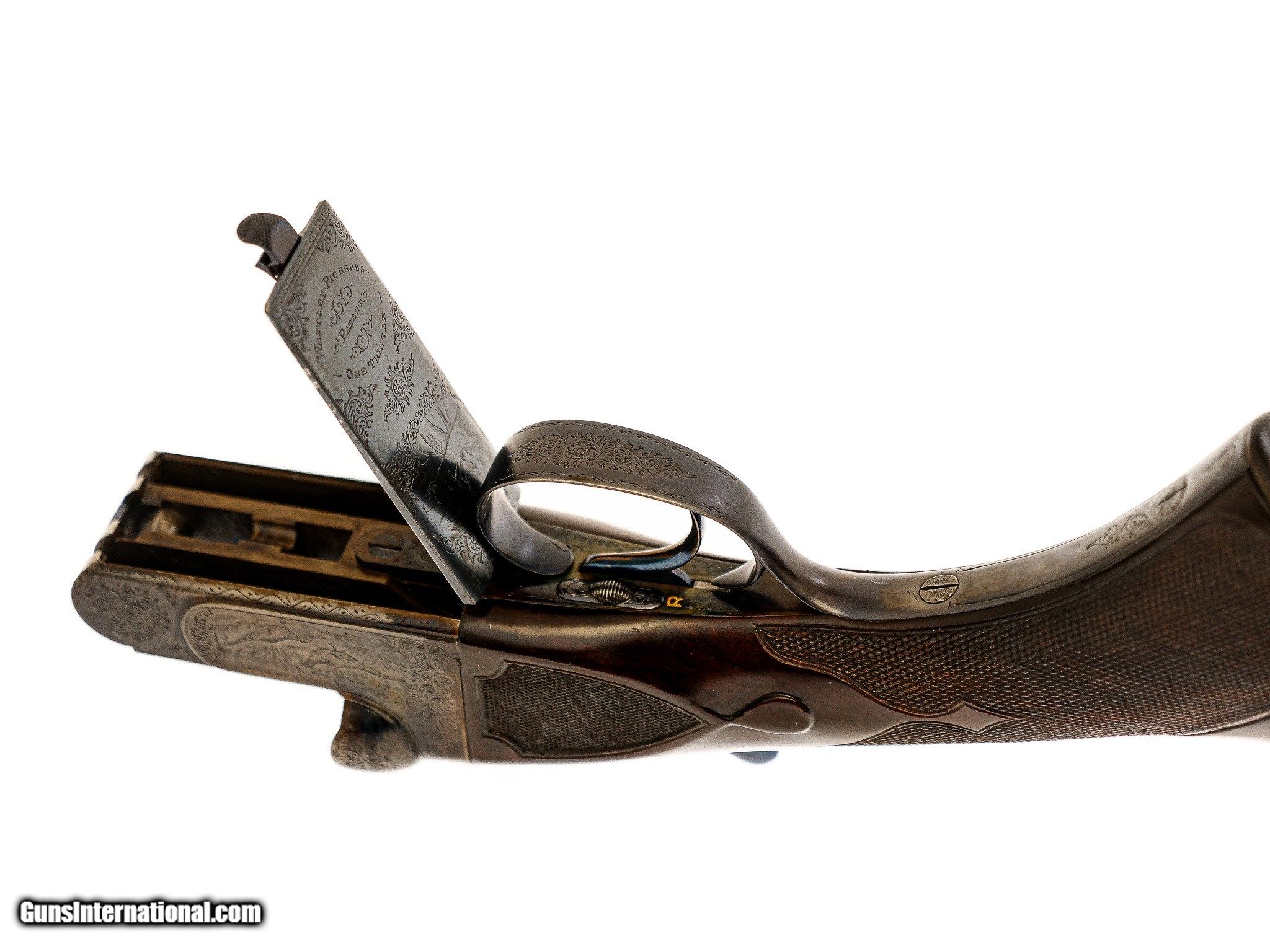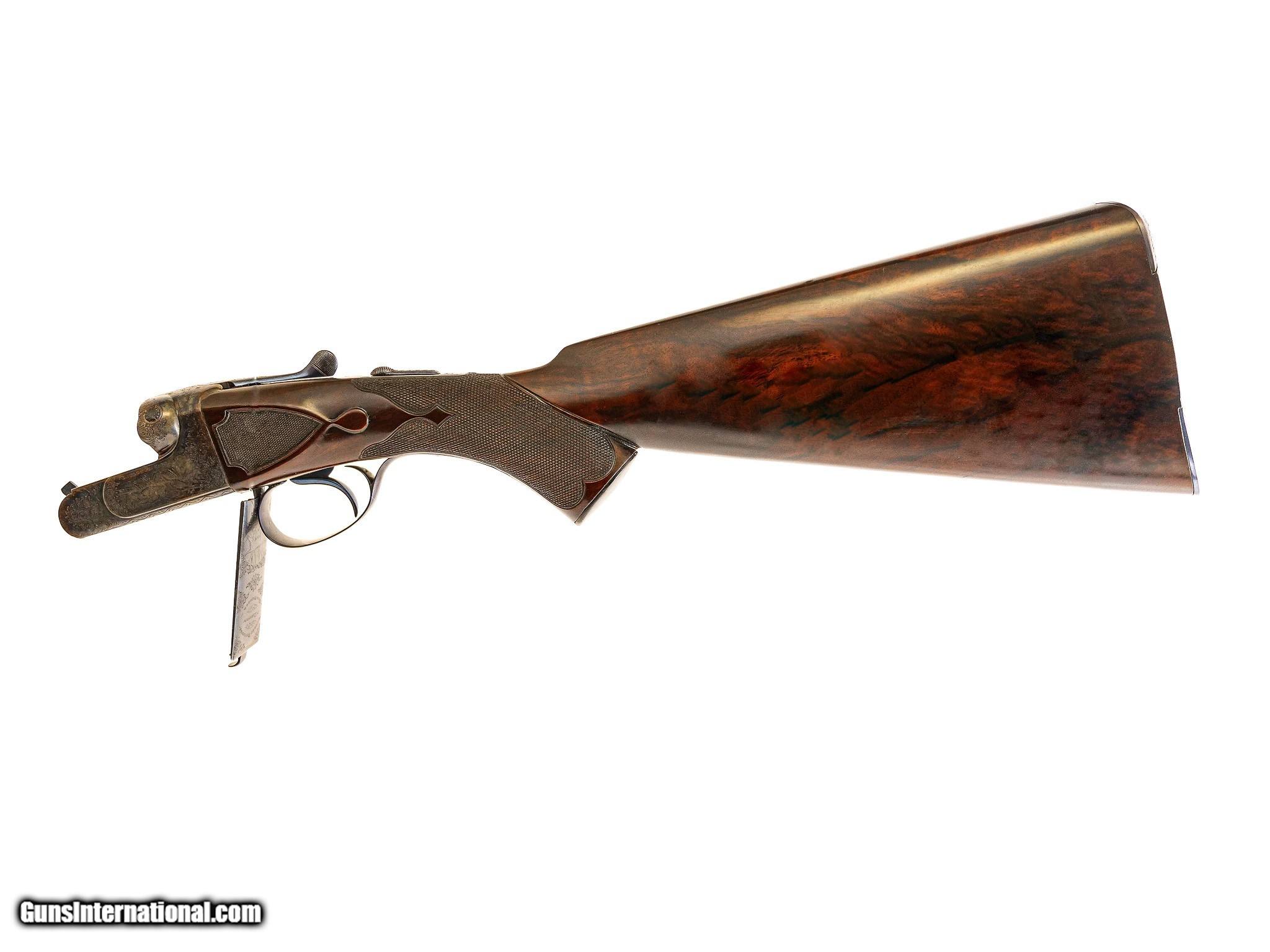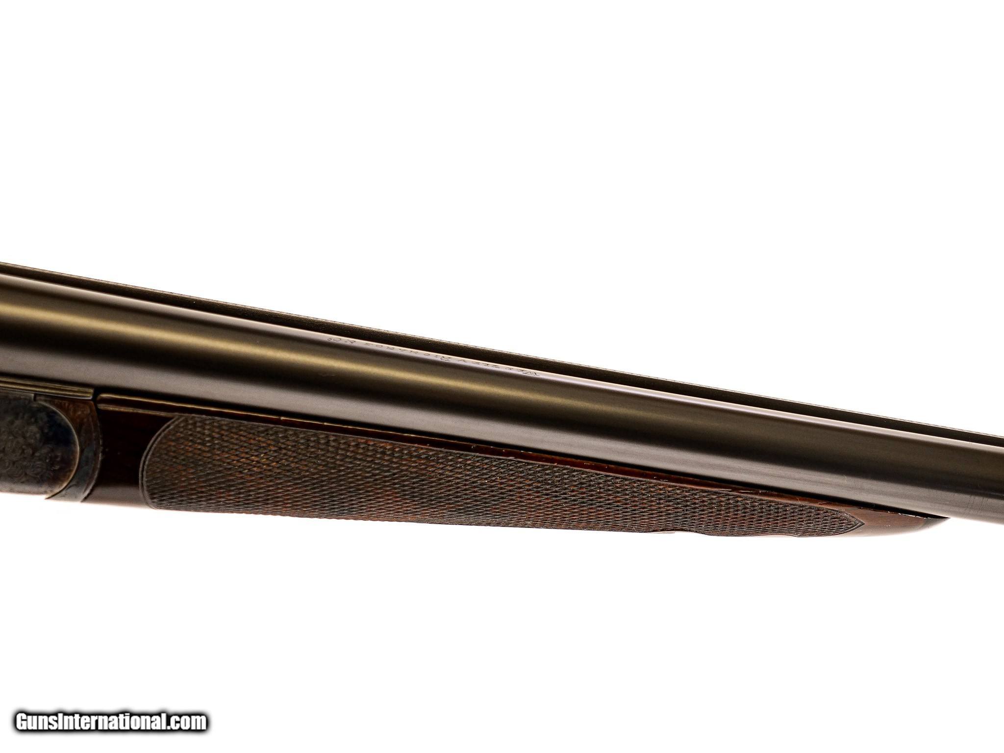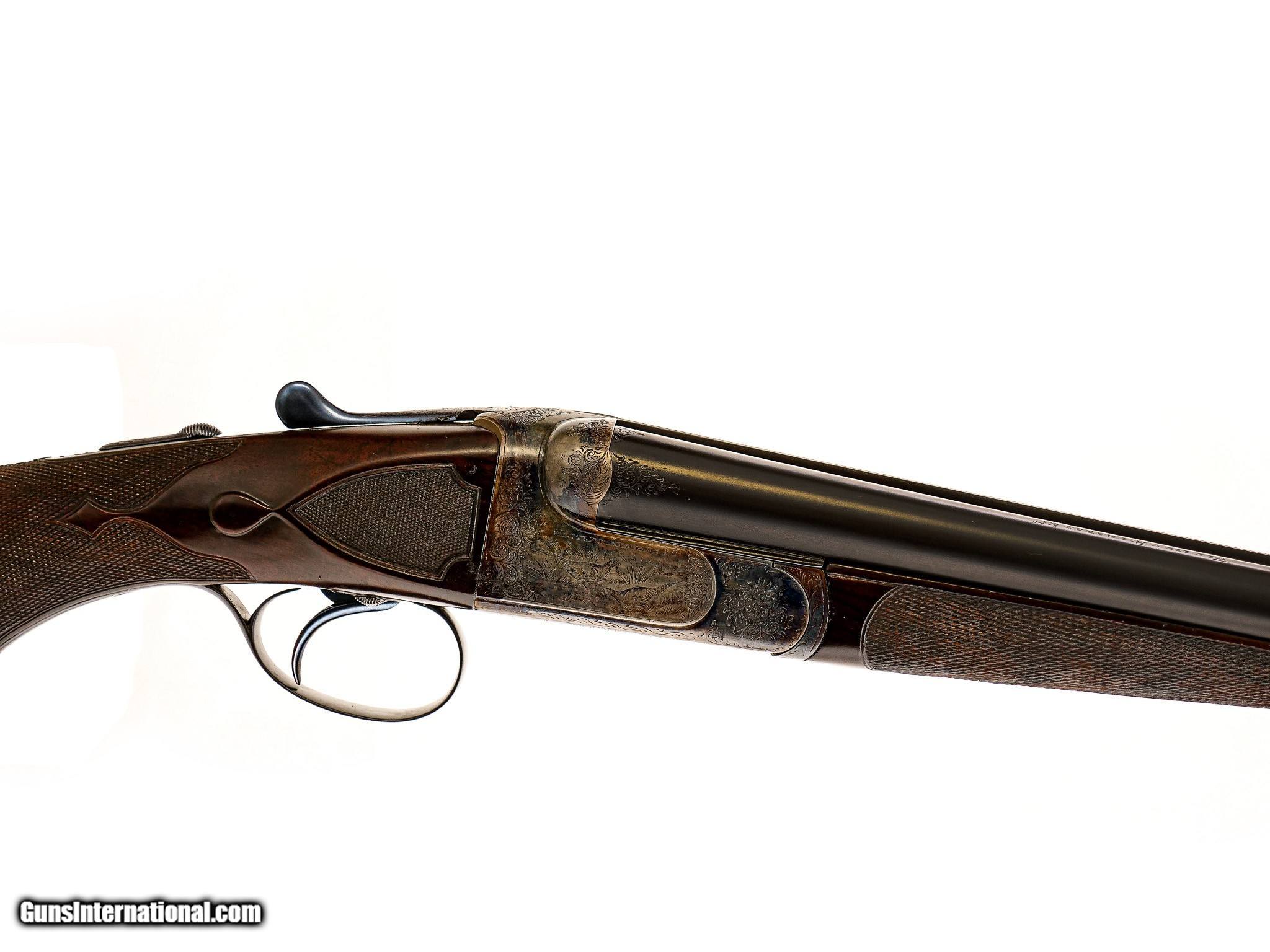 Description: Westley Richards - Pre-War, 20ga. 26" Barrels Choked IC/M. Proofed at 2 ½” and the chamber length remains 2 ½”. Drop Lock, patented single selective one trigger. Magnificent game scene and scroll engraving, side clip, third fastener, recessed checkered side panels, drop points, fleur-de-lis deluxe checkering, heel and toe plates, capped horn grip gap that is also engraved like the gun. Retains 98% of case color and blue, including on trigger and drop plate. Jeweled drop lock with interior hinged floor plate. Highly figured Turkish walnut, engraving is sharp like the day it was made. Gun remains AS NEW. Unused. Has all of its pre-war finishes. Truly an outstanding gun. Inv: 62247 5 lbs. 7 oz. 14 ¼" x 1 5/8" x 2 ½" $26,995.00 SOLD Curio/Relic: Yes |