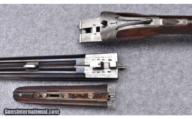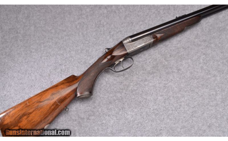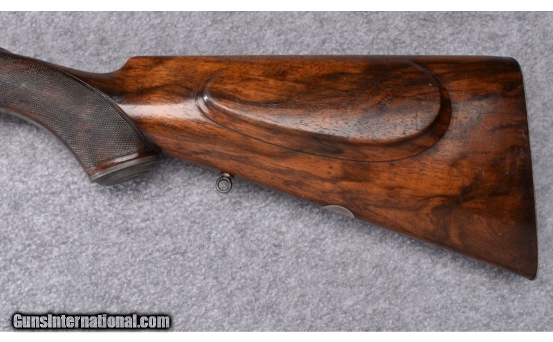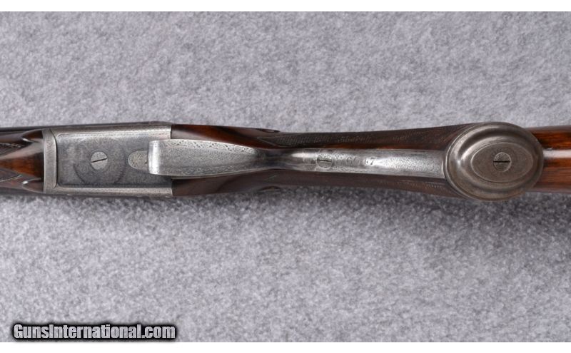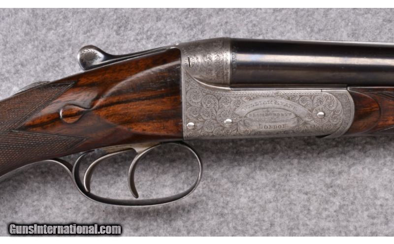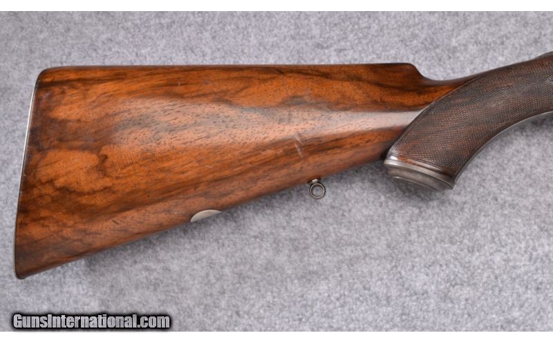 Description: Barrels have been possibly re-blacked at some point. Bore remain bright and excellent. Wood shows hunting use and remains free of cracks. Wood appears to be original finish throughout. Action remains tight as new. Barrels marked with two regulation loads:"120 GRS. C&H No. 6 ~ 270 GR Express Bullet" marked on left barrel.Or "48 GRS. Cordite ~ 365 Nickel Bullet" marked on right barrel.Water Table is also marked with the Cordite load. Solid example of a London double! SOLD Manufacturer: S/N 60XX Caliber Info: .450 Express Rifle Chambers: 3 1/4 Metal Condition: Very Good Wood Condition: Good Bore Condition: Excellent Barrels: 26" Fluid Steel Triggers: Double Trigger with Automatic Safety Stock: Checkered Walnut Pistol Grip with Steel Cap Stock Dimensions: 14 3/8" LOP Fore End: Checkered Walnut Splinter Butt Pad: Serrated Steel Weight: 9 LB Sights: Bead Front - One Standing - Two Folding Leaf Rear Item Location: Wheeling, WV |