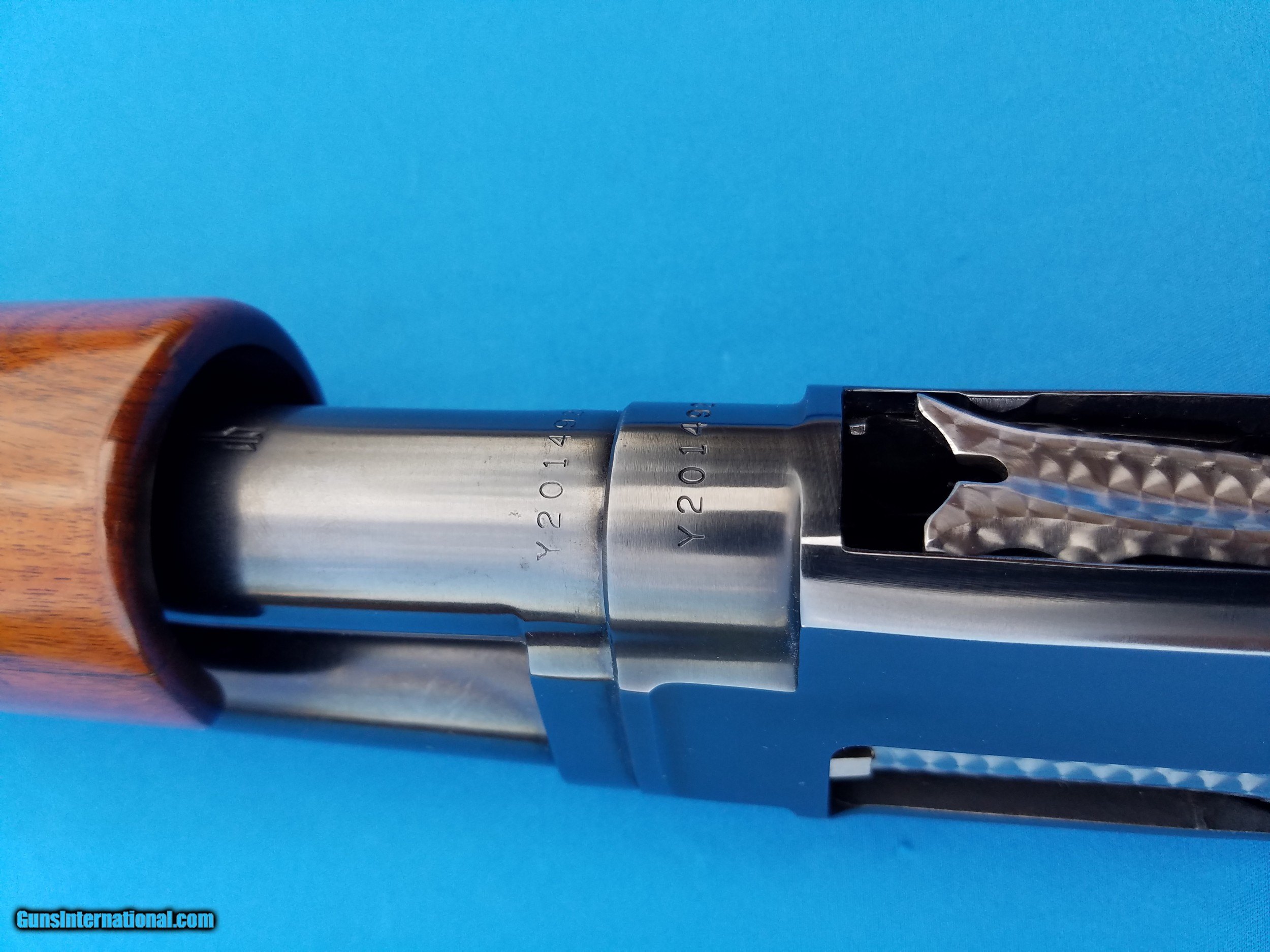 Description: A fine and highly finished Winchester model 12 Trap shotgun, Y series made in 1973. Vent rib barrel with full choke measuring 30 inches. LOP is 14 1/2 inches to the edge of the original Winchester pad. The blueing and stock finish on this Model 12 Trap is superb in every detail. Engine turned/jewelled bolt and shell flap. This beautiful shotgun was not handled or shot much as there just is no wear. The forearm on the right side has a small hairline crack towards the action. It is stable and has never been glued. No other apology on this fine example. Beautiful grain in the walnut stocks and a deep original blue on all the metal. Original sight beads on the barrel. Mirror perfect bore as you would expect. Shipped from FFL to FFL. USPS priority mail is 40.00 SOLD |