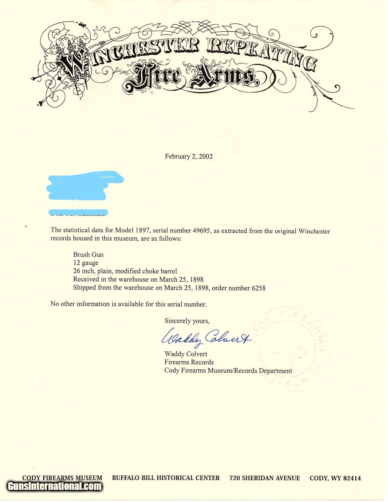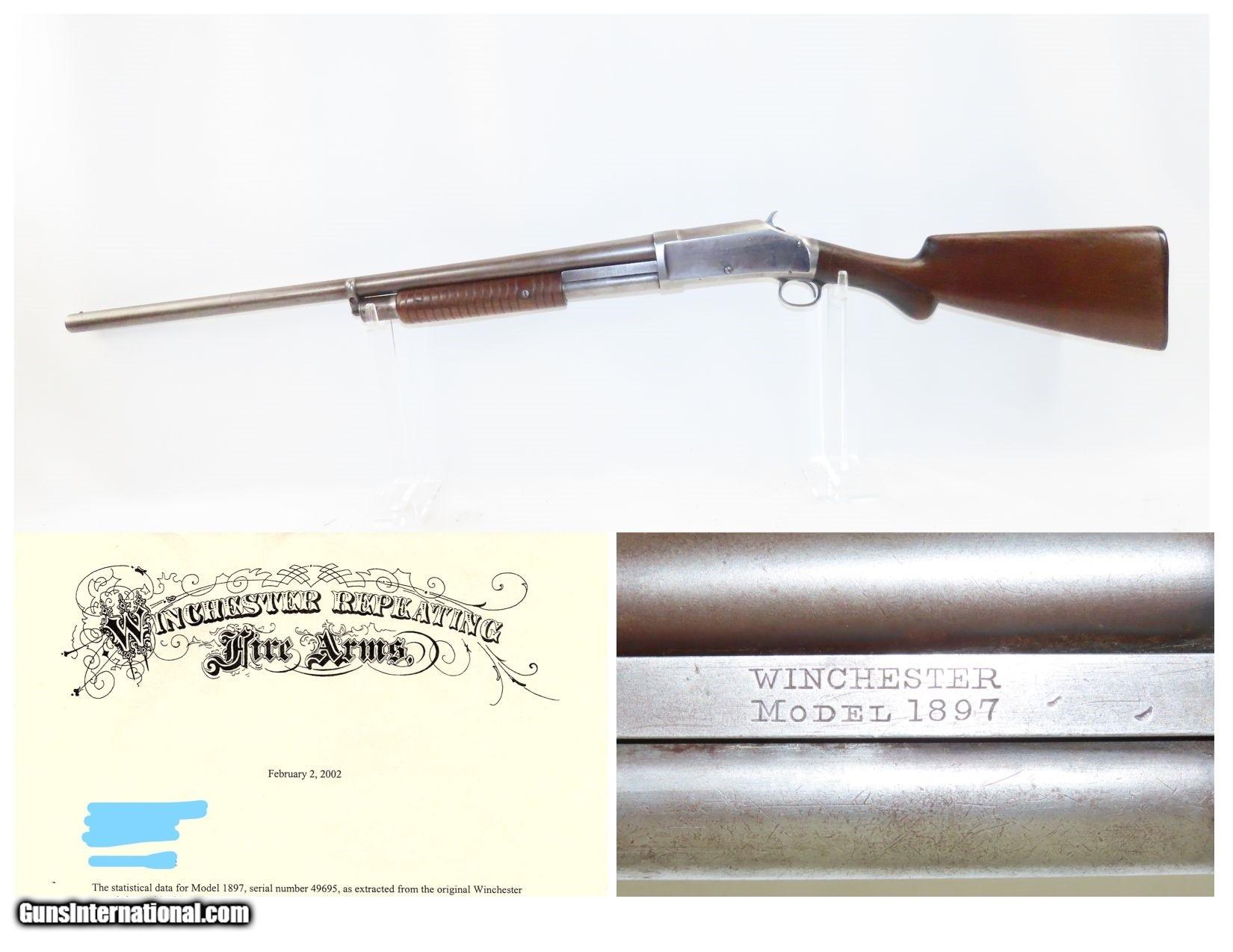 Rare LETTERED Antique WINCHESTER 1897 “BRUSH GUN” Slide Action Shotgun 12 Ga Made in 1898 with Cody Firearms Museum Archive Letter