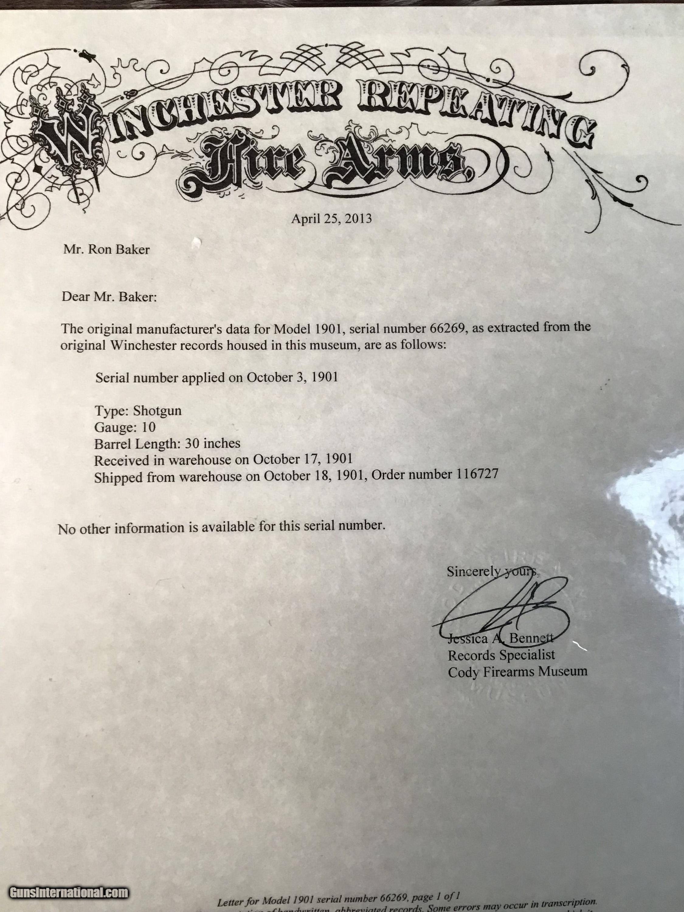 Winchester Model 1901 10 GA Lever Action Shotgun with Letter, Trades Welcome.