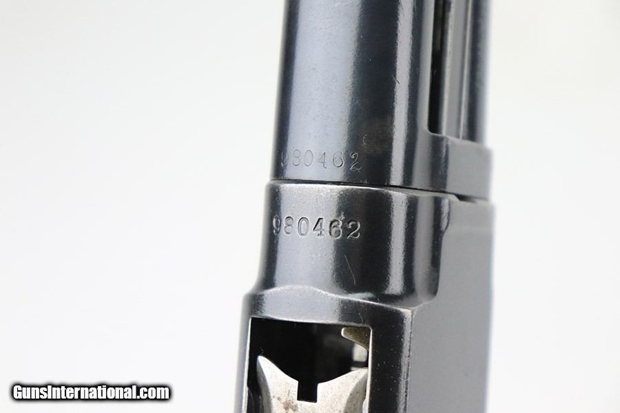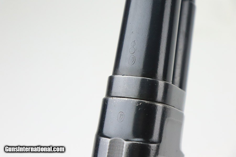 Description: This is a scarce Winchester Model 12 shotgun in riot configuration. It was manufactured in 1942 and issued to the U.S. military. The receiver is marked 'U.S.' with the flaming bomb, and the left side of the butt stock features the 'W.B.' inspector's stamp and crossed cannons cartouche (very faint). The bluing rates about 93% with areas of wear around the high edges in general, very minor muzzle wear, and spotty wear on the magazine tube. Some light scratches here and there along the barrel. While there is not much actual finish loss, there are areas of noticeable pin-pricking, most obvious on the receiver. The wood stock is very nice, but the butt stock appears to have been lightly sanded. Hairline cracks around the wrist and on the handguard. Nice, shiny bore. SOLD Curio/Relic: Yes Shotgun Gauge: 12 Gauge |