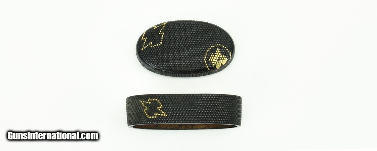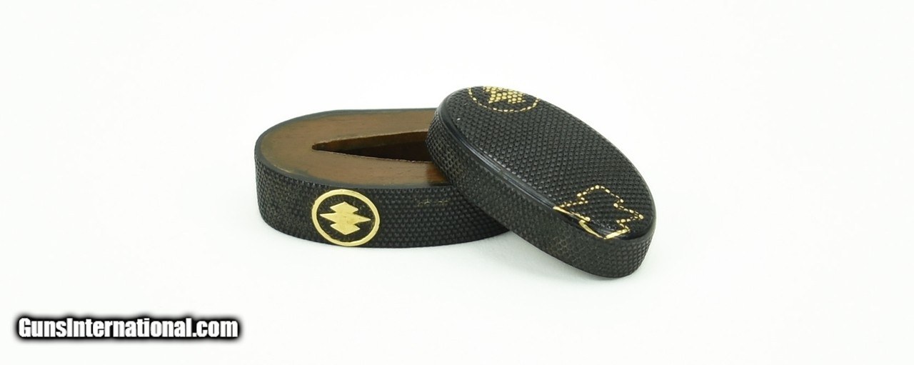 Description: "Kinko Fuchi Kashira. Shakudo Nanako Ground with unusual stylized Diamond Mon Rattern overland in gold. Solid gold Mon on Fuchi. Mumei (unsigned) SOLD |