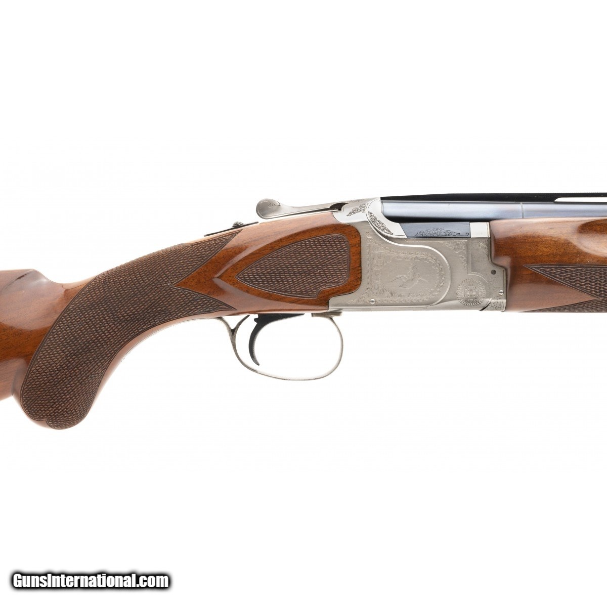 Description: " Deluxe O/U with 27"" barrels with extended chokes. Nicely figured walnut stock and forend and the receiver is engraved with scroll and wild game motif. Overall condition is very good plus with some light wear. SOLD |
