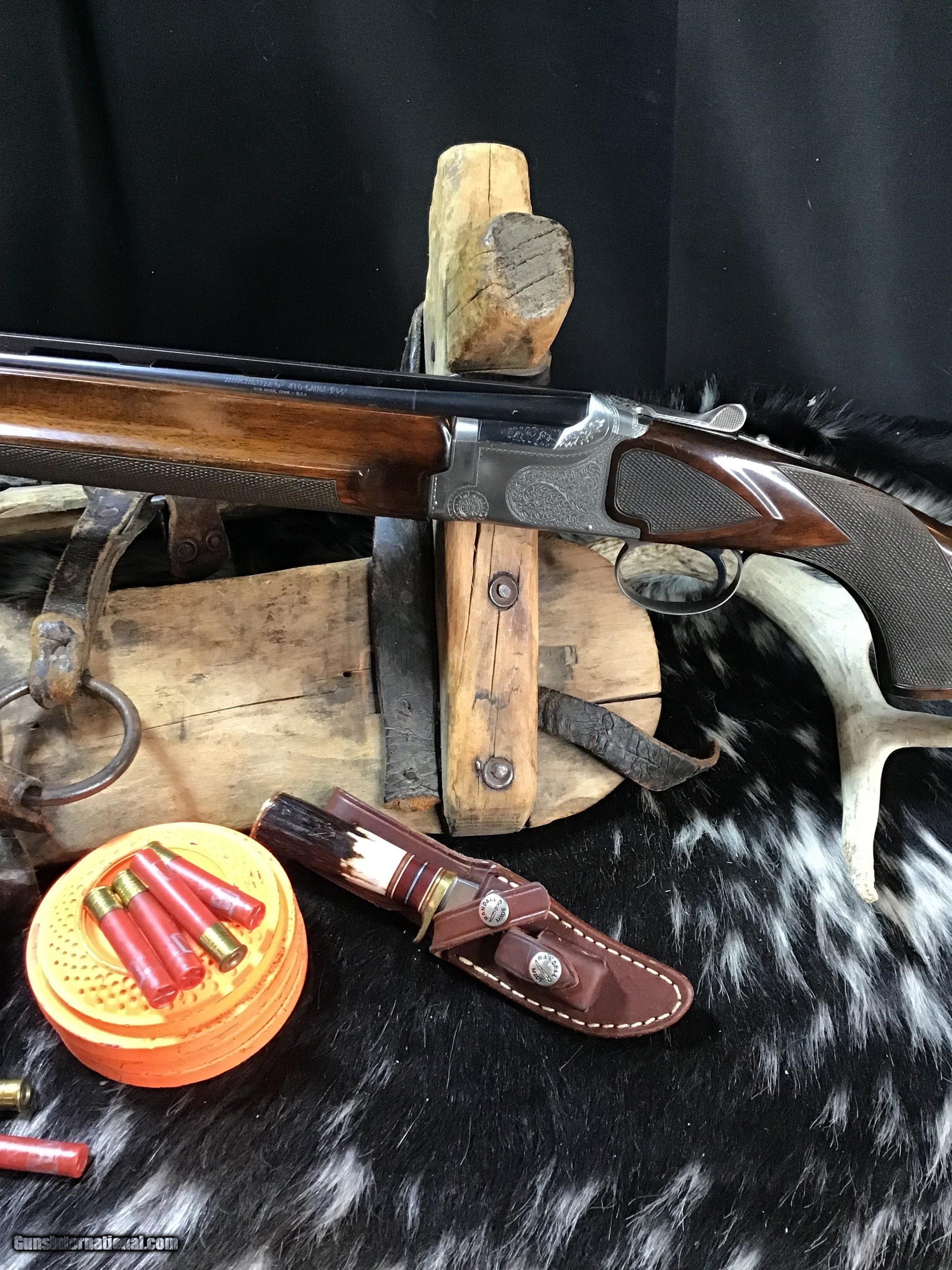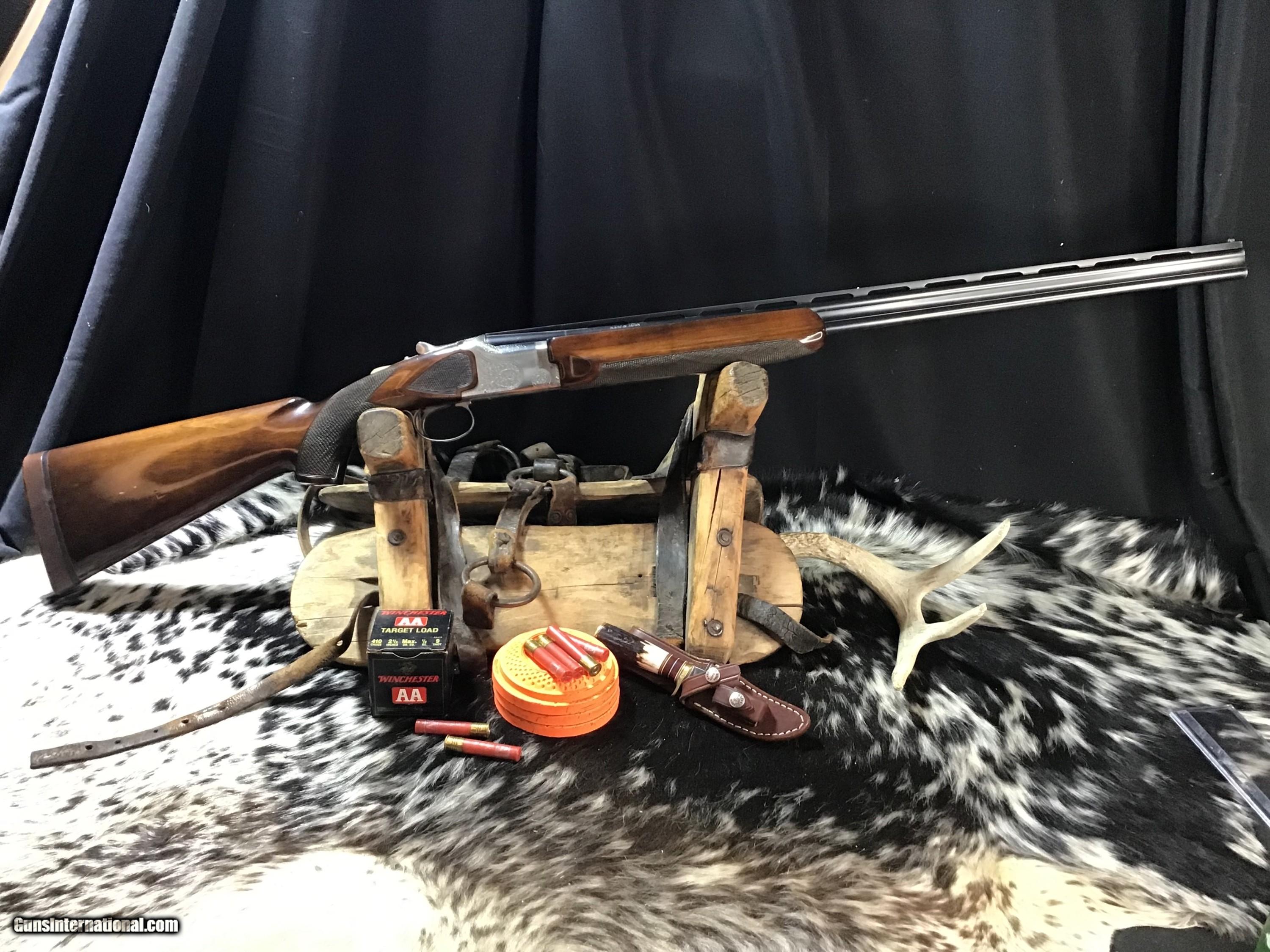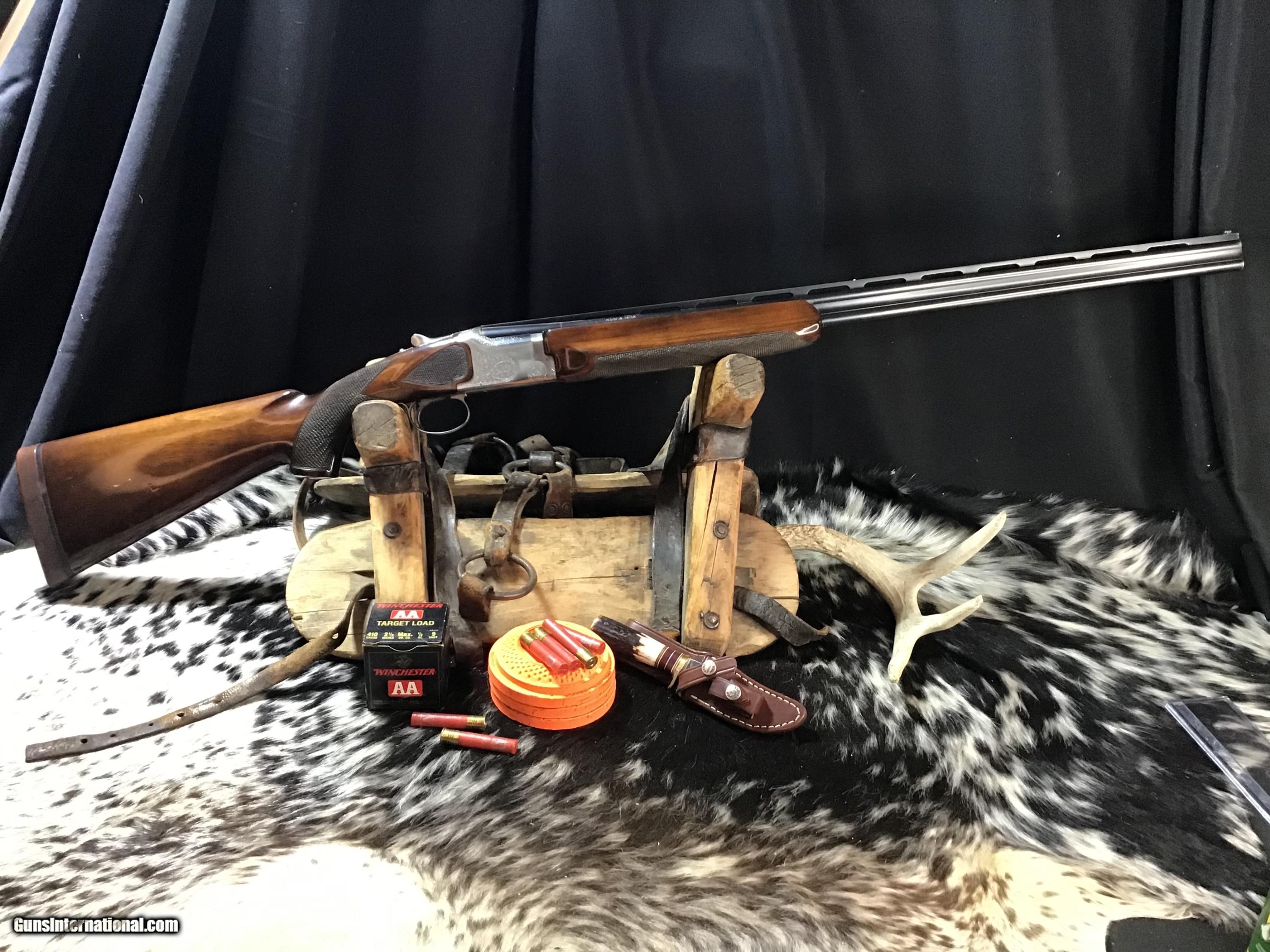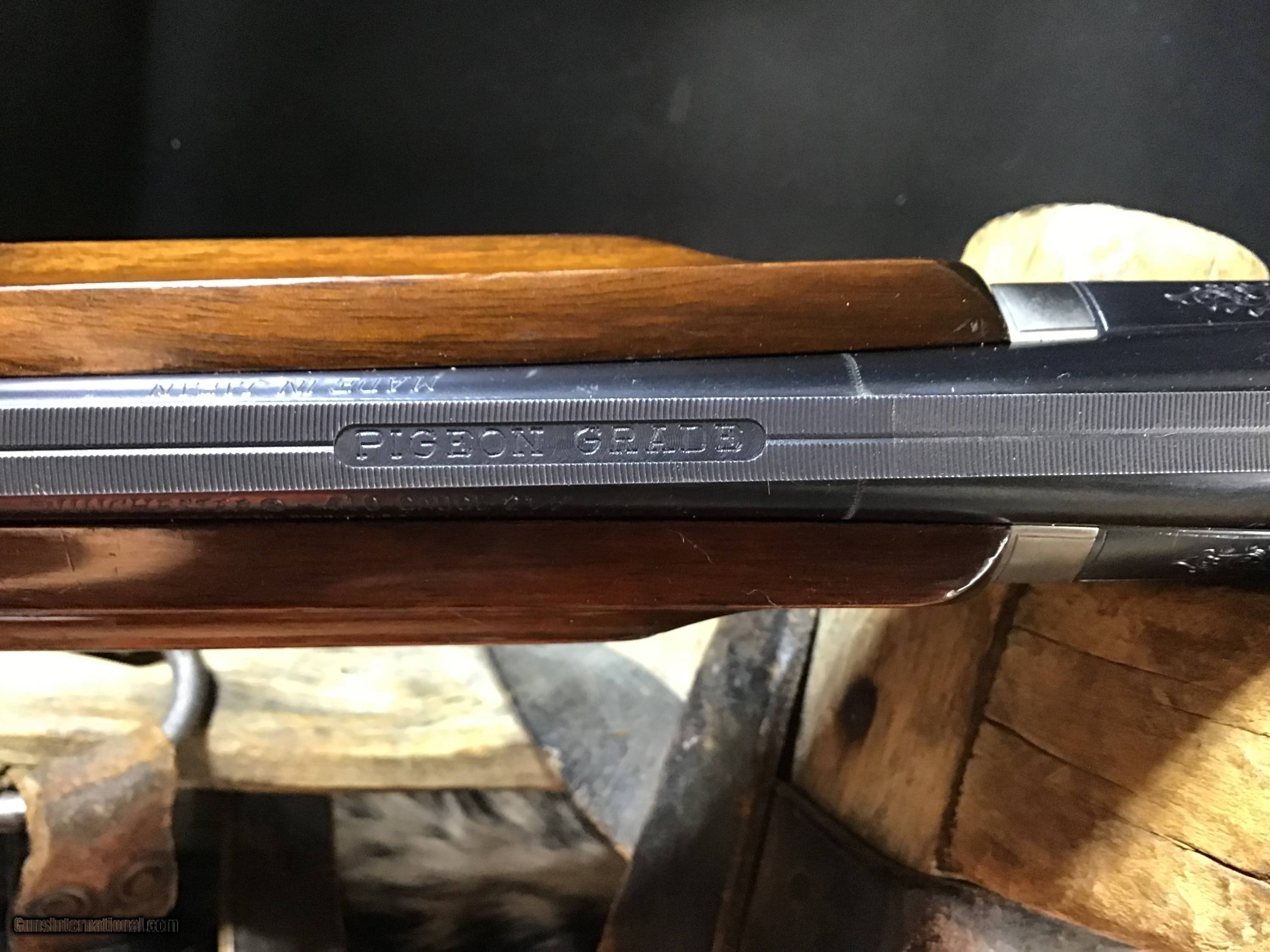 A scarce fun to shoot early 1970s mfg Winchester 101 Pigeon Grade O/U shotgun made by Olin in Japan. Wearing 28" blued barrels, skeet fixed chokes, scroll engraved receiver with Pigeon on bottom. Walnut furniture and rubber butt pad. Great overall condition and just a lot of fun to smash clays with. Various handling marks and thinning of blued finish in some spots. Nickel finished receiver for long wear. If you need to be humbled once in a while shoot a few rounds with .410 to make it happen.